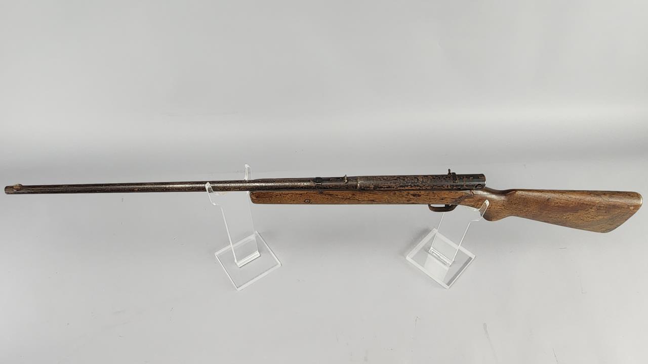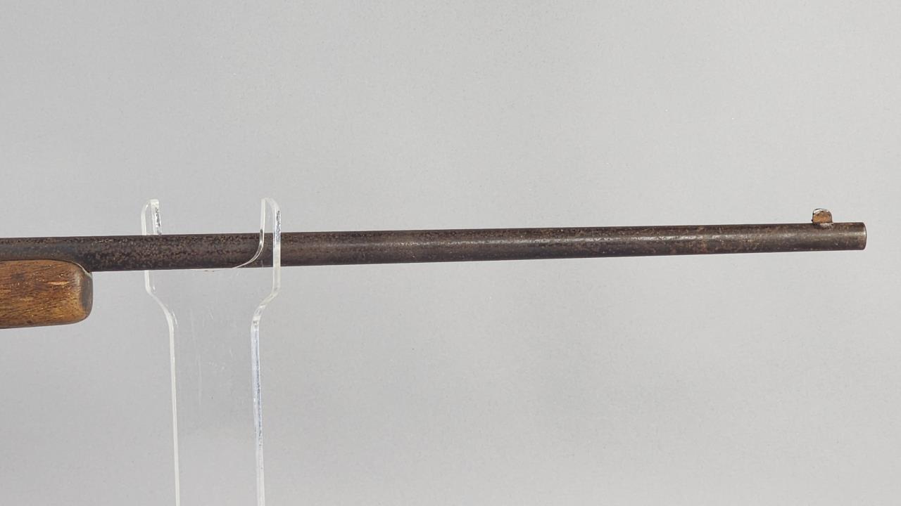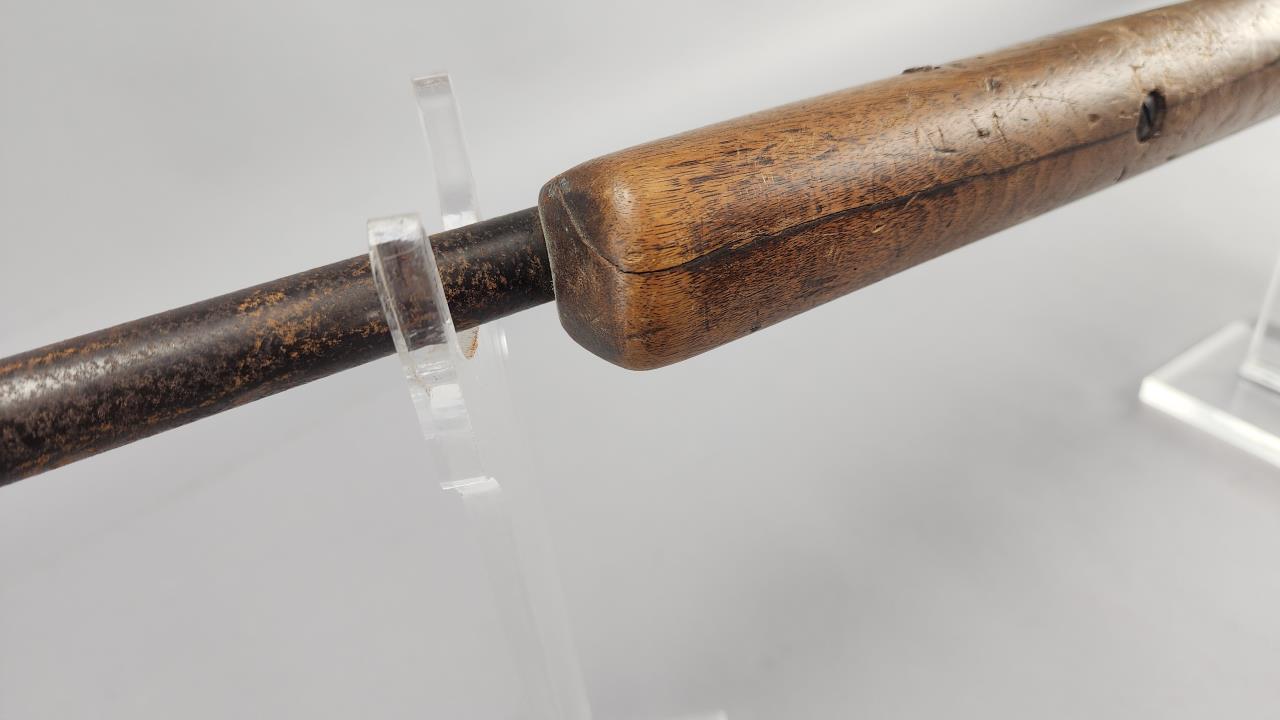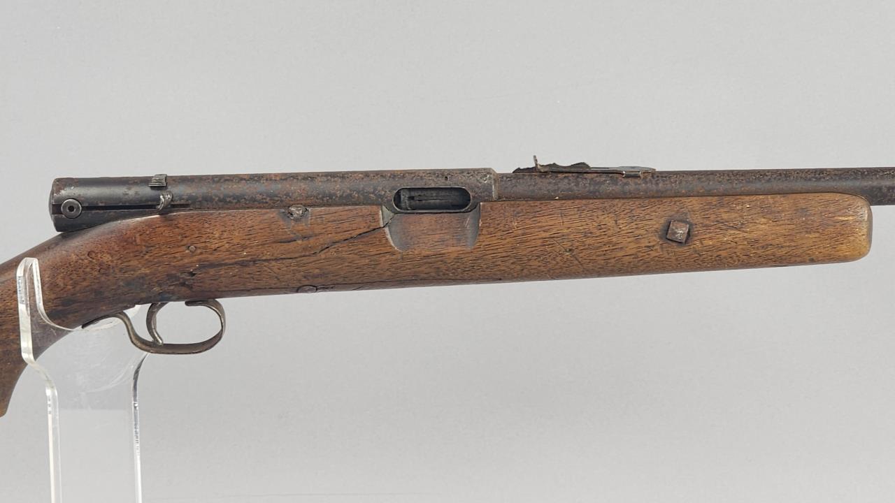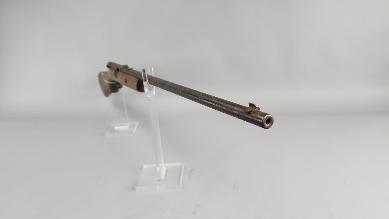 CONDITION: This rifle shows extensive surface wear. The metal components display significant patina and rust throughout. The wooden stock exhibits multiple large cracks, scratches, and wear consistent with long-term use and age. The stock’s buttplate appears worn but intact. The bore is described as darkening with intact rifling but no patina, according to provided notes. The action is reported as non-functional and does not open. This firearm has notable wear and structural compromises, requiring attention for restoration or repair.