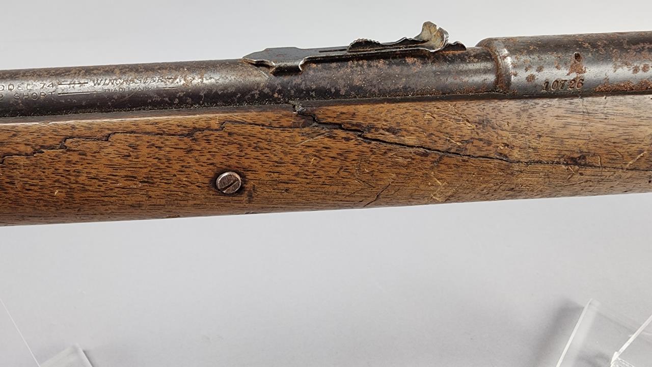 Winchester Model 74, chambered in .22 LR, semi-automatic rifle with a 24-inch barrel and a full-length wooden stock. The receiver bears the serial number 10726. It has a tubular magazine integrated into the stock, rear foldable sight, and a fixed front sight. Additionally, the barrel is marked with the designation “Model 74 Winchester Trademark .22 Short” and manufacturing details confirming it as a product of the Winchester Repeating Arms Company.