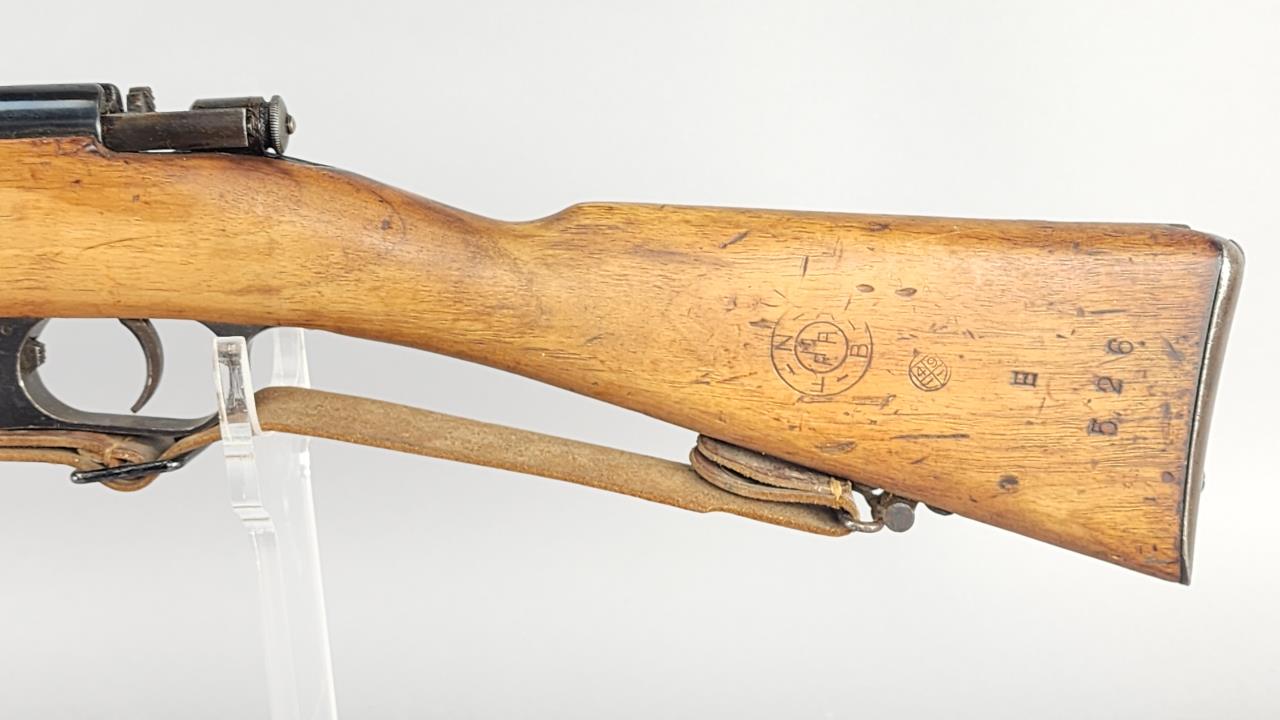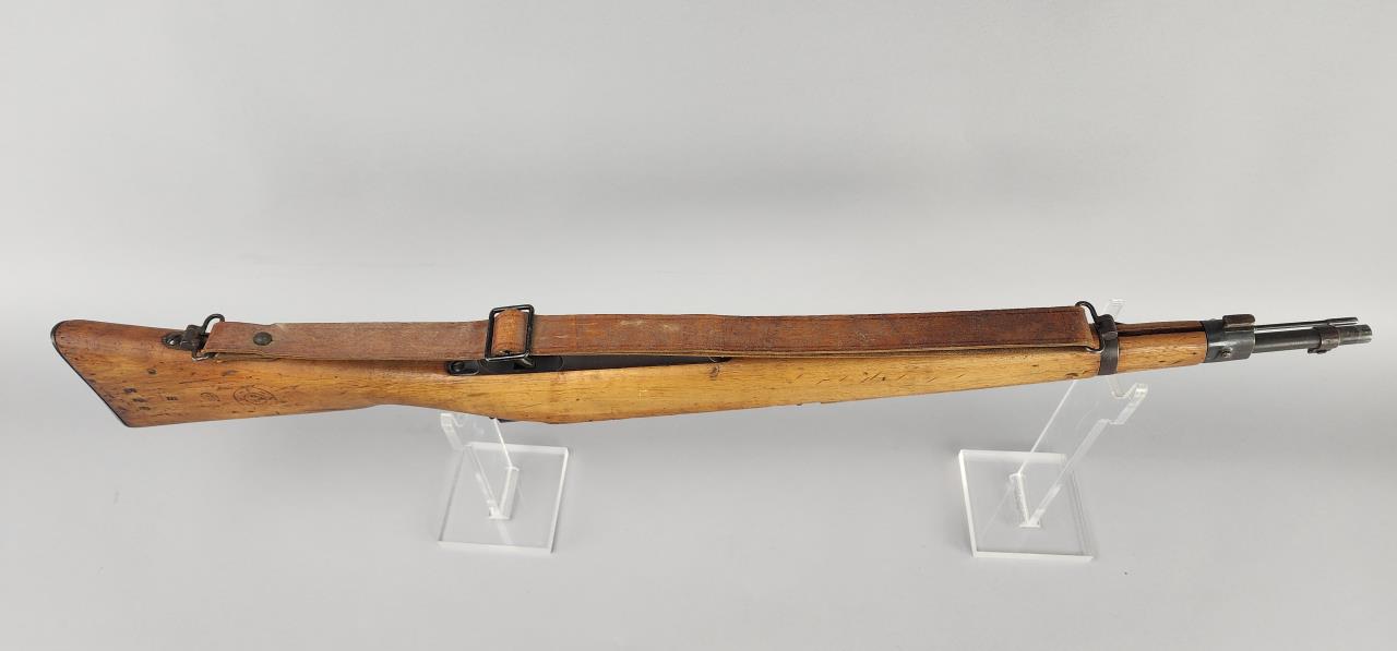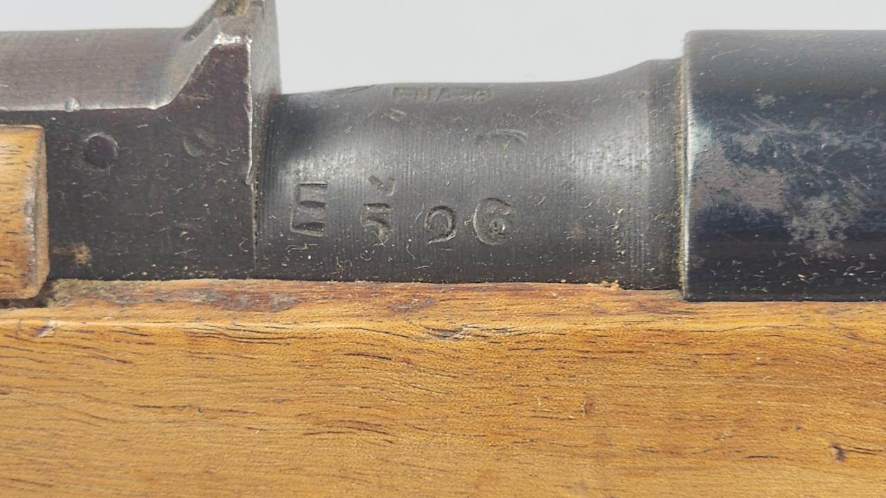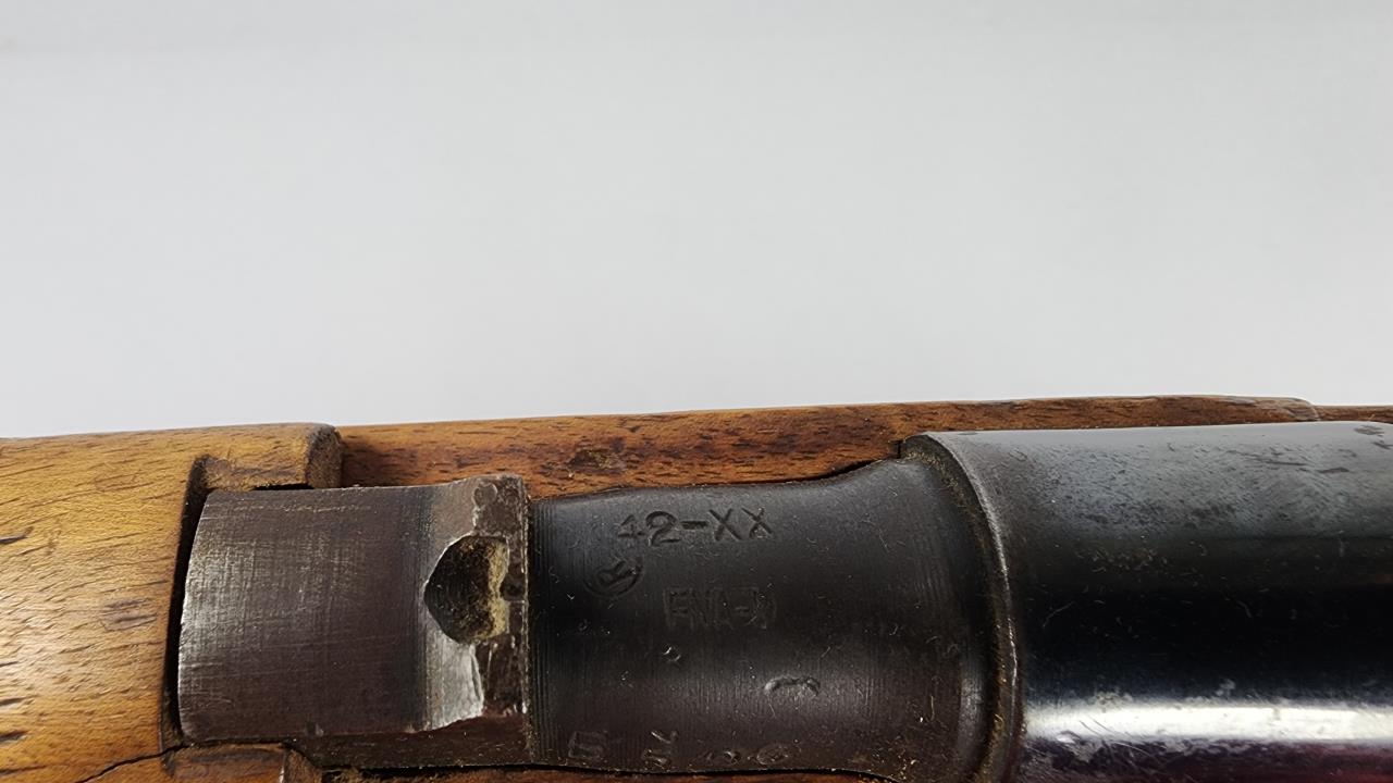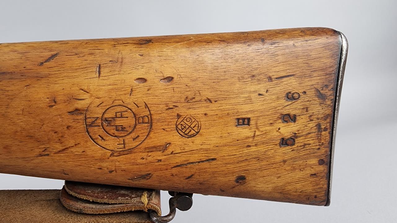 CONDITION: The rifle shows moderate wear throughout, consistent with military use. The stock exhibits numerous scratches, dents, and wear marks, with noticeable handling wear near the wrist and butt. Arsenal markings remain clear and legible. The metal components show finish loss, patina, and areas of oxidation, particularly on the barrel and receiver. The action cycles smoothly, and no mechanical issues are evident from external inspection. The bore presents visible fouling with visible signs of previous use, requiring a detailed cleaning and inspection. The leather sling exhibits age-related wear but remains intact and functional.