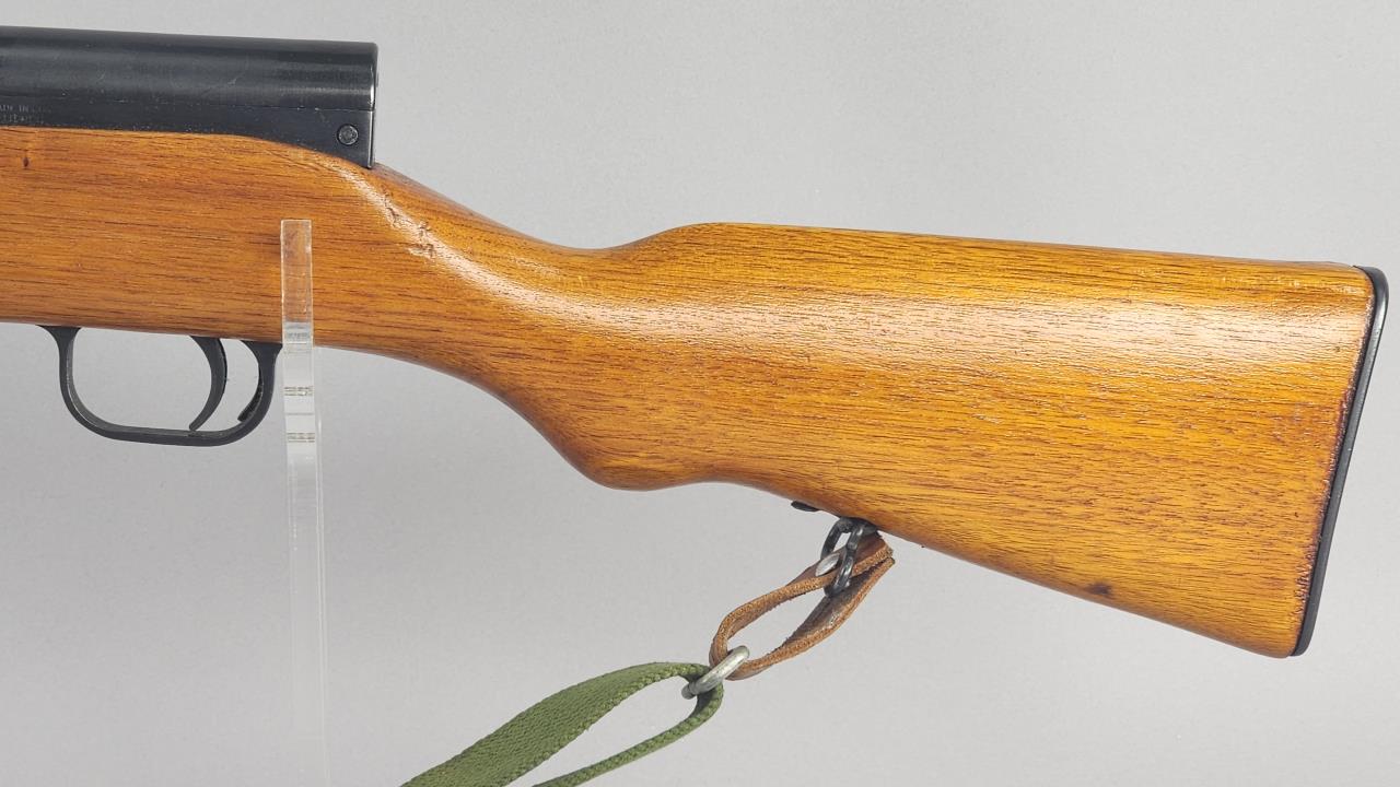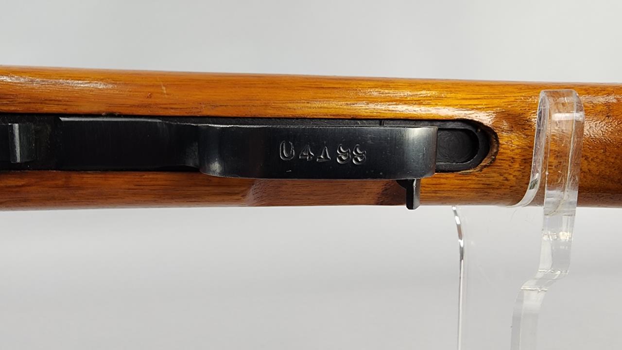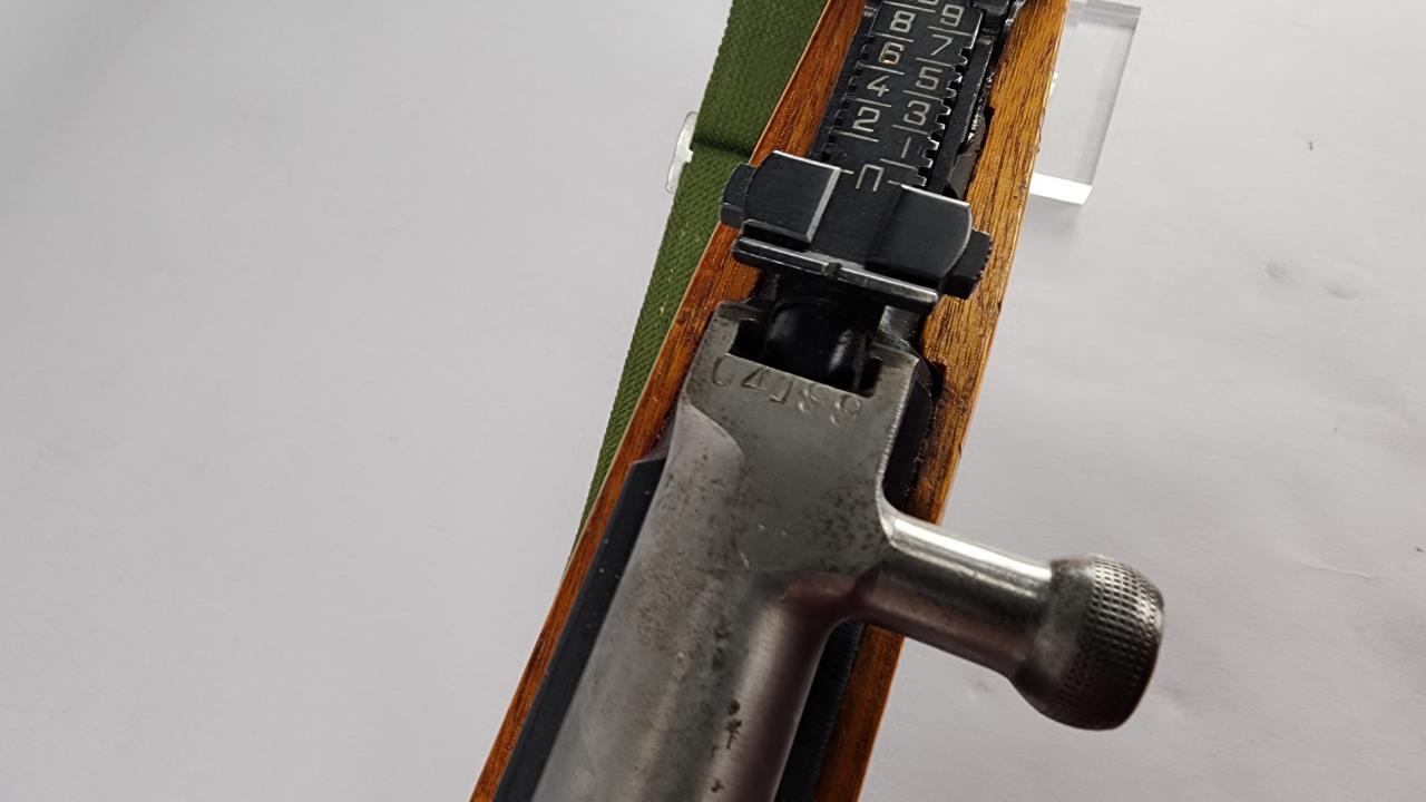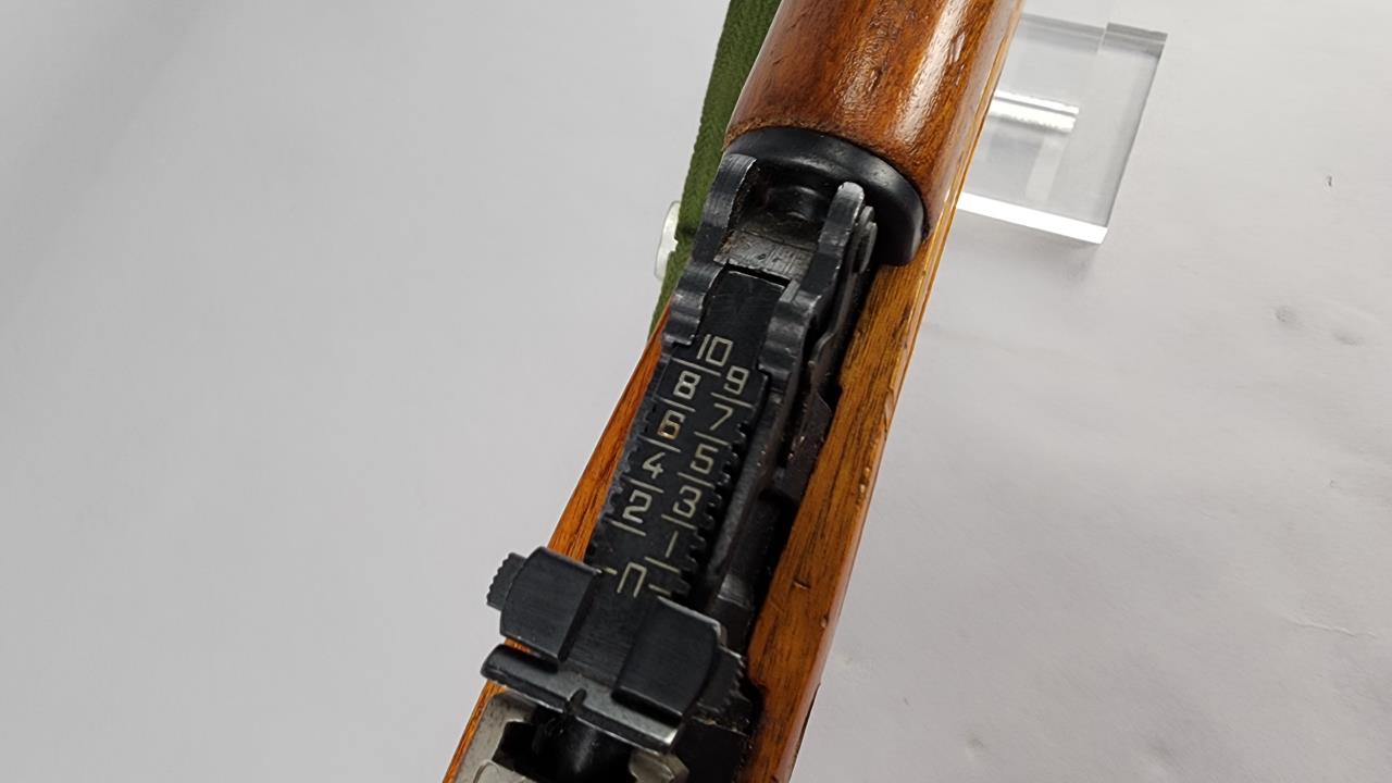 CONDITION: The wood stock shows minor handling marks and some small scratches but remains structurally sound. The blued steel exhibits light wear with no significant rust or pitting visible in the photos. The bolt displays minor surface wear consistent with use. The bayonet is in very good condition, with no visible damage to the blade. The green canvas sling shows signs of wear but is intact and fully functional. Action appears functional upon visual inspection. Bore condition cannot be fully assessed from photos provided.