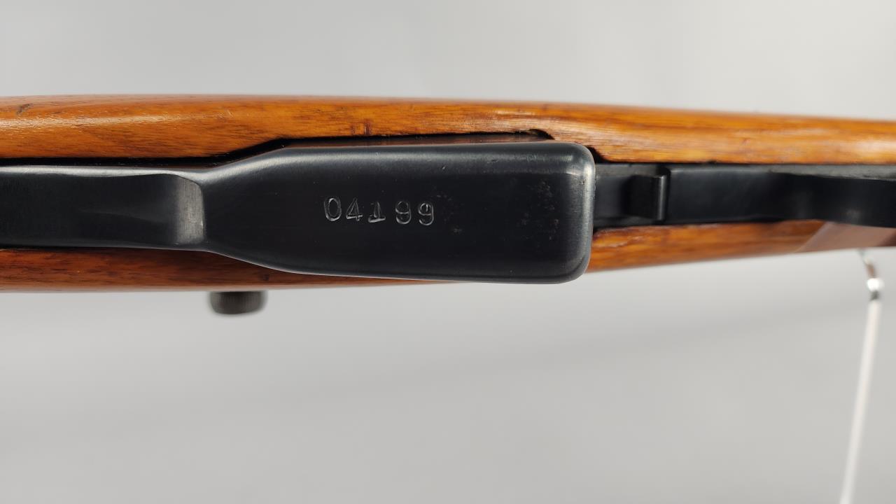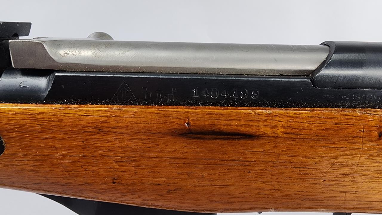 Chinese SKS semi-automatic rifle chambered in 7.62x39mm, serial number 1404199. This rifle features a 16.5-inch barrel and an overall length of approximately 36 inches. The receiver is marked with ‘SKS 62 MADE IN CHINA,’ attributed to Chinese production. The stock is constructed of wood, with a smooth finish, and the rifle includes an integrated folding bayonet. The rear sight is adjustable, calibrated up to 10. The finish is a combination of blued steel and stainless steel components, as observed on the bolt. Additionally, the rifle is equipped with a green canvas sling. Background check required for purchase. No shipping restrictions apply.