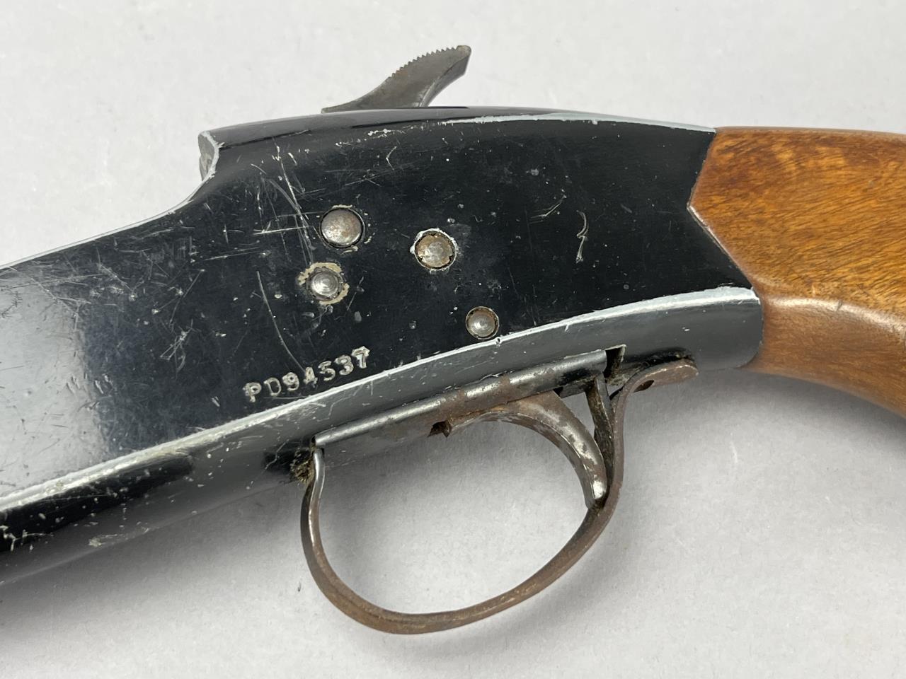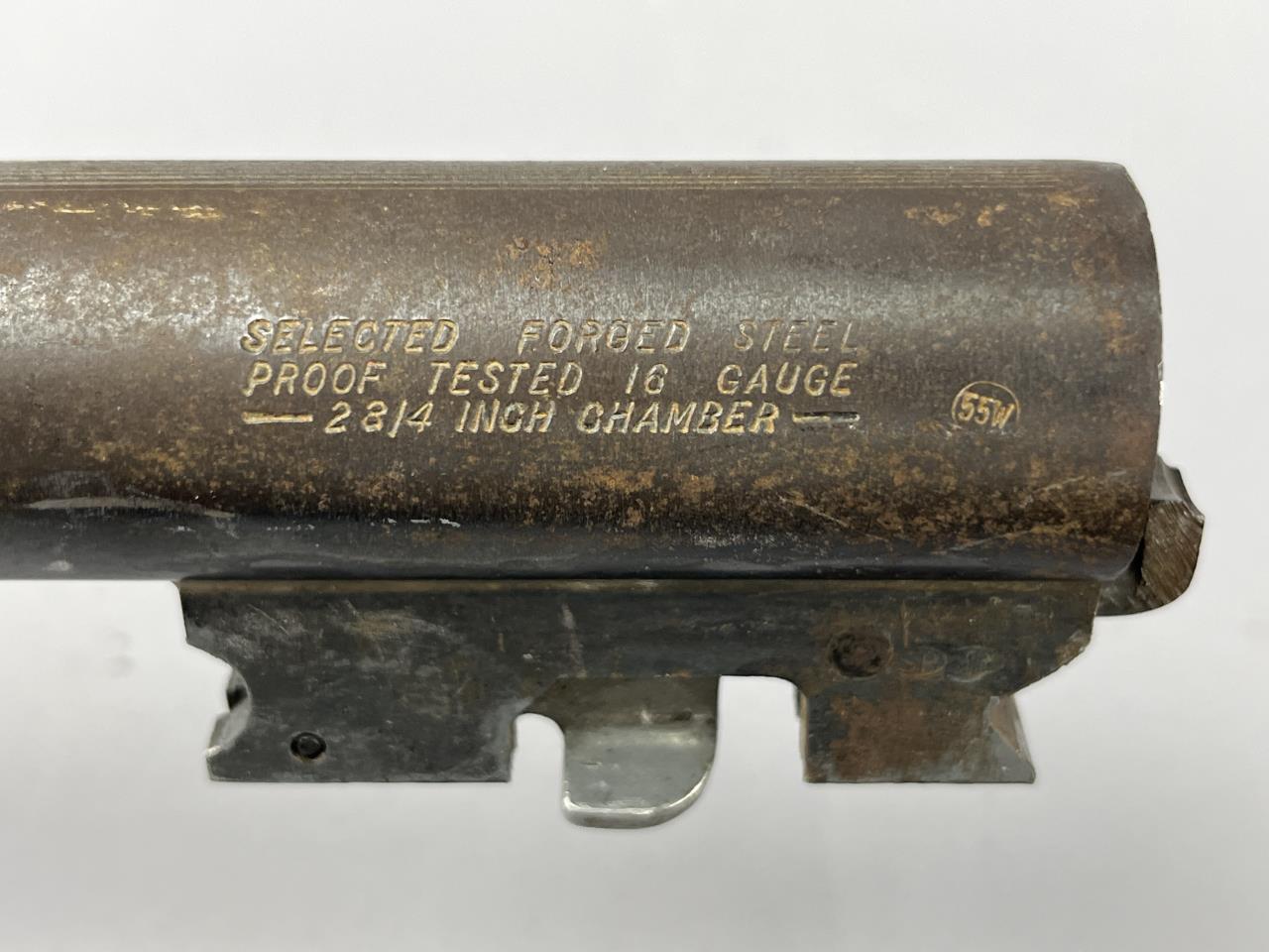 CONDITION: The shotgun is in fair overall condition. The barrel and receiver display significant finish loss, light surface rust, and scattered scratches, consistent with age and handling. The wooden stock and forearm exhibit moderate handling marks, scratches, and finish wear but do not show any visible cracks or extensive damage. The barrel does not latch securely onto the receiver, requiring repair for full functionality. Further inspection is recommended to assess the mechanical condition of the firearm.