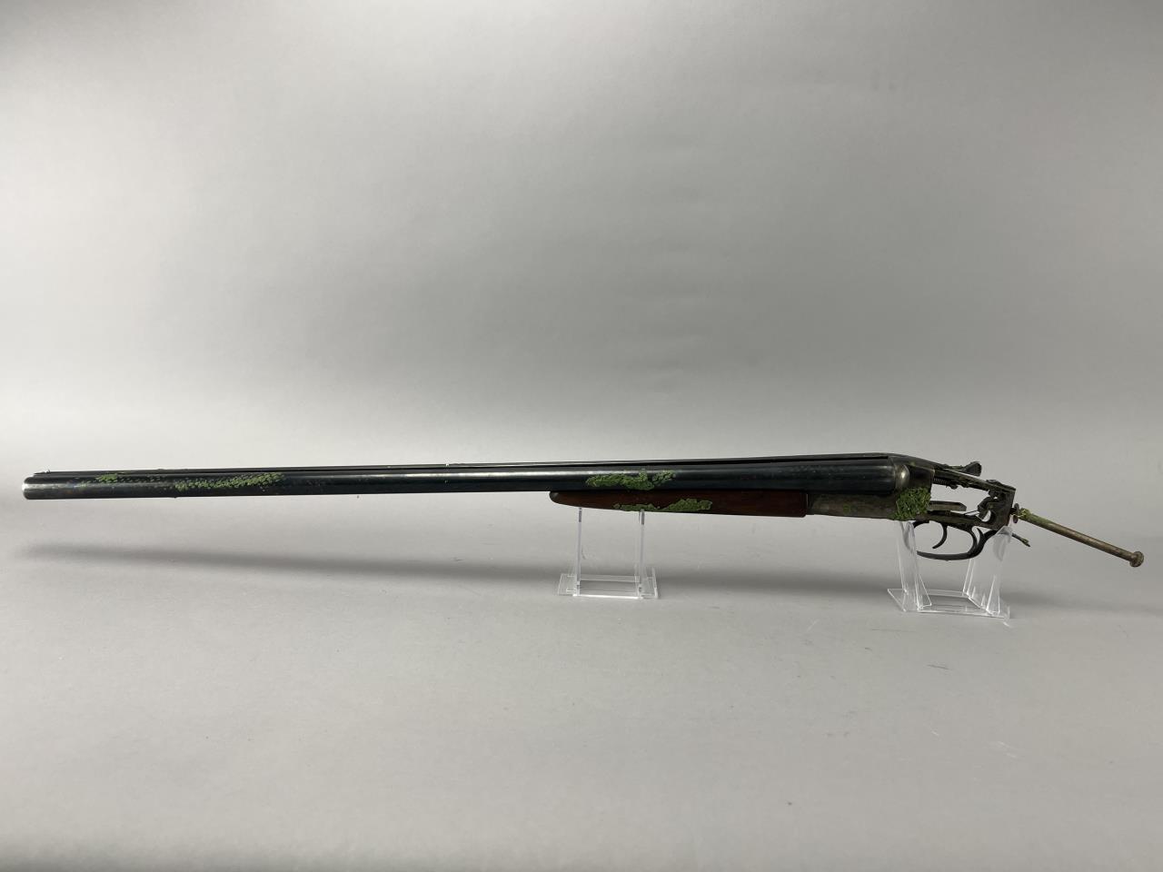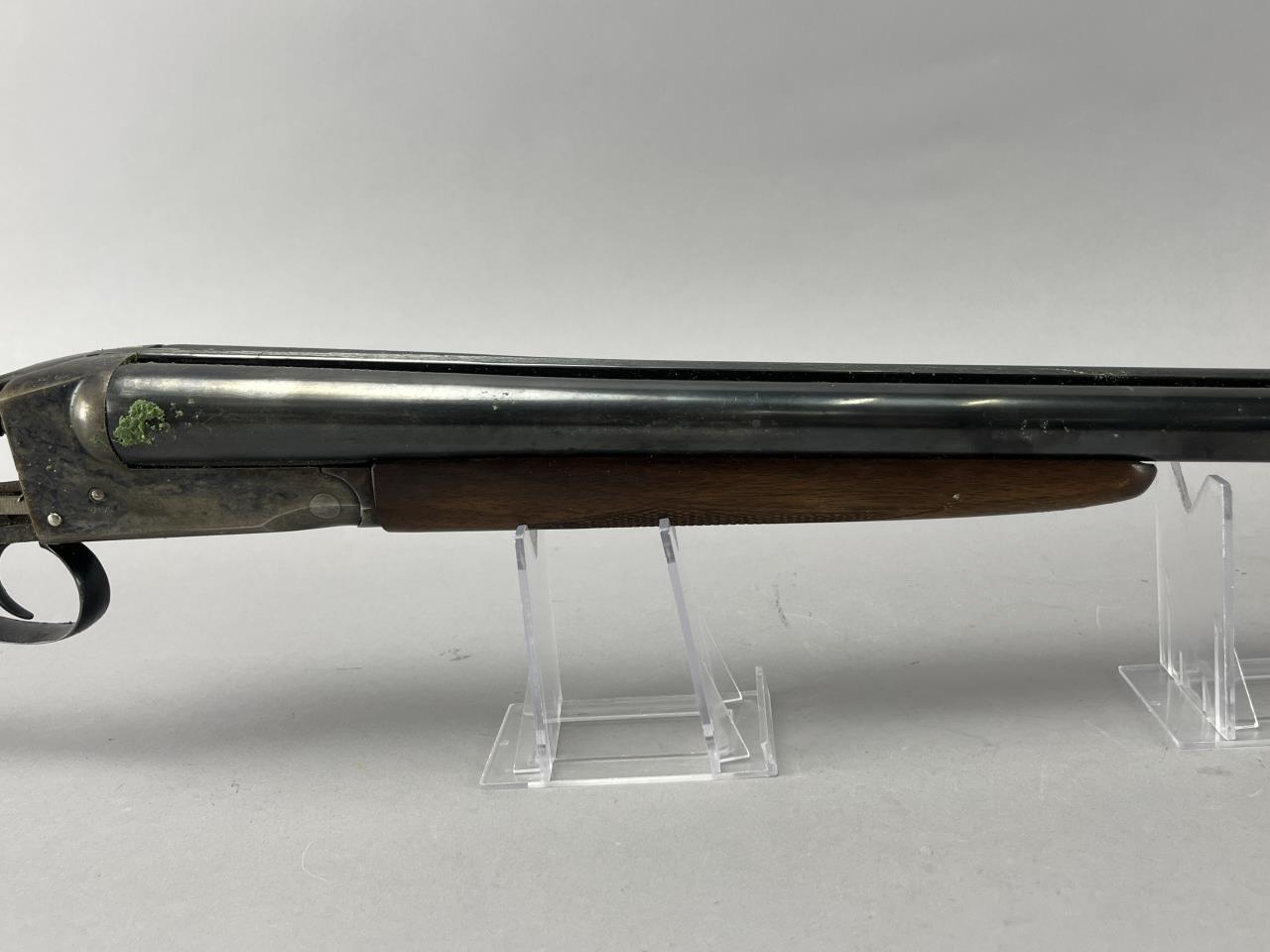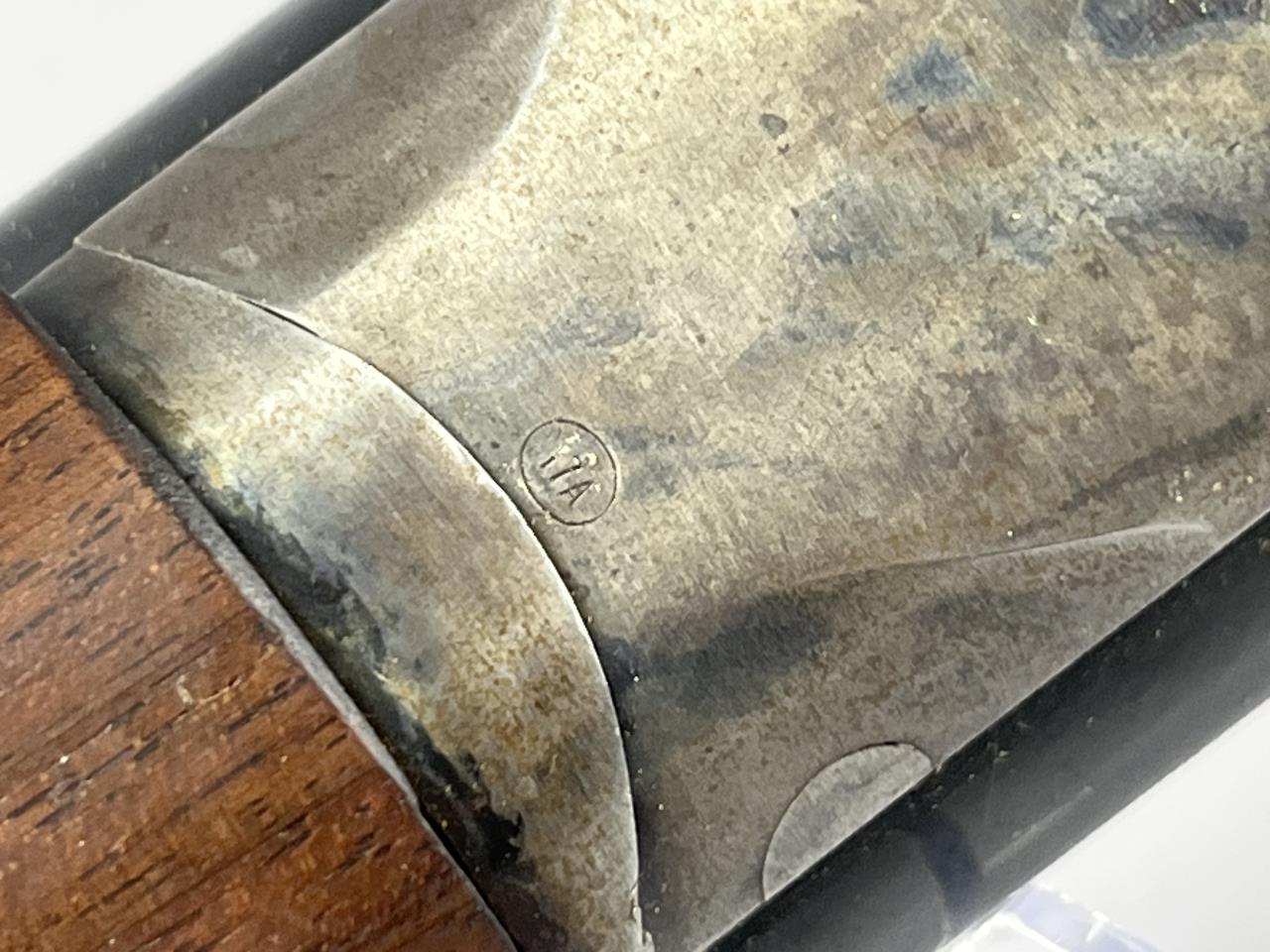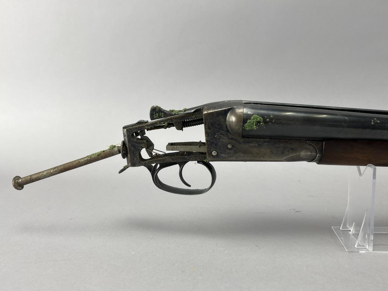 CONDITION: Overall, the firearm shows significant wear and damage. There is noticeable rust and green corrosion throughout, particularly on the exposed metal parts and the action. The blued finish on the barrels shows heavy wear, with scratches and scattered areas of visible corrosion. The forearm appears intact but shows scratches, dings, and some wear consistent with age and use. The absence of the buttstock renders this firearm incomplete. The operational status of the action and the condition of the bores could not be verified from the images provided.