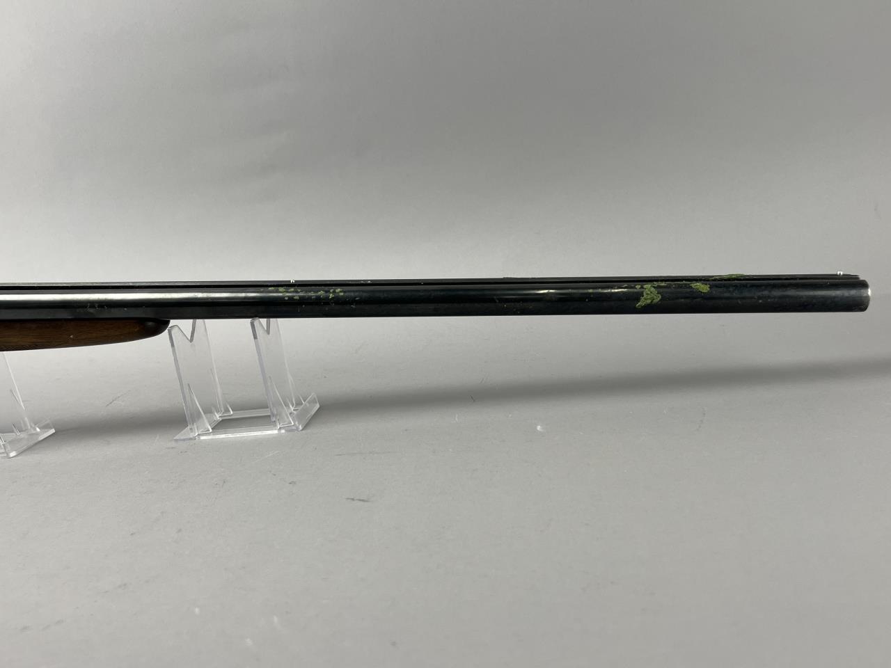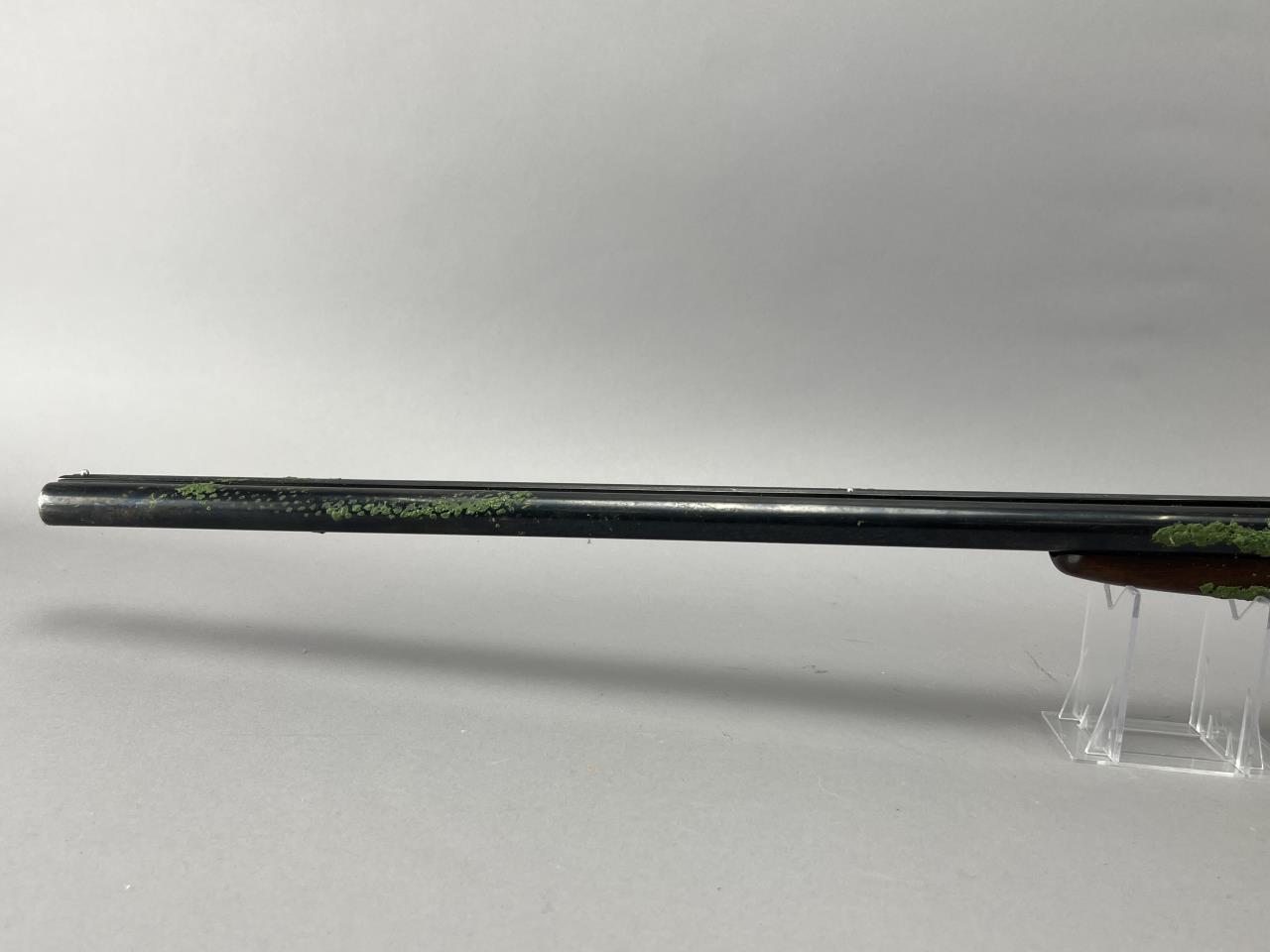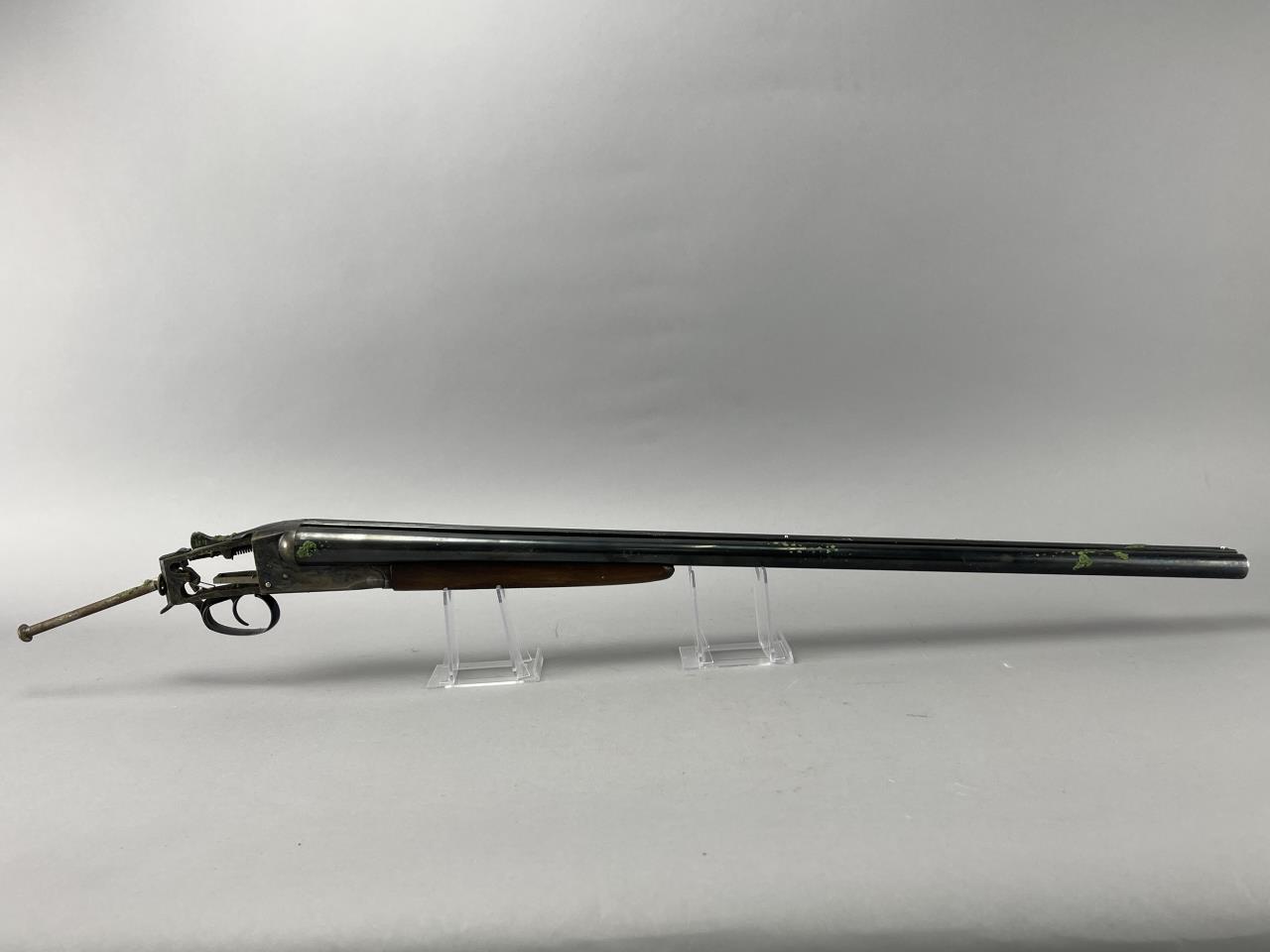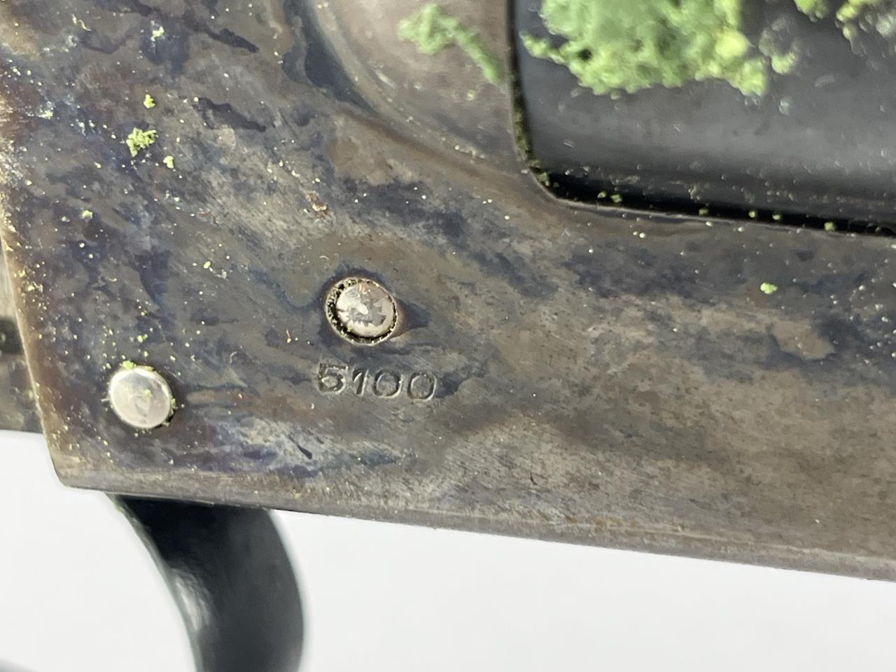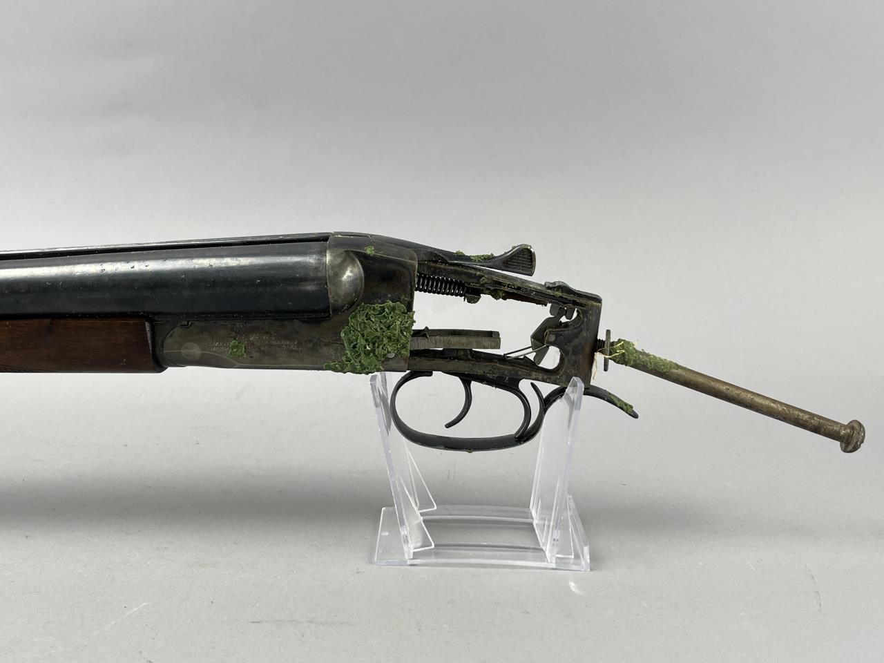 CONDITION: Overall, the firearm shows significant wear and damage. There is noticeable rust and green corrosion throughout, particularly on the exposed metal parts and the action. The blued finish on the barrels shows heavy wear, with scratches and scattered areas of visible corrosion. The forearm appears intact but shows scratches, dings, and some wear consistent with age and use. The absence of the buttstock renders this firearm incomplete. The operational status of the action and the condition of the bores could not be verified from the images provided.