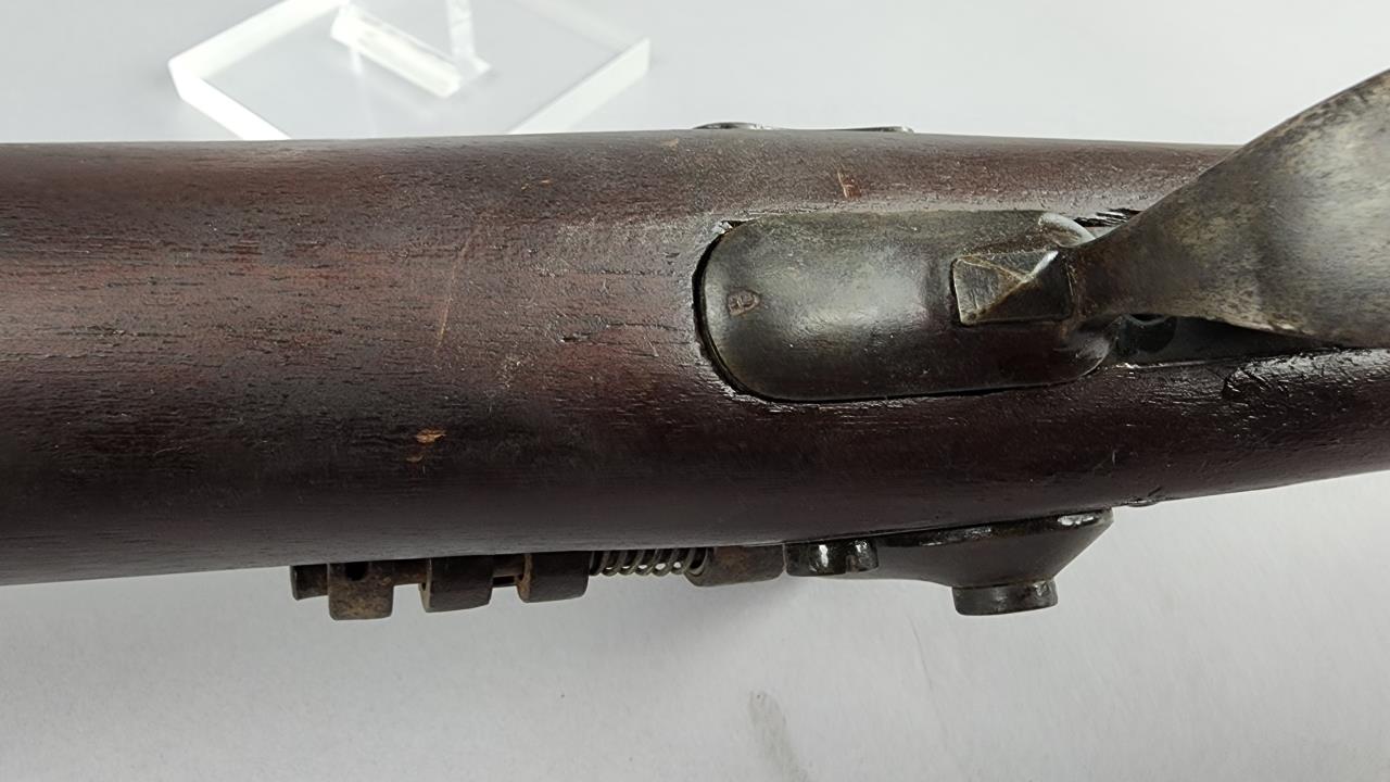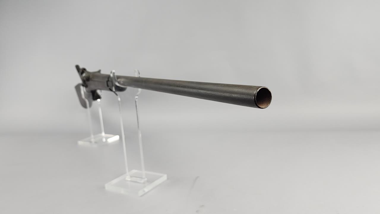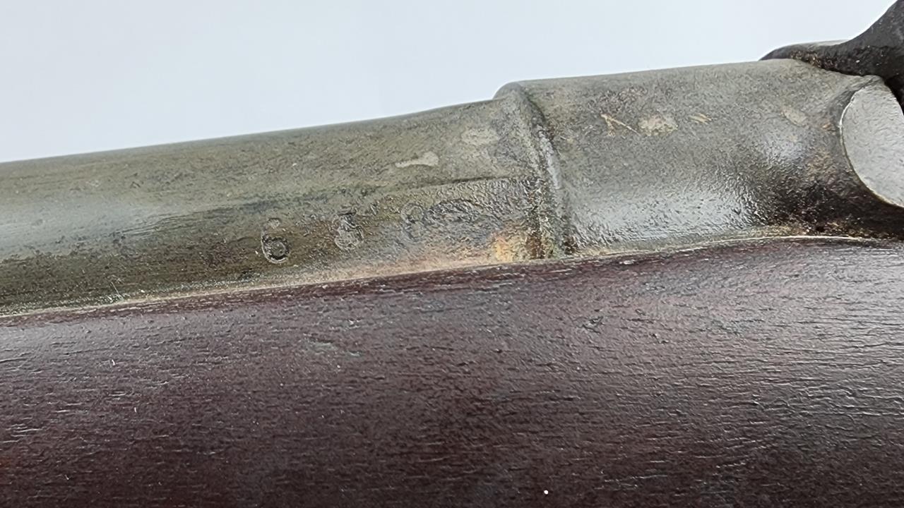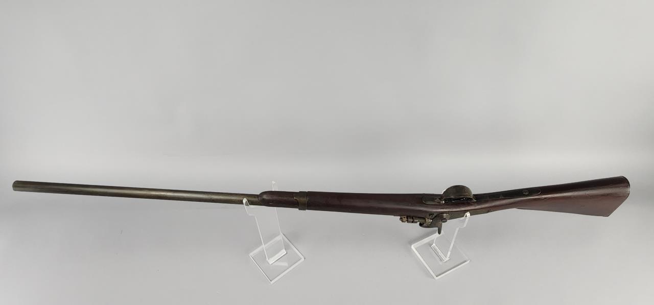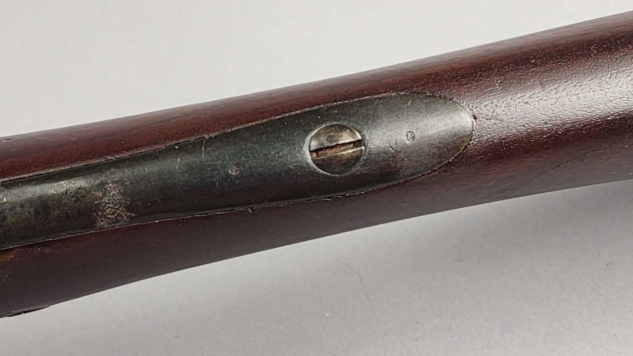 CONDITION: This French Model 1857 shotgun shows wear consistent with its age and period. The wood stock exhibits scratches, dings, and areas of wear. There are signs of surface oxidation and finish loss throughout the metal components, most notably on the barrel and receiver. The action functions mechanically, though it has not been tested with live ammunition. The bore shows some oxidation, with signs of fouling and wear. Overall, this firearm exhibits its age but remains in serviceable condition.