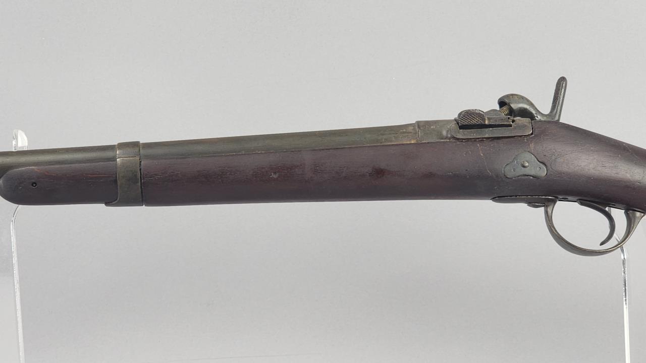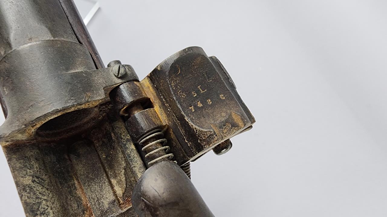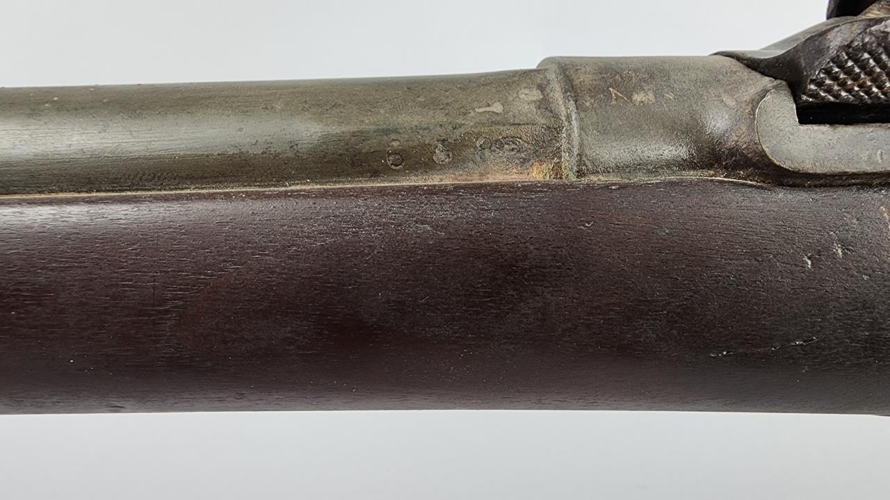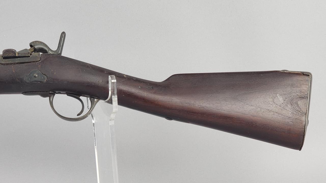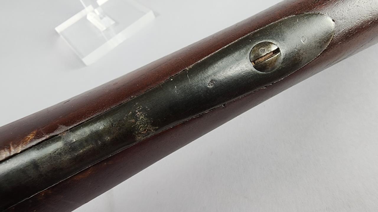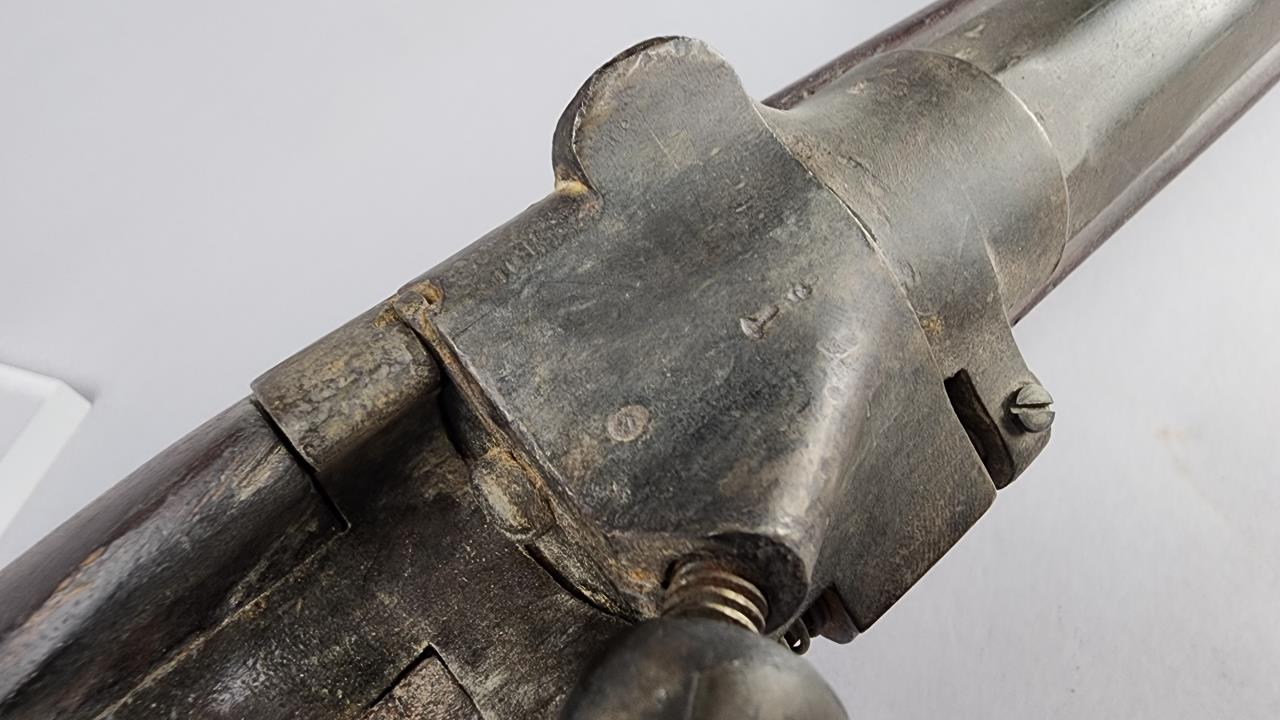 CONDITION: This French Model 1857 shotgun shows wear consistent with its age and period. The wood stock exhibits scratches, dings, and areas of wear. There are signs of surface oxidation and finish loss throughout the metal components, most notably on the barrel and receiver. The action functions mechanically, though it has not been tested with live ammunition. The bore shows some oxidation, with signs of fouling and wear. Overall, this firearm exhibits its age but remains in serviceable condition.