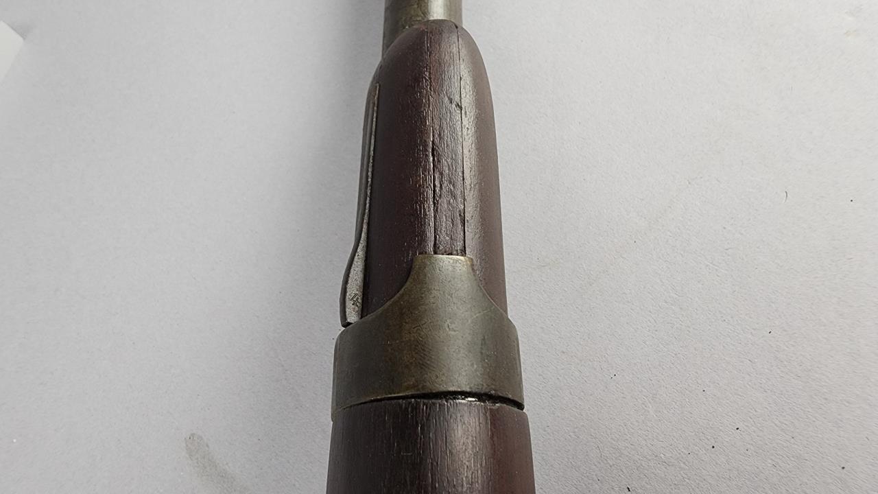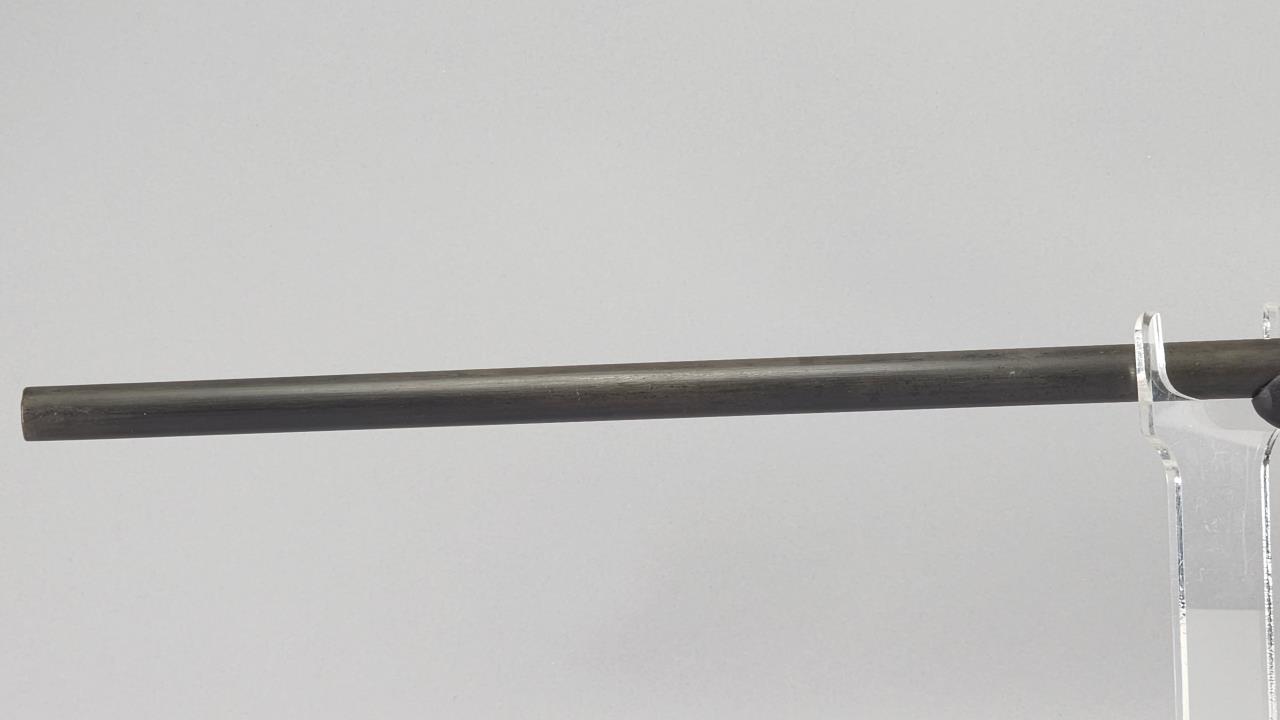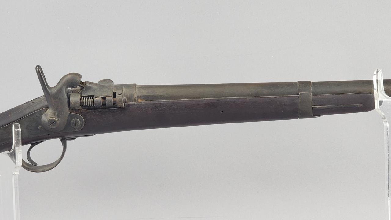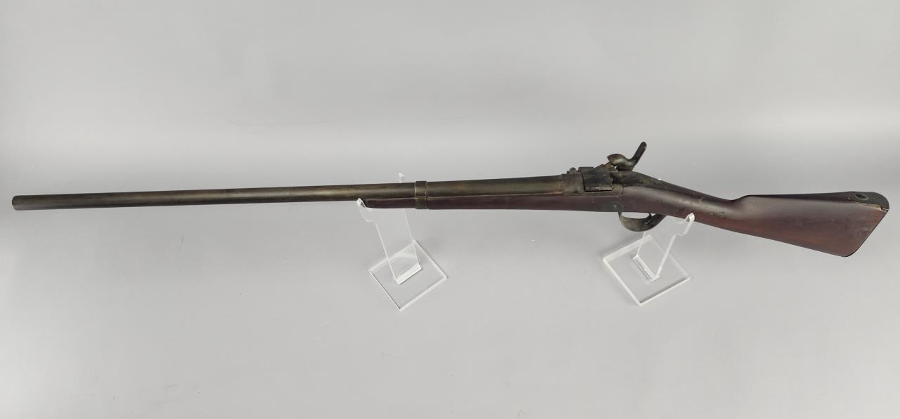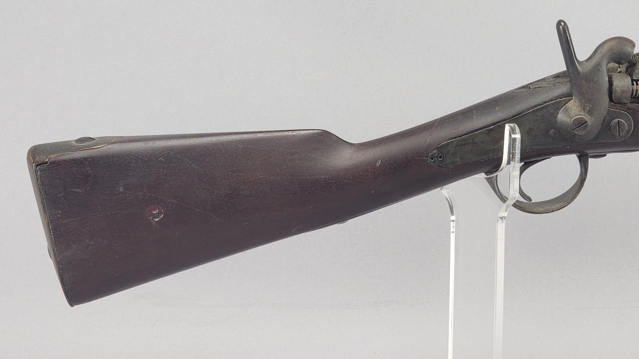CONDITION: This French Model 1857 shotgun shows wear consistent with its age and period. The wood stock exhibits scratches, dings, and areas of wear. There are signs of surface oxidation and finish loss throughout the metal components, most notably on the barrel and receiver. The action functions mechanically, though it has not been tested with live ammunition. The bore shows some oxidation, with signs of fouling and wear. Overall, this firearm exhibits its age but remains in serviceable condition.