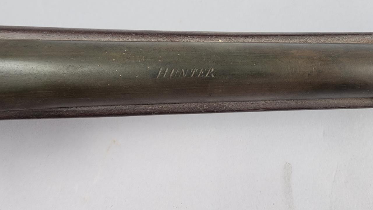 French Model 1857 12 Gauge Shotgun, serial number SL748G. This single-shot, percussion action shotgun features a 31-inch barrel and an overall length of approximately 49.25 inches. The barrel is marked ‘HUNTER,’ and the receiver exhibits standard design elements typical of the time period. The shotgun has a wood stock showing a dark finish and a smooth curved buttplate. The metal components display a dark aged patina consistent with its age and usage.