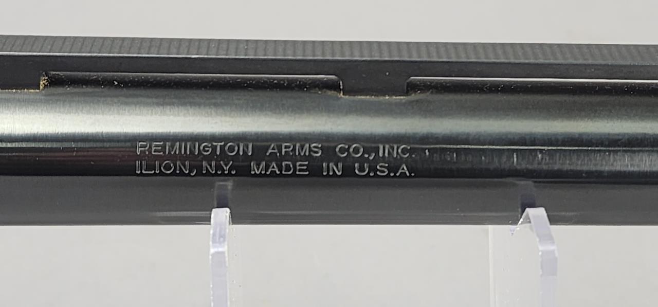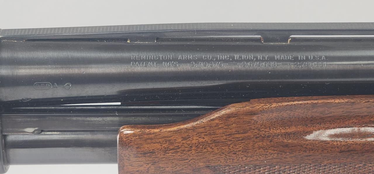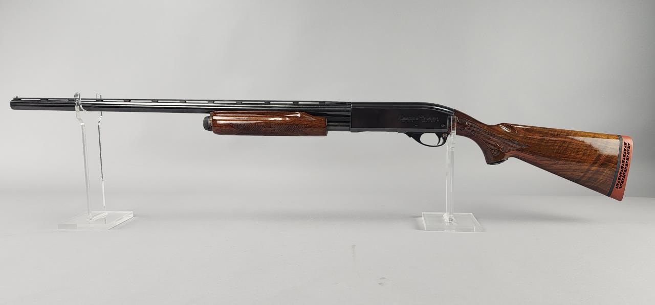 Remington Model 870 Wingmaster, 12 gauge, pump-action shotgun, serial number S003028V. Manufactured in the United States by Remington Arms Co., Ilion, NY. The firearm includes a 28-inch vent-rib barrel chambered for 2 3/4-inch shells, marked for modified choke, and features blued steel construction. Also included are an additional 28-inch vent-rib barrel and a shorter smoothbore barrel with a rifle-style front sight. The shotgun showcases a high-gloss walnut stock with distinctive checkering, a pistol grip cap with an engraved bird motif, and a matching walnut forearm. The stock terminates in a Remington-branded recoil pad. The firearm comes with a side sleeve and a soft carrying case. Requires FFL background check.