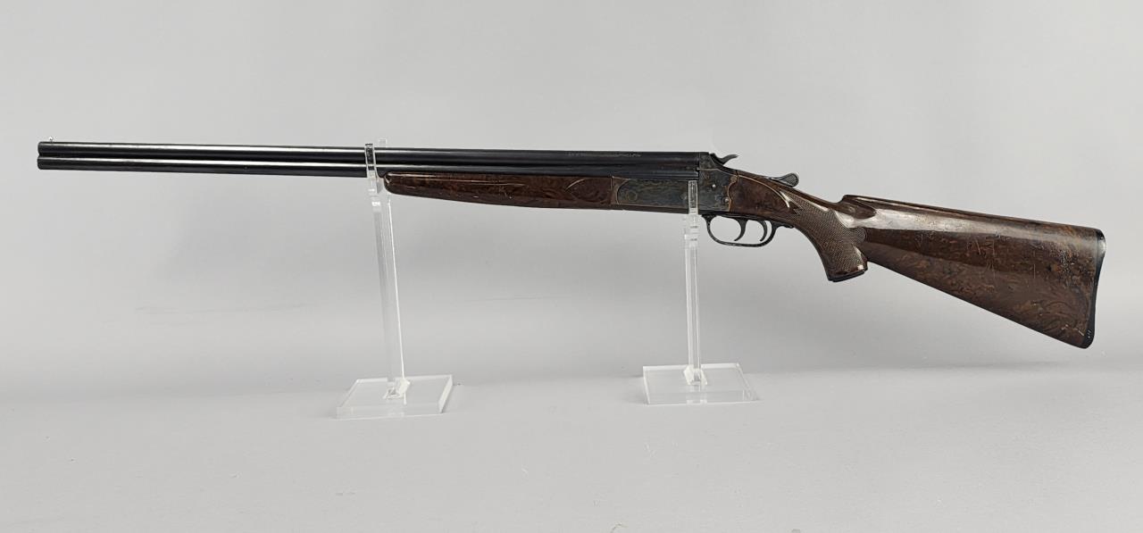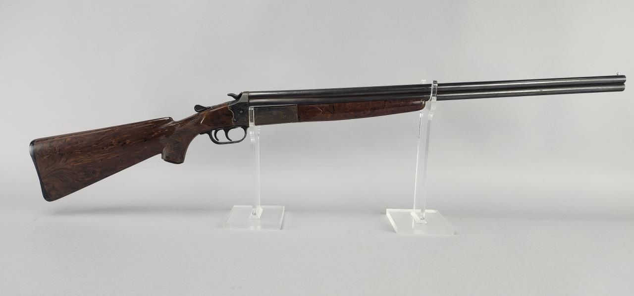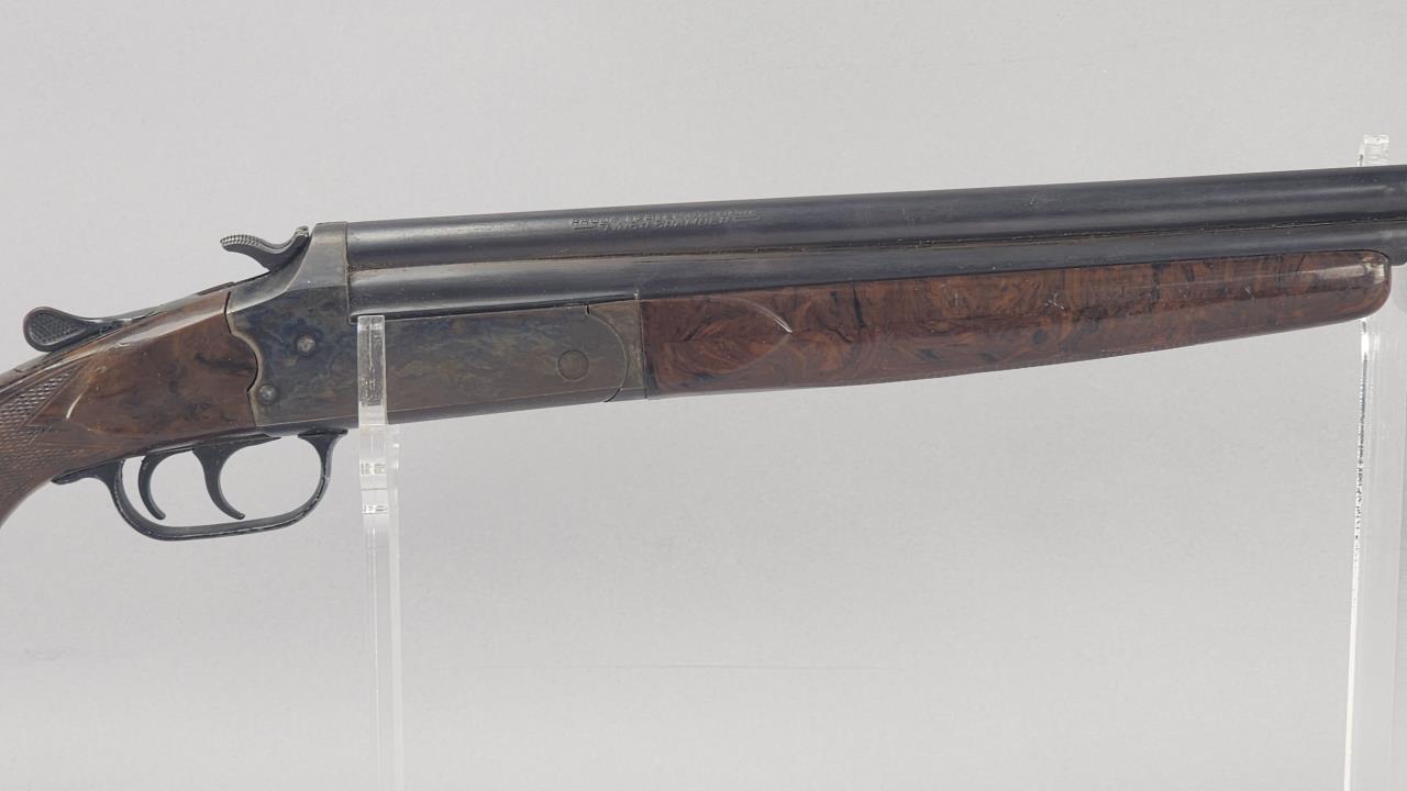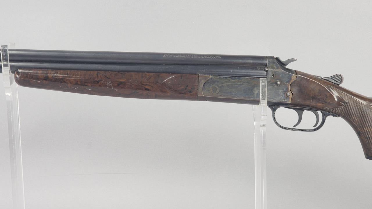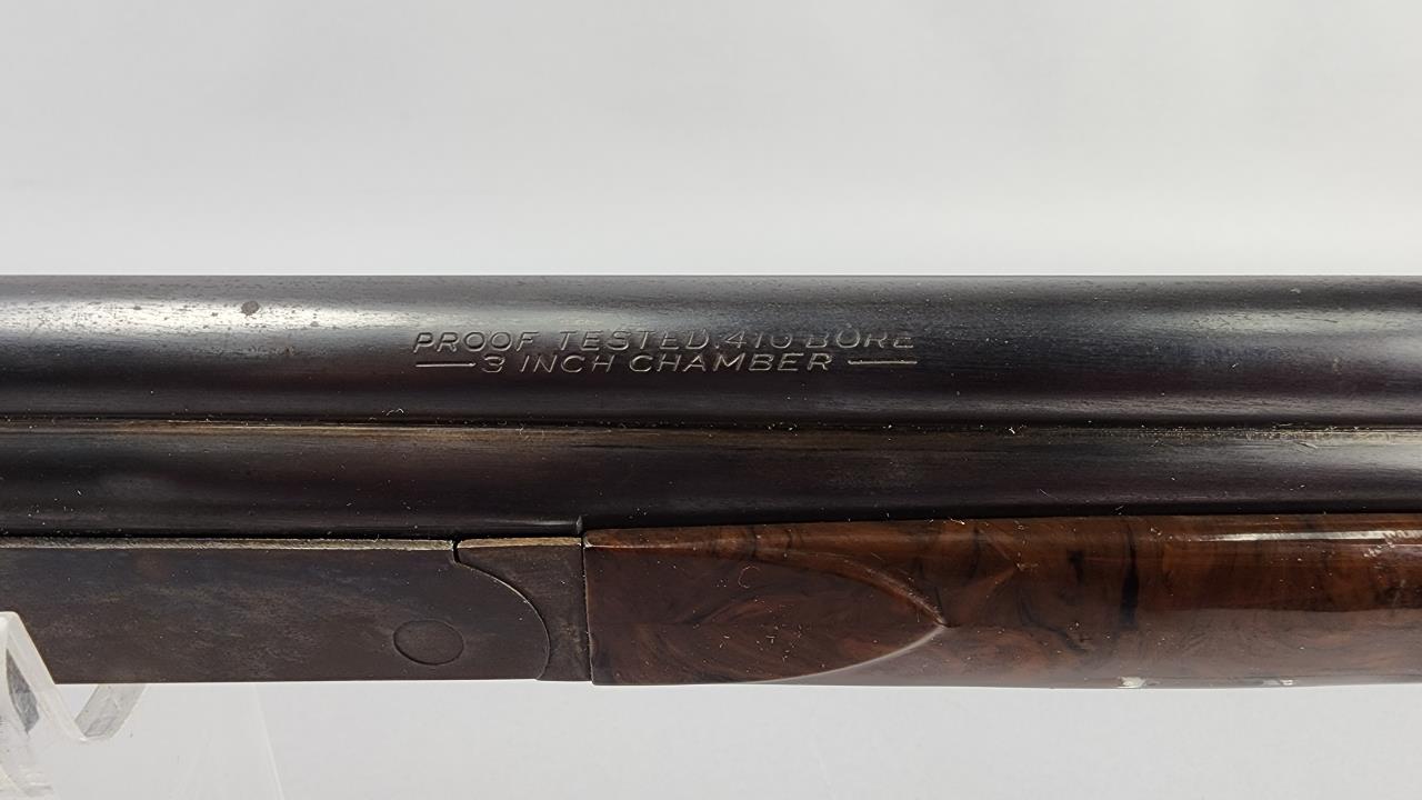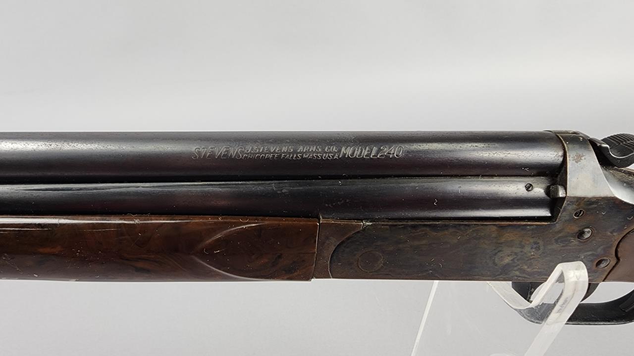 Stevens Model 240, .410 bore, over/under shotgun manufactured by J. Stevens Arms Co., Chicopee Falls, MA, USA. Features a 26-inch blued steel barrel marked ‘Proof Tested .410 Bore – 3 Inch Chamber’ suitable for modern .410 ammunition. The receiver retains its original color case-hardening finish and is equipped with dual triggers. Stock and forearm are synthetic with a wood-grain pattern and include factory checkering at the grip and forend. Serial number not provided.
