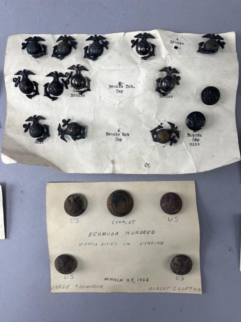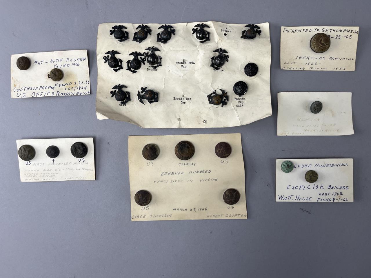 Collection of Civil War-era military insignia pins and uniform buttons, including various U.S. Marine Corps bronze eagle and globe insignia, uniform buttons from U.S. Volunteer units, and other notable artifacts. This lot includes a group of Marine Corps cap insignias with embossed eagle and globe motifs, clearly marked as bronze, and presented on an original labeled card. Additionally, several uniform buttons are mounted on cards providing contextual information concerning their historical significance, provenance, and recovery locations. Highlights include buttons associated with U.S. Mass Volunteer Militia recovered from White House (Virginia), and others linked to battles at North Anna, Bermuda Hundred, and Cedar Mountain, with recovery dates mostly noted in the 1960s. Cards offer detailed handwritten annotations describing battlefield locations, regimental origins, and specific dates of losses or recovery.