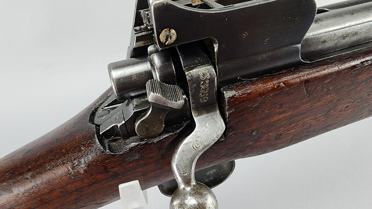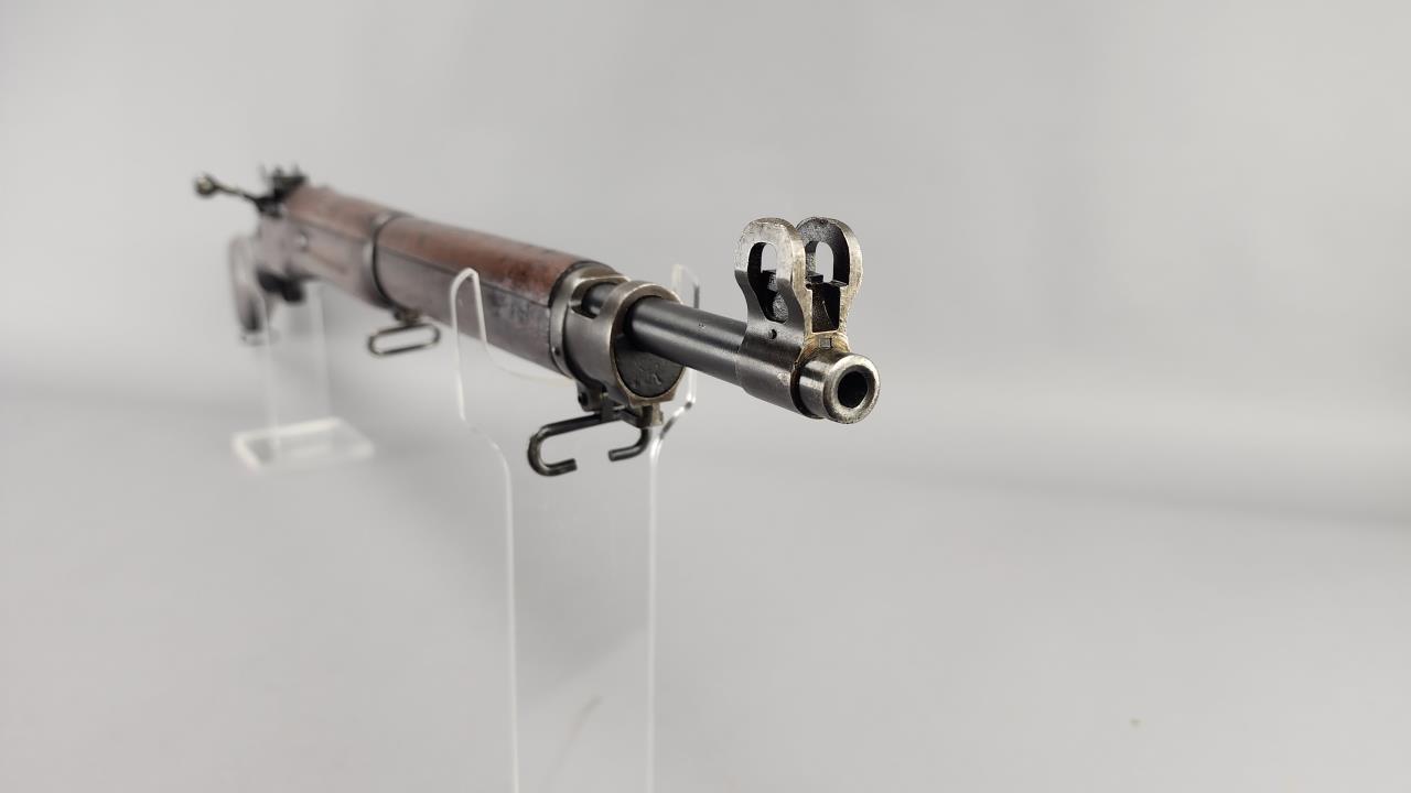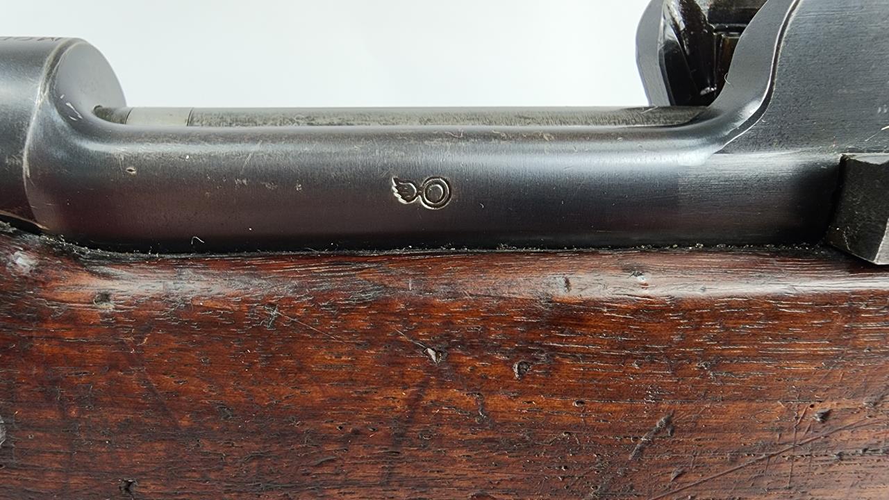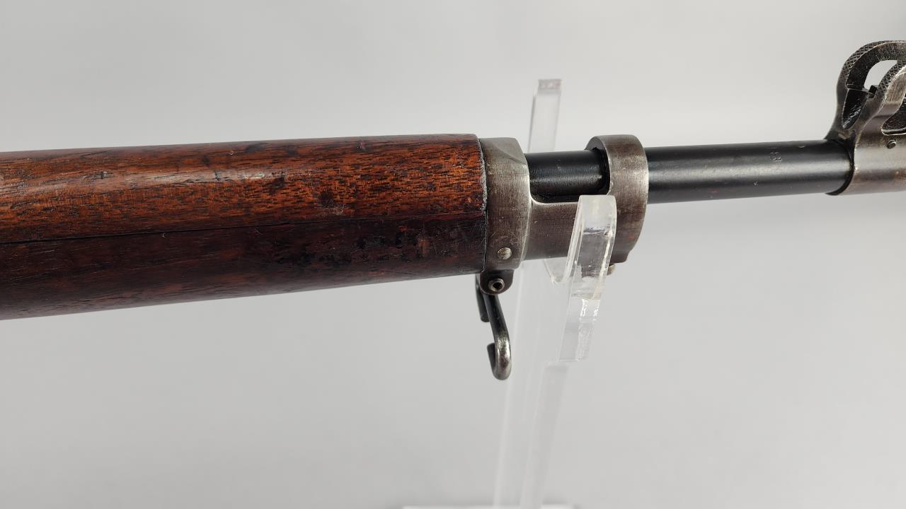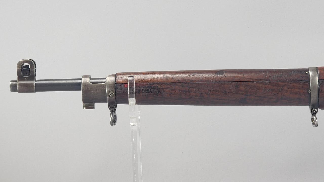 CONDITION: The firearm exhibits handling and storage wear consistent with military use. Bluing on the metal components shows thinning and scattered areas of patina. The wood stock shows wear, dents, and scratches typical of field use, with visible markings on the buttstock. The action cycles properly, and the bore is in good condition with visible rifling. Rear sight is operational. All visible components are intact, and no modifications or repairs are evident. Overall, wear is appropriate for its age and military history.