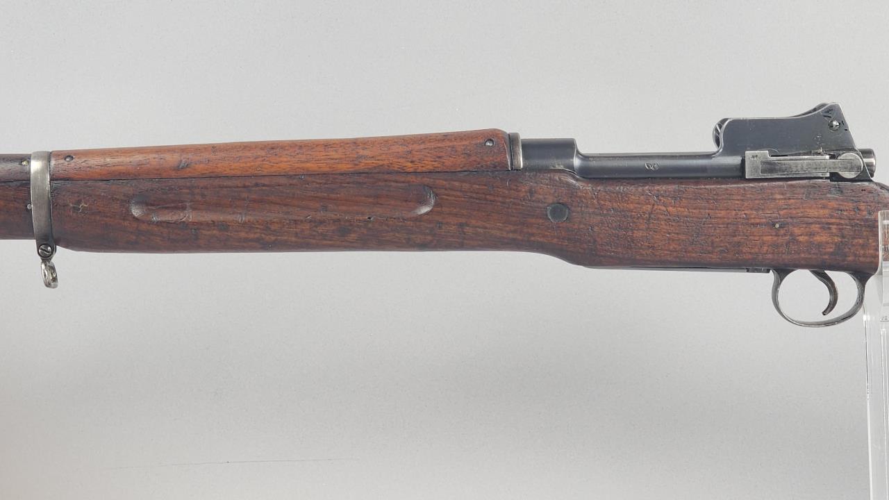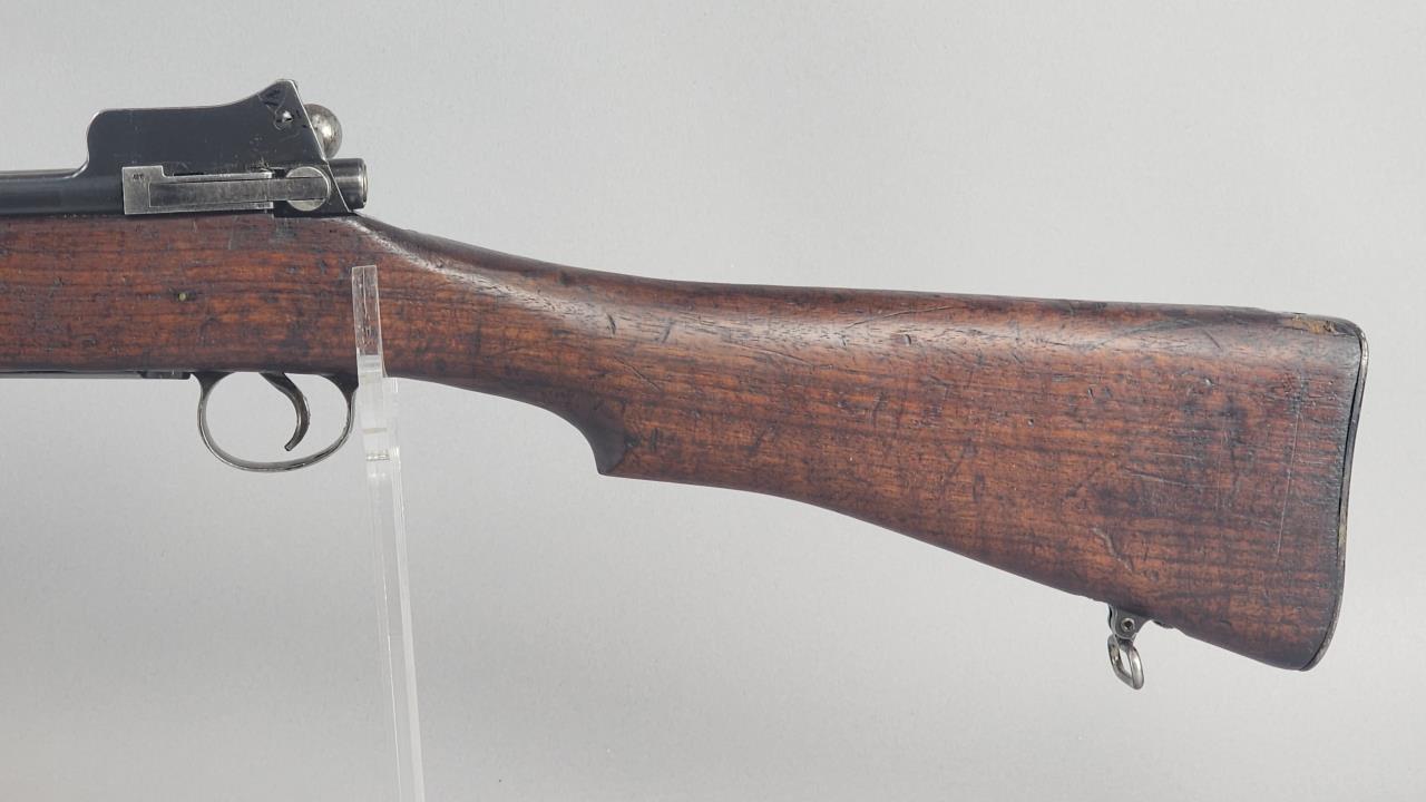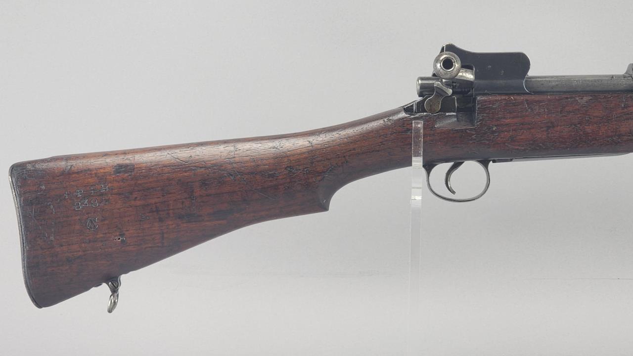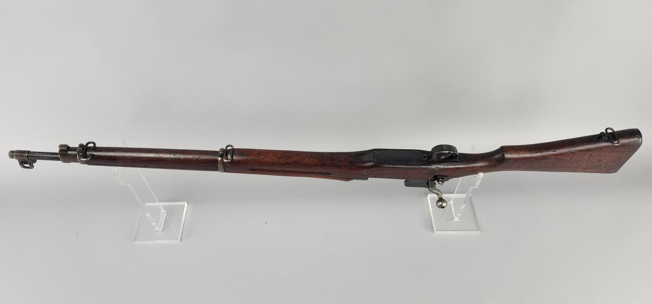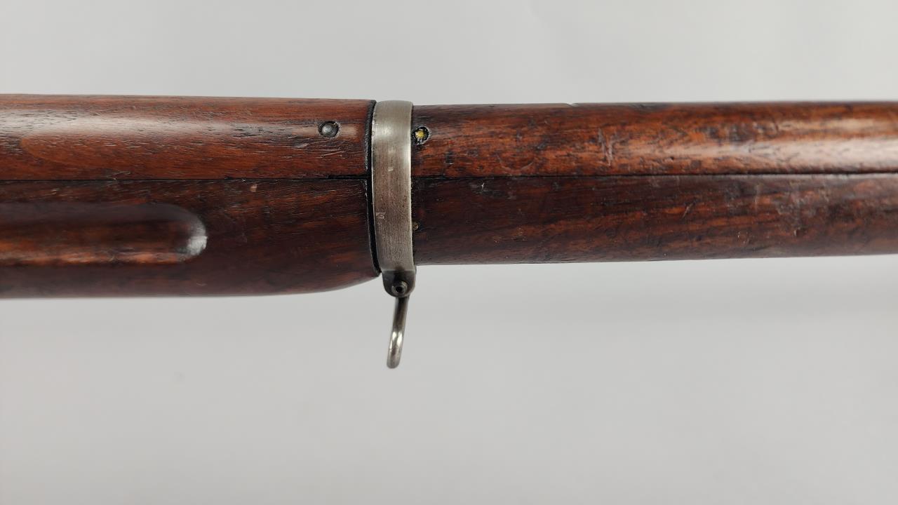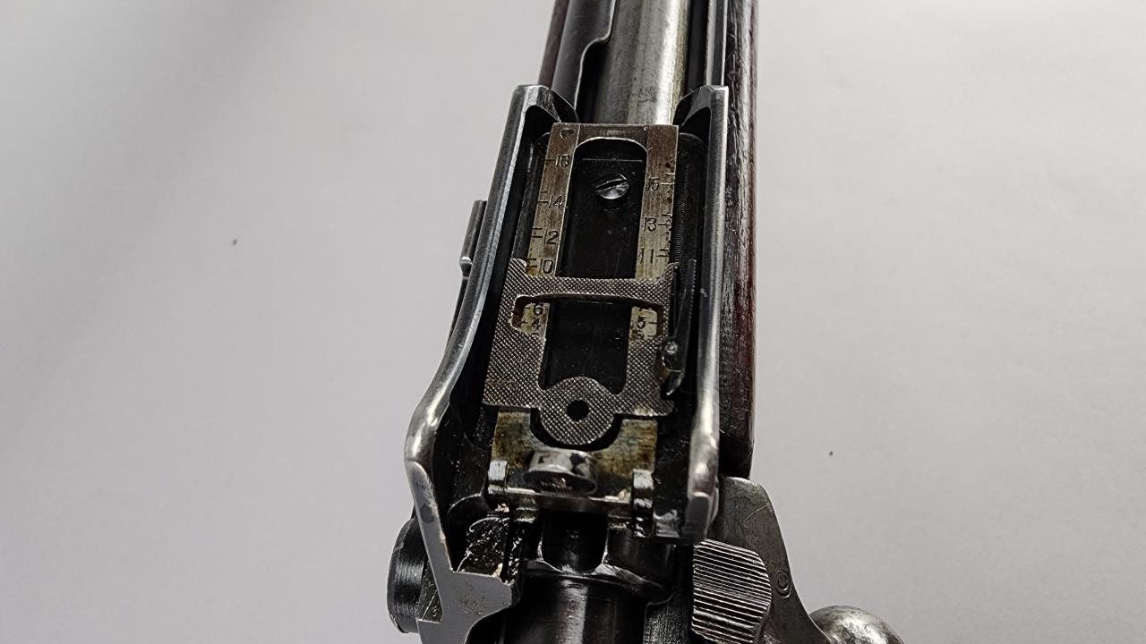 CONDITION: The firearm exhibits handling and storage wear consistent with military use. Bluing on the metal components shows thinning and scattered areas of patina. The wood stock shows wear, dents, and scratches typical of field use, with visible markings on the buttstock. The action cycles properly, and the bore is in good condition with visible rifling. Rear sight is operational. All visible components are intact, and no modifications or repairs are evident. Overall, wear is appropriate for its age and military history.