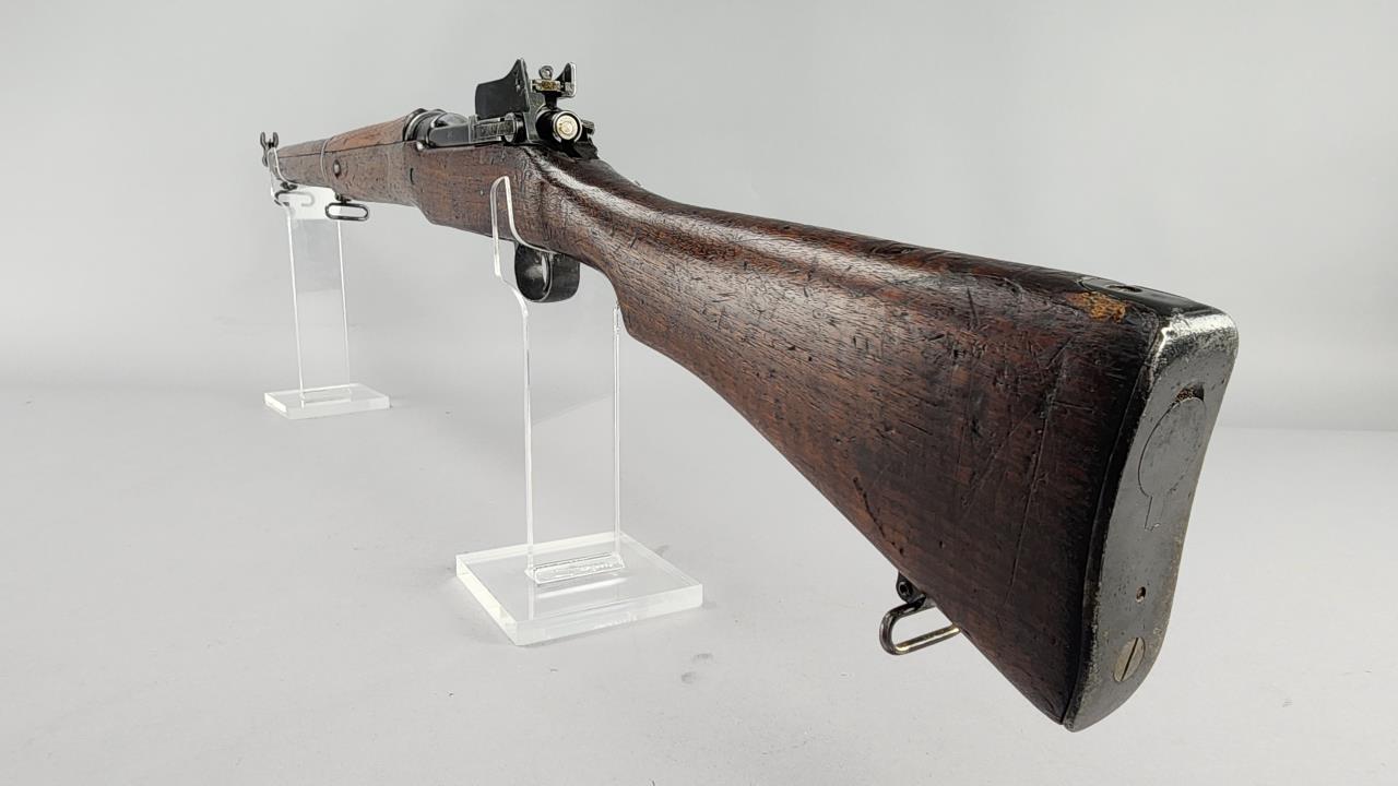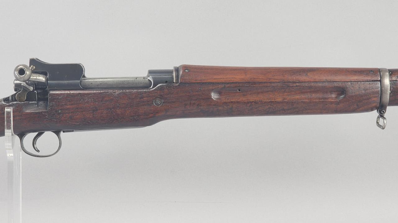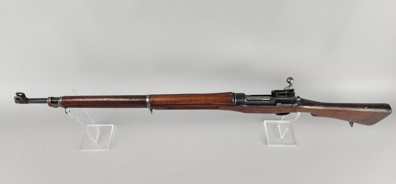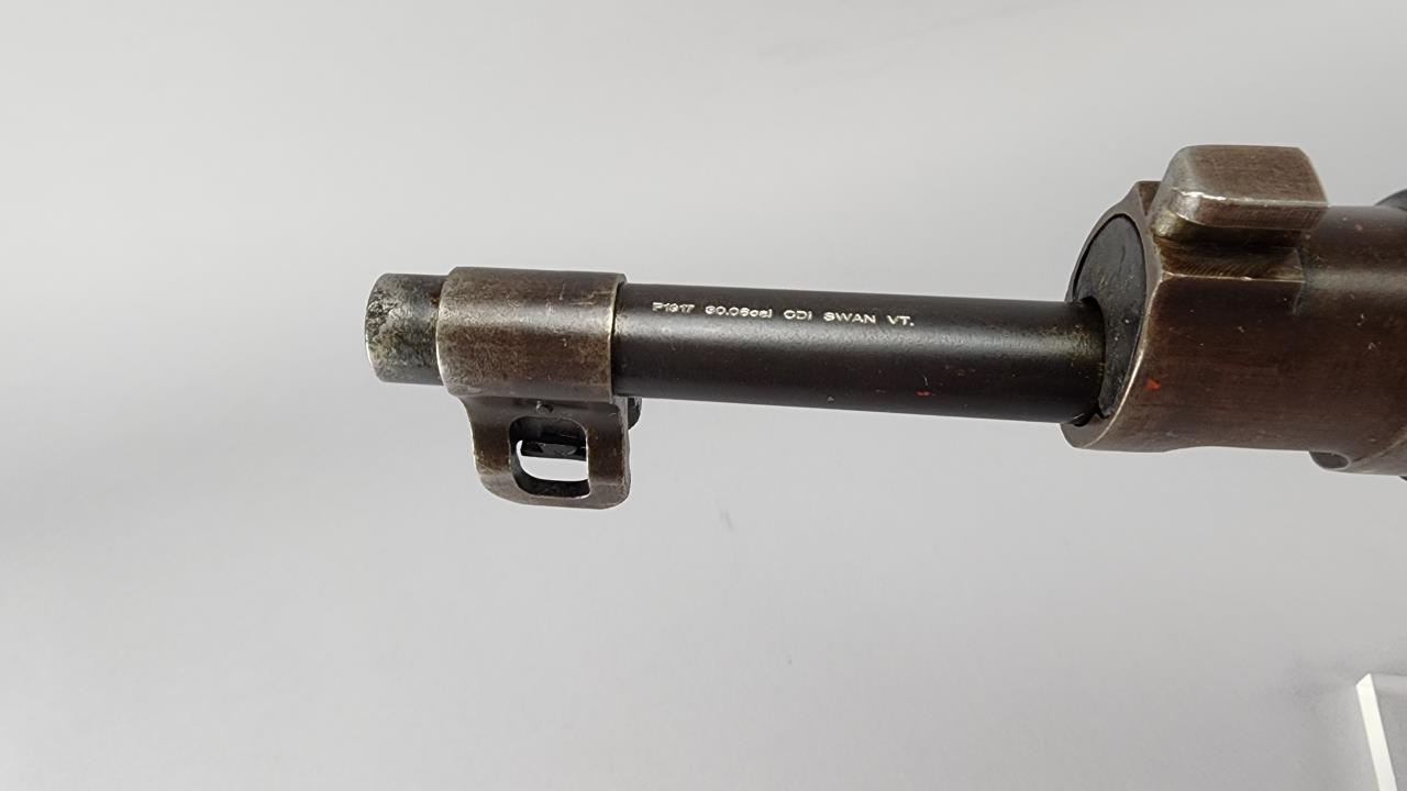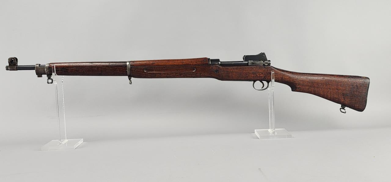 Remington Model P-17 Bolt Action Rifle chambered in .30-06. Serial number 493301. Manufactured during World War I by Remington under contract for the U.S. military. This rifle features a 26-inch barrel with a blued finish, a fixed front sight, and an adjustable aperture rear sight. The receiver is marked ‘U.S. MODEL OF 1917 REMINGTON 493301.’ The stock is crafted from wood, with various ordnance markings visible on the buttstock. The rifle is equipped with sling swivels, a polished bolt handle, and a metal buttplate. A solid example of a military-issue rifle, representative of early 20th-century craftsmanship.