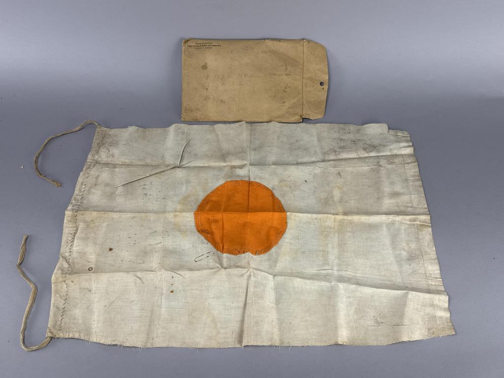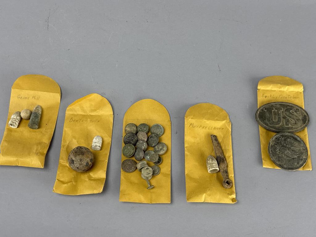 A collection of Civil War-era artifacts consisting of ammunition, buckles, and metal fragments, sourced from historically significant locations including Berkeley Plantation, Murfreesboro, Bentonville, and Gaines Mill. The lot includes several period projectiles, such as lead bullets and Minie balls, metal fragments, and a U.S. Army belt buckle marked with “US.” Each subset is stored in labeled envelopes correlating to their recovery site for provenance. Also included is an older cloth flag, featuring a red circle emblem, likely Japanese in origin, accompanied by its original envelope. This group serves as a tangible representation of battlefield relics from the Civil War with supplementary World War II-era material.