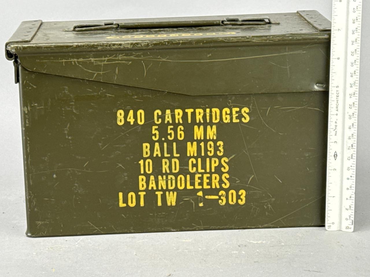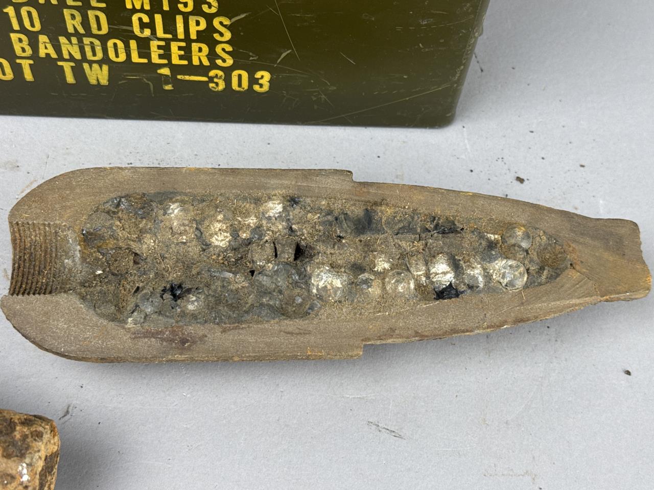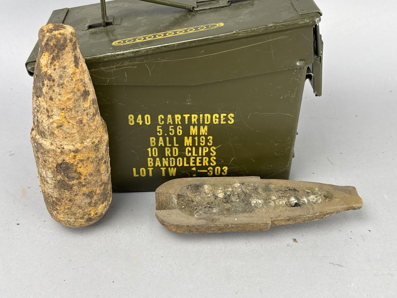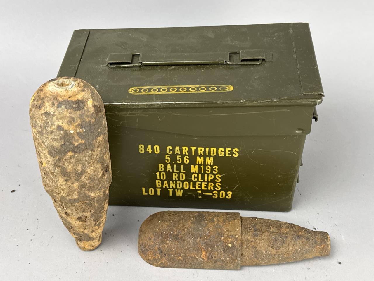 Pair of Civil War-era Schenkl artillery shells, including one intact example and one cut-open specimen displaying internal construction. The intact shell exhibits a tapered cylindrical profile with pronounced threading at the base. The cut-open shell reveals a cross-section of the iron casting and internal lead shrapnel balls designed to enhance its effectiveness as a projectile. Both pieces show visible surface oxidation consistent with their age and military use. Also included in the lot is a vintage ammunition can marked ‘840 Cartridges, 5.56 MM, Ball M193, 10 RD Clips, Bandoleers, Lot TW 1-303’ in yellow stenciled lettering.