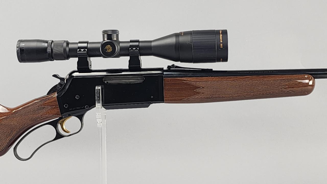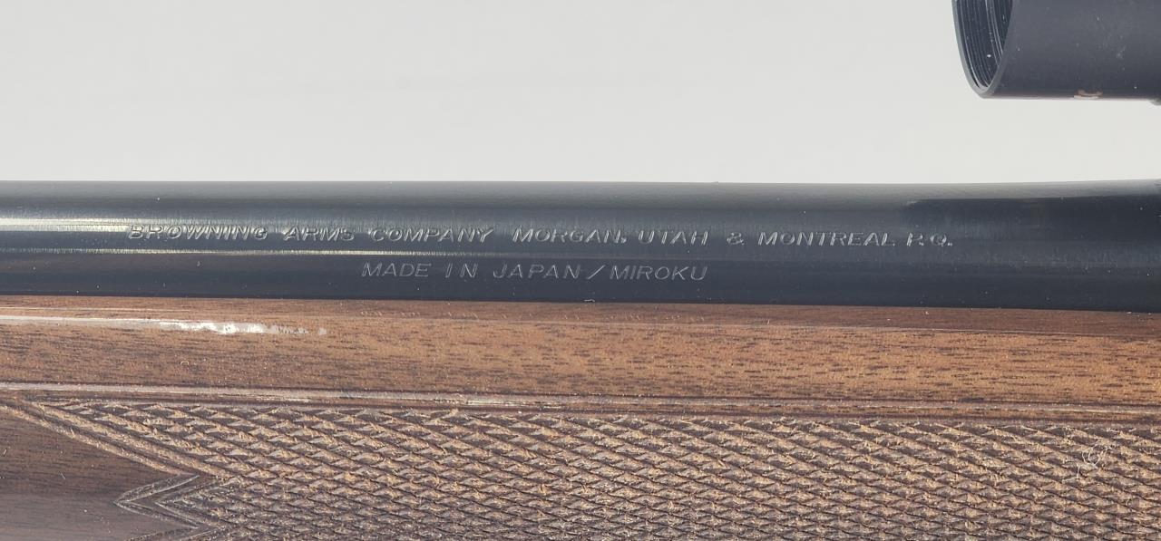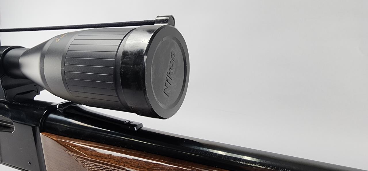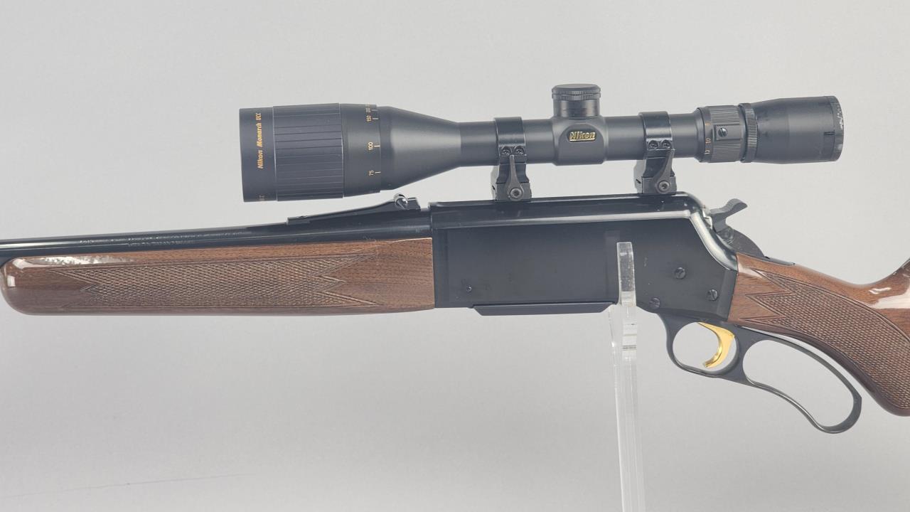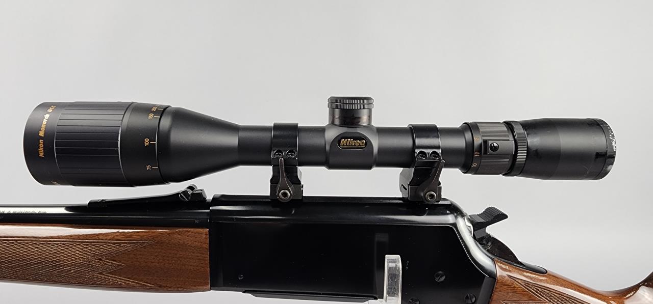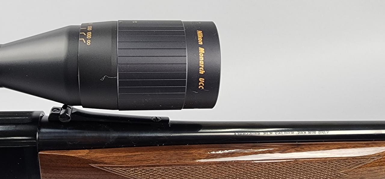 Browning Lightning BLR lever-action rifle chambered in .243 Winchester with a 20-inch blued steel barrel. Serial number 05452MM341. Manufactured by Browning Arms Company and marked “Made in Japan / Miroku” on the barrel. Features a gloss-finished walnut stock with checkering on the grip and forearm, a gold-plated trigger, and a factory-installed recoil pad. Equipped with an open front sight, folding rear sight, and a mounted Nikon Monarch UCC rifle scope with variable magnification (marked for distances up to 1000 yards). The blued finish on the receiver and barrel complements the polished walnut stock, making for a visually striking and functional firearm.