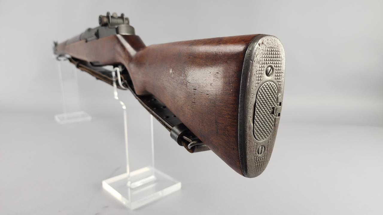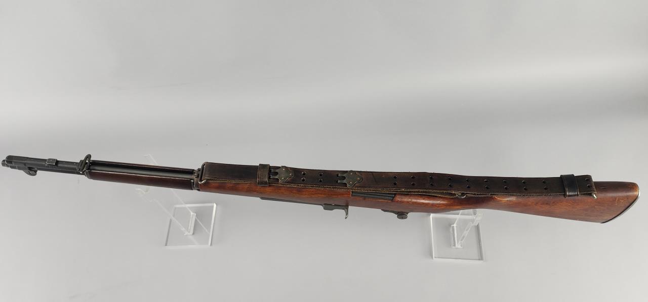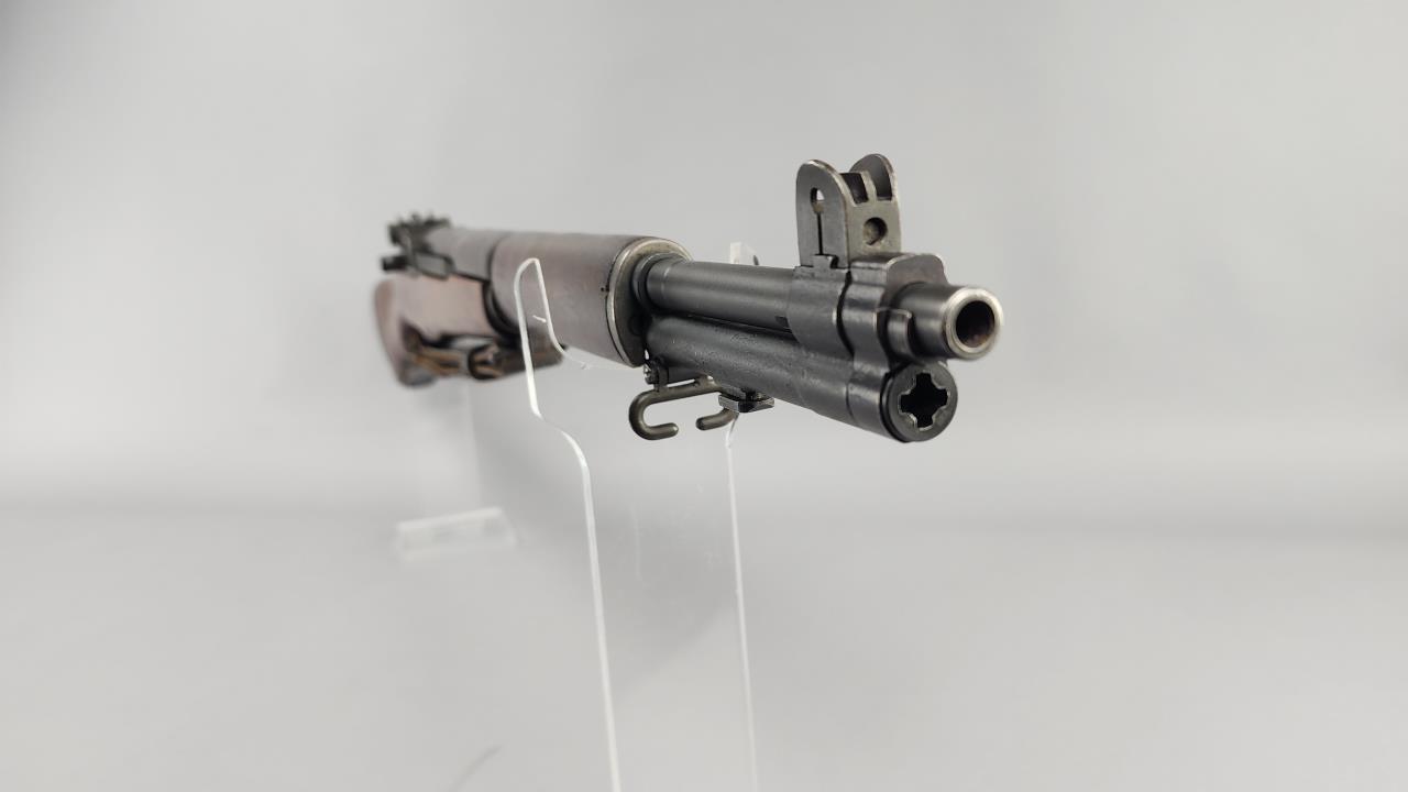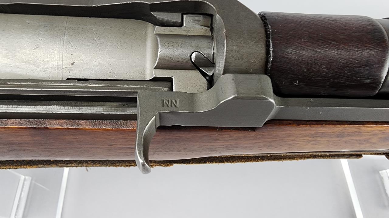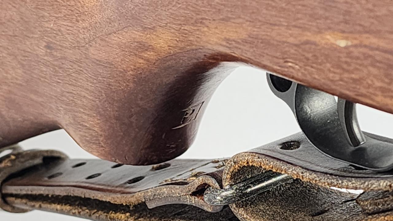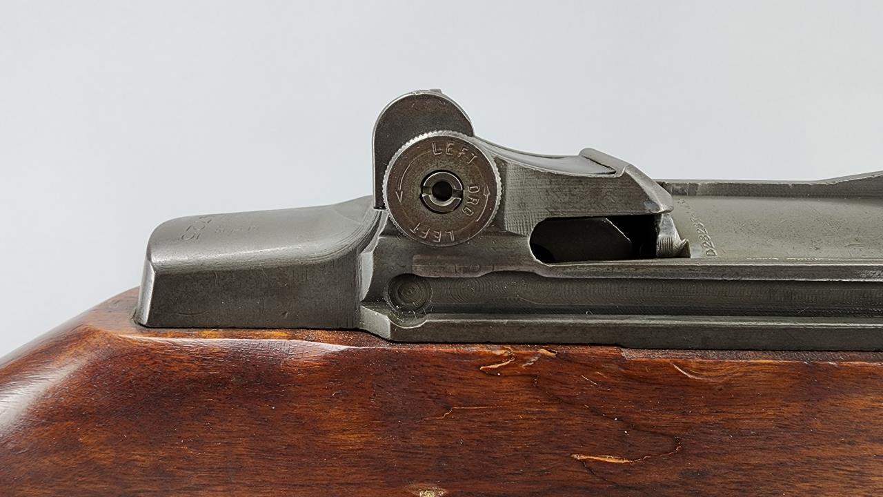 CONDITION: The wood stock shows moderate handling wear, including scuffs and small scratches consistent with use and age. There is some discoloration and blemishing on the metal surfaces but no significant pitting observed. The bore appears clean with defined rifling. The leather sling shows visible wear with cracking and discoloration but remains intact. Mechanically, the action cycles properly by hand. This rifle appears to be in good overall condition with visible signs of service use and refurbishment.
