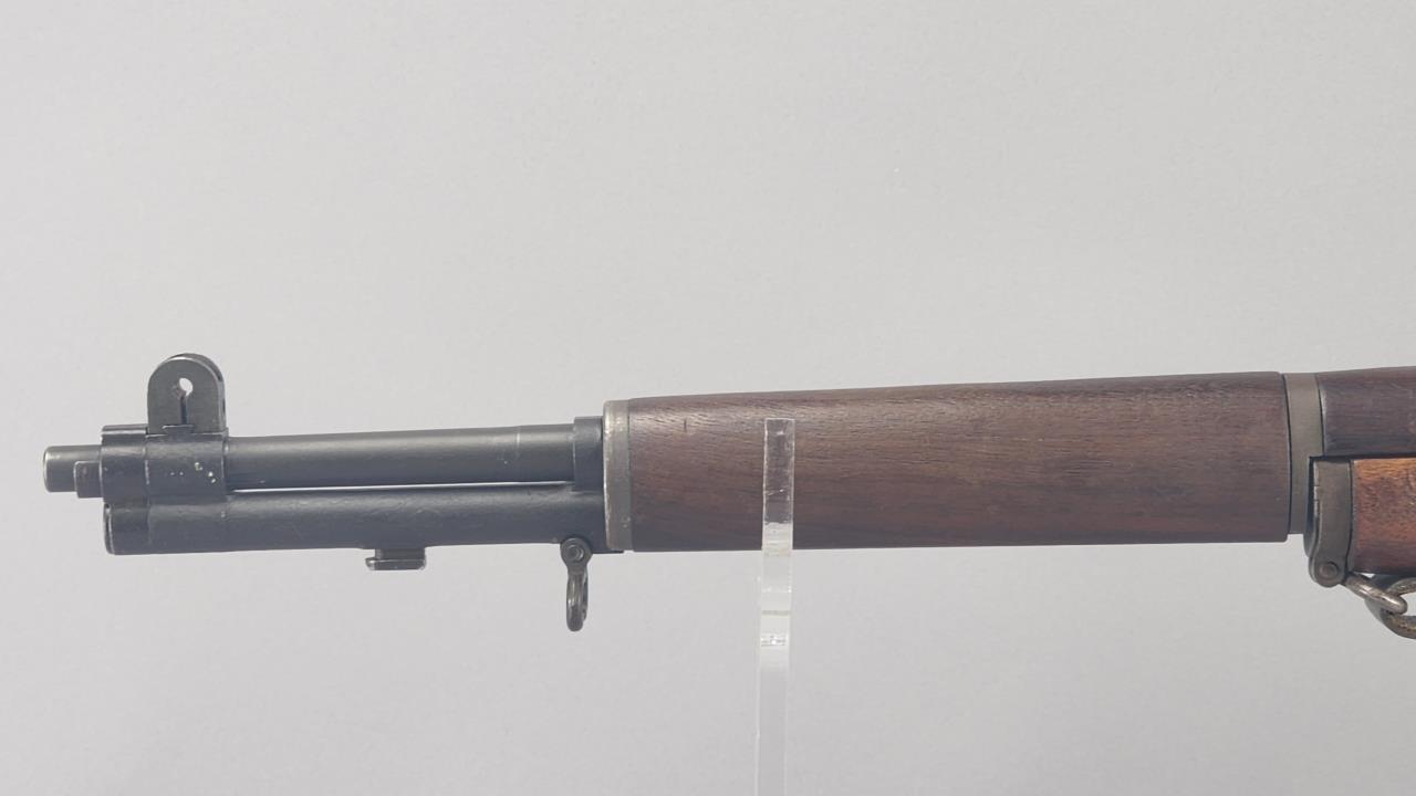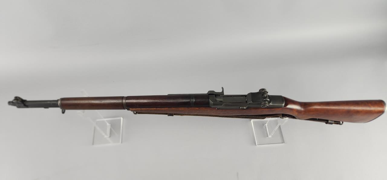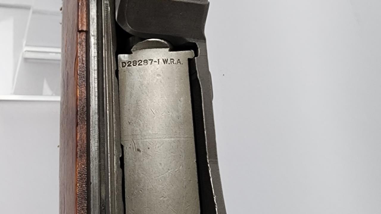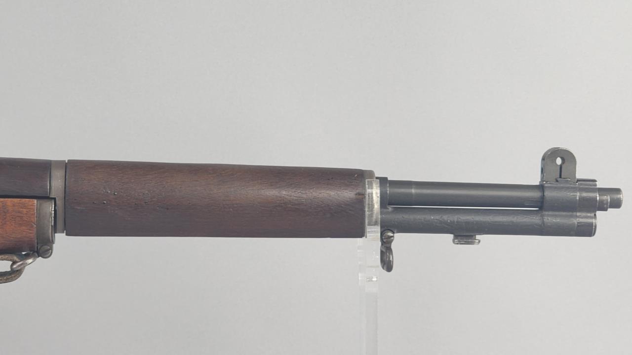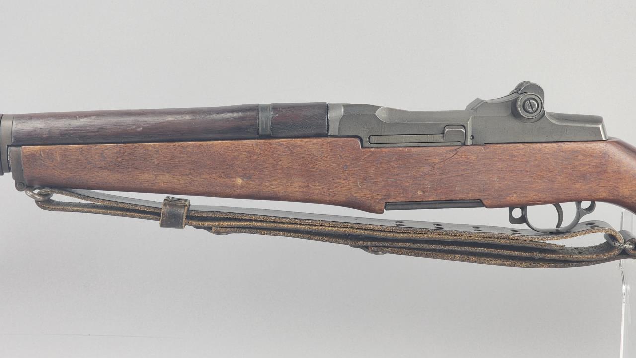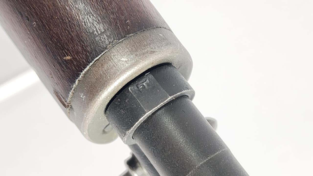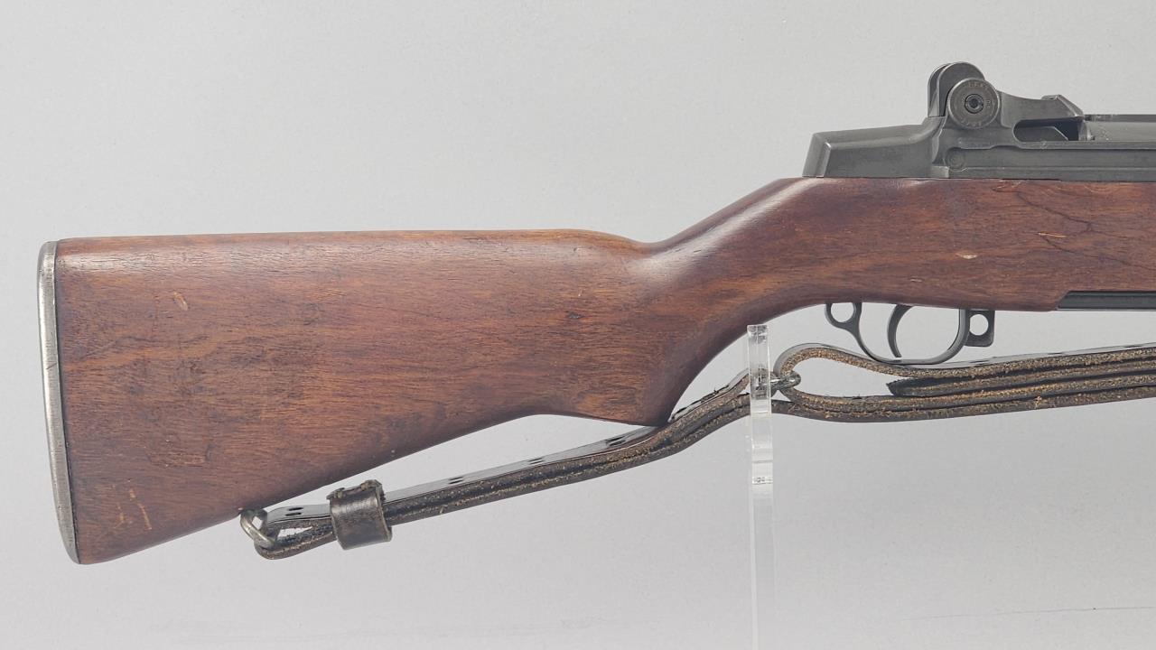 CONDITION: The wood stock shows moderate handling wear, including scuffs and small scratches consistent with use and age. There is some discoloration and blemishing on the metal surfaces but no significant pitting observed. The bore appears clean with defined rifling. The leather sling shows visible wear with cracking and discoloration but remains intact. Mechanically, the action cycles properly by hand. This rifle appears to be in good overall condition with visible signs of service use and refurbishment.
