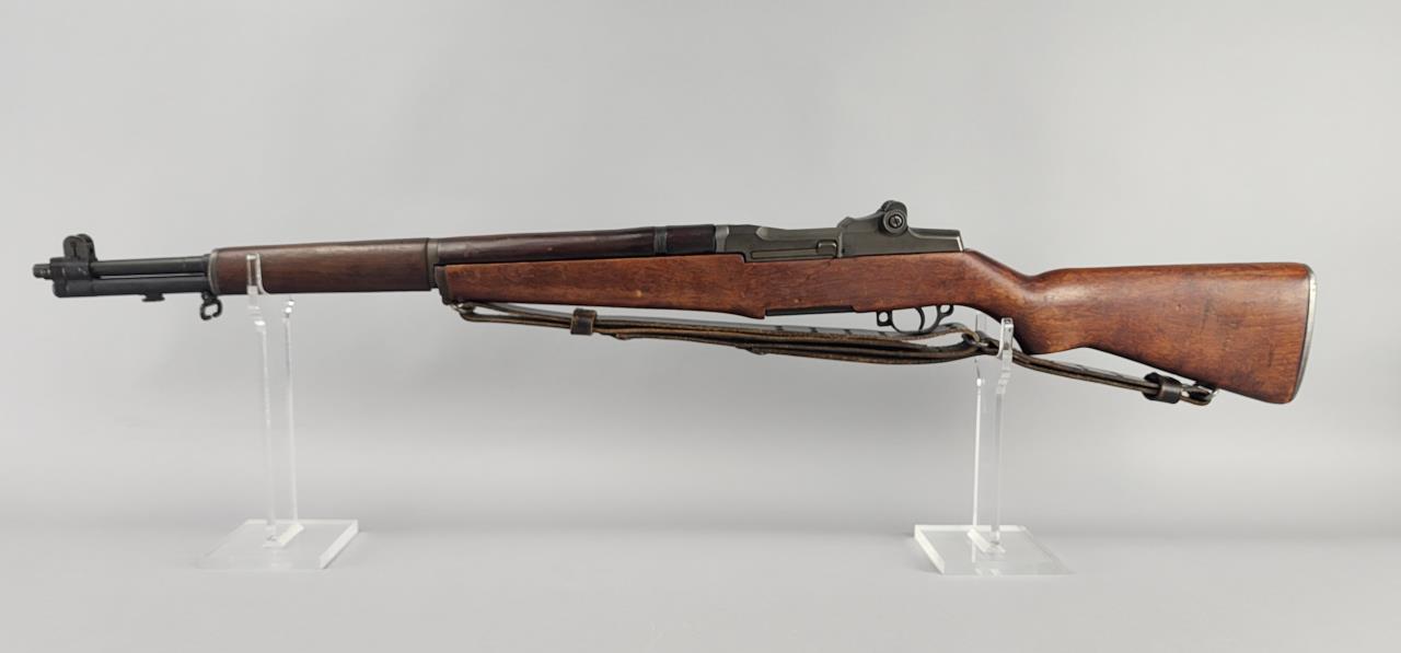 Winchester M1 Garand, .30-06 caliber, serial number 2454725, manufactured during World War II in the early 1944 production period. Features a 24-inch barrel rebarreled by Springfield Armory (SA) in August 1964 as marked on the barrel. The bolt is marked W.R.A, indicating it was made by Winchester Repeating Arms. The trigger group is Springfield Armory, and the operating rod is marked RA for Remington Arms. Constructed with a blued finish and fitted with a wood stock bearing clear cartouche marks. Includes attached leather sling and adjustable rear sight for precise accuracy. Stamped ‘U.S. Rifle Cal .30 M1 Winchester’ on the receiver. This rifle showcases parts from multiple manufacturers, typical of arsenal-refurbished Garands post-war.