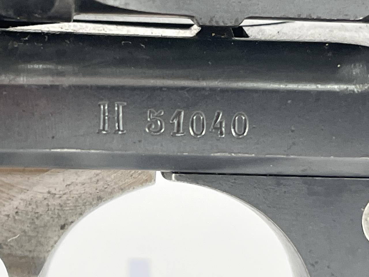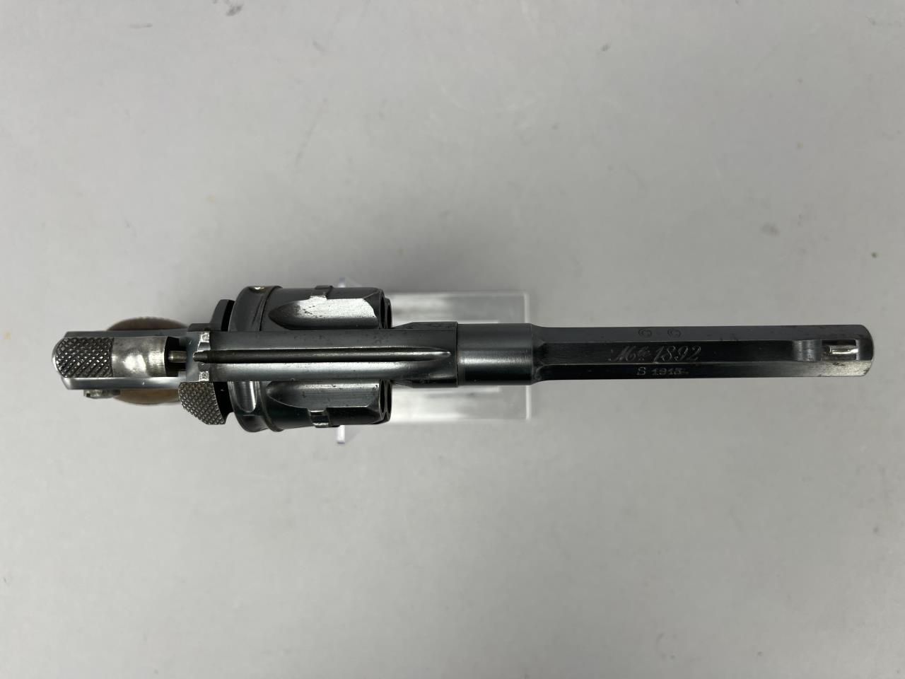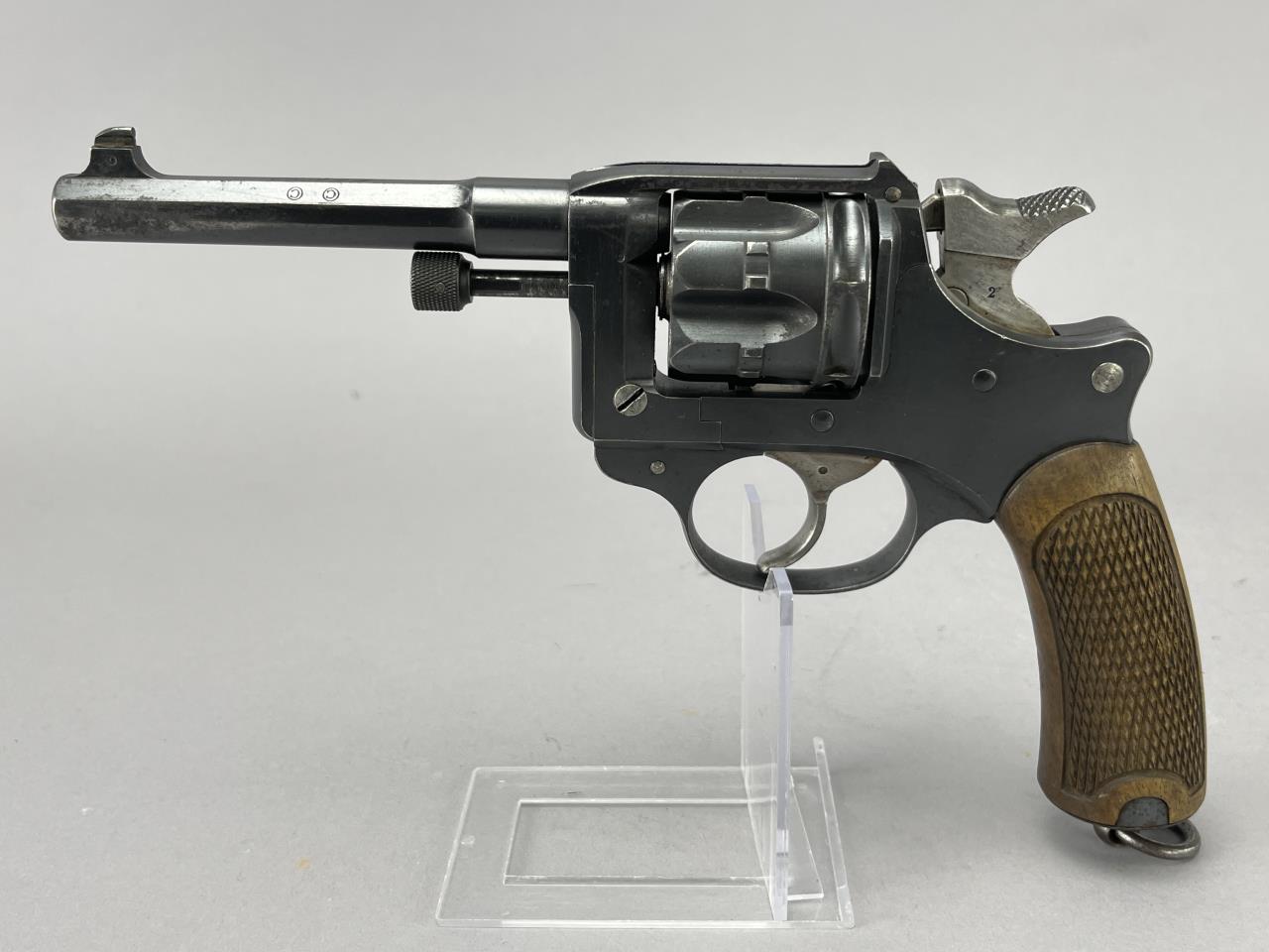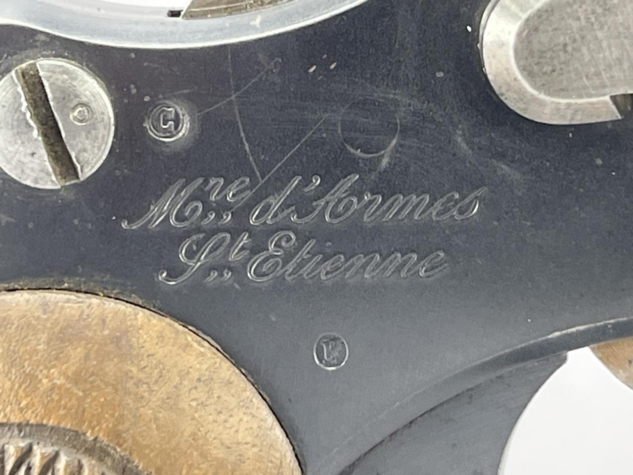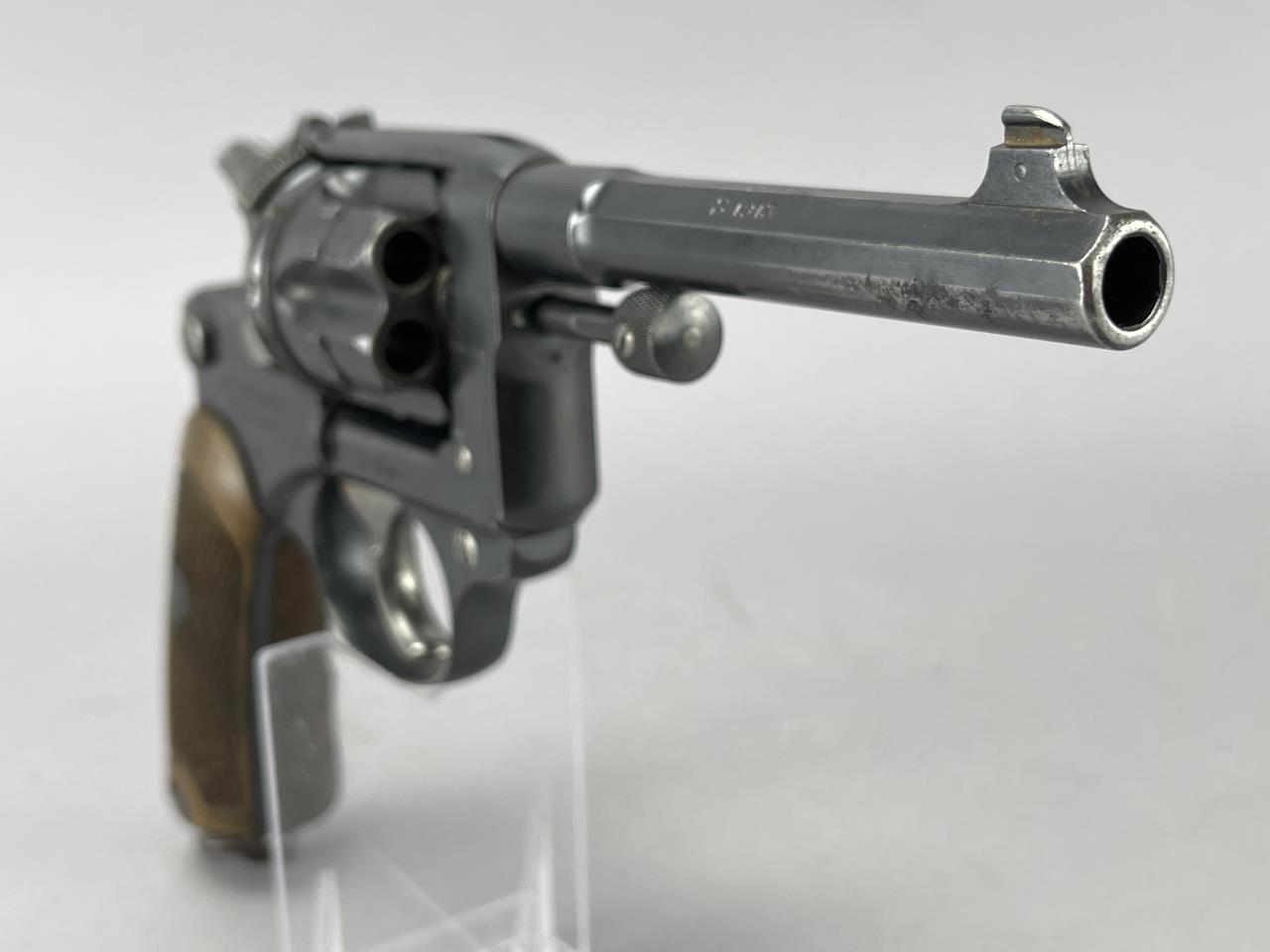 St. Etienne Model 1892 revolver chambered in 8mm Lebel with a 4.5-inch barrel and serial number H51040. Manufactured at the French state armory in St. Etienne, this revolver features a blued finish, six-shot cylinder, and fixed front and rear sights. The barrel is marked ‘Mle 1892’ and ‘S 1913,’ indicating production year, and the frame is marked with ‘Mre d’Armes St. Etienne.’ It is fitted with checkered wooden grips with a lanyard ring at the butt. This historically significant firearm is an example of the French officer’s service revolver utilized during the WWI period.