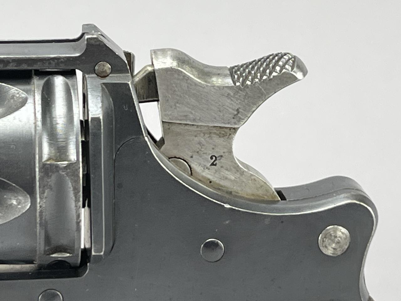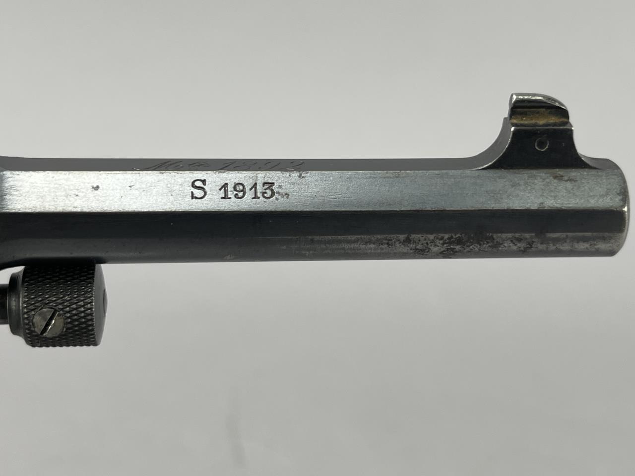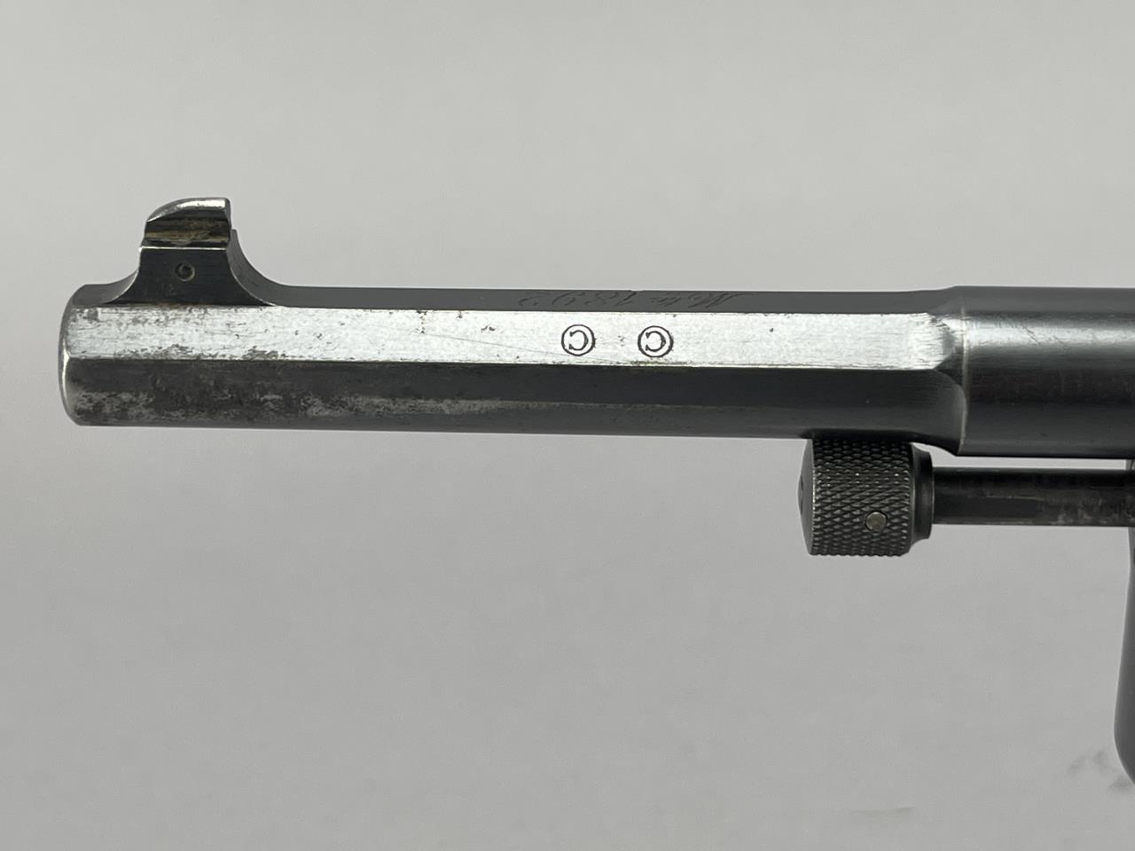 CONDITION: Finish displays holster wear on the high points, notably on the barrel and cylinder edges. Some areas exhibit minor scratches and light handling wear. Grips show moderate wear consistent with age, with visible but softened checkering. Clear and well-defined markings throughout. Mechanical functions, including hammer and cylinder rotation, appear operational from visual inspection. The bore condition cannot be determined from the provided images but should be verified prior to use.