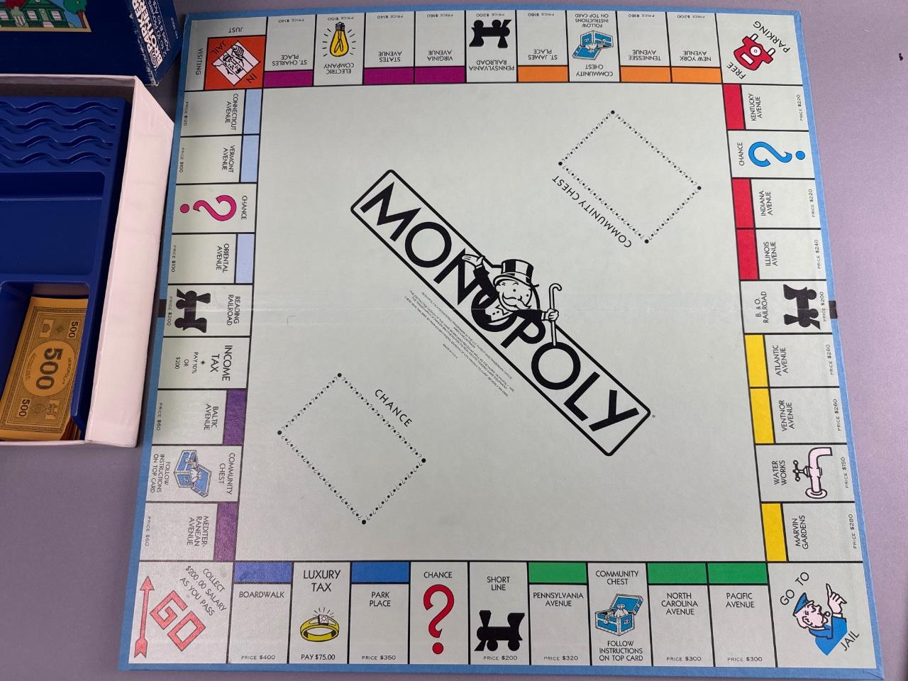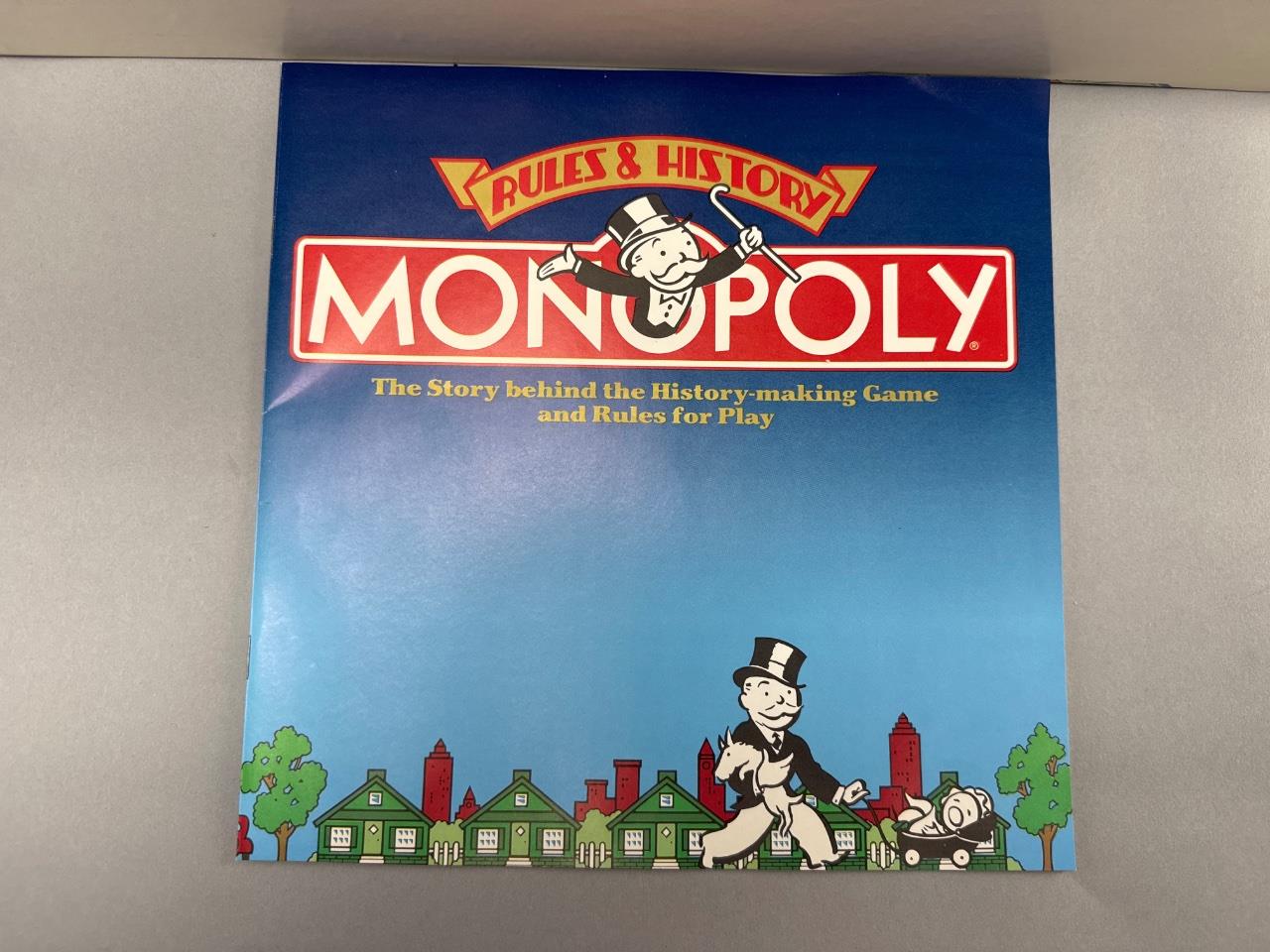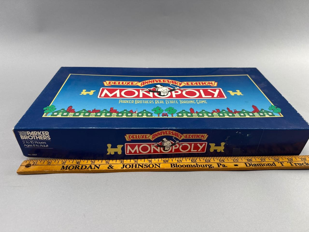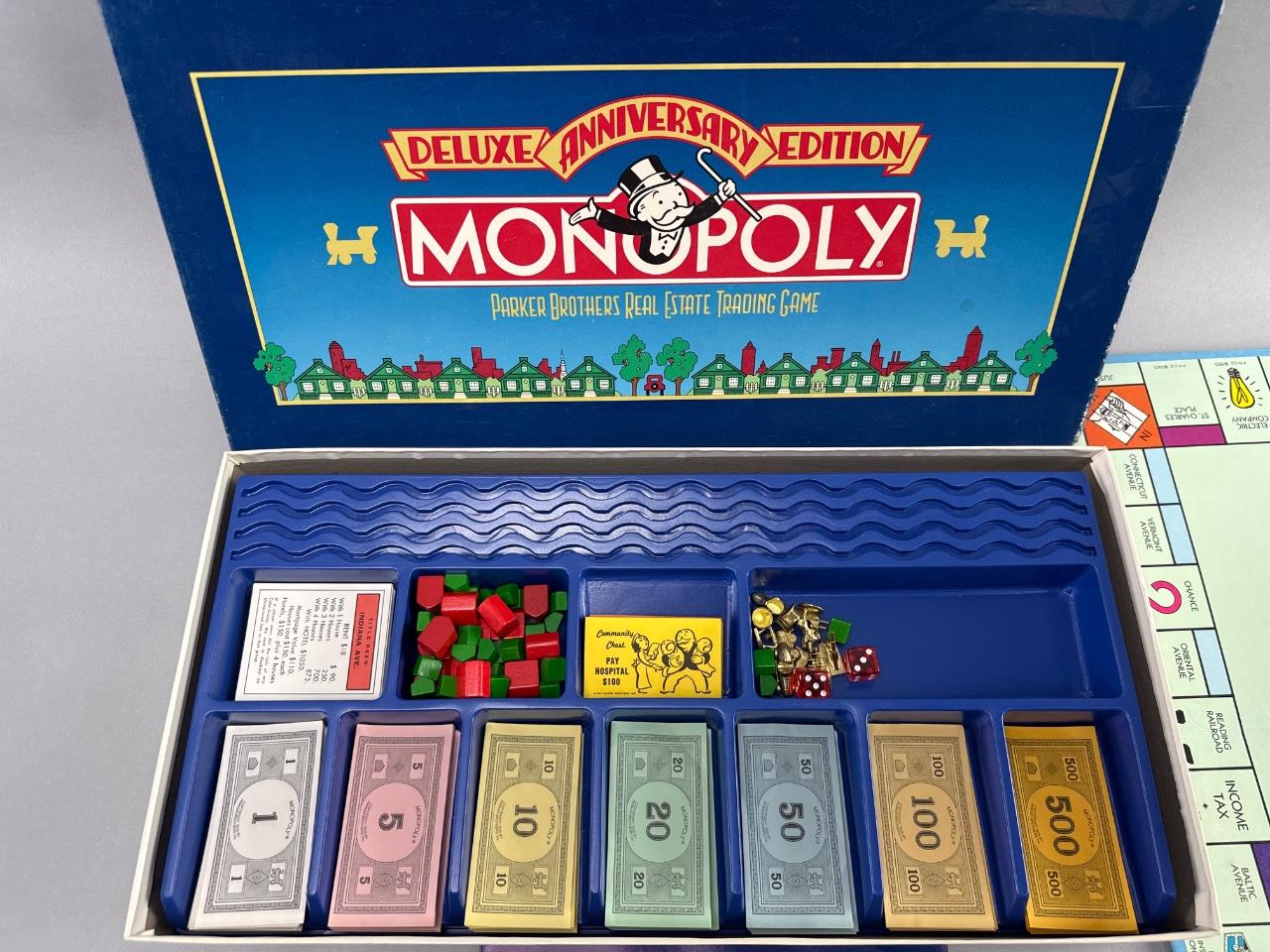 Deluxe Anniversary Edition Monopoly board game by Parker Brothers. Includes game board, playing pieces, cards, property titles, money, houses, hotels, and a rulebook titled ‘Rules & History.’ Complete in original box, circa 1990s.