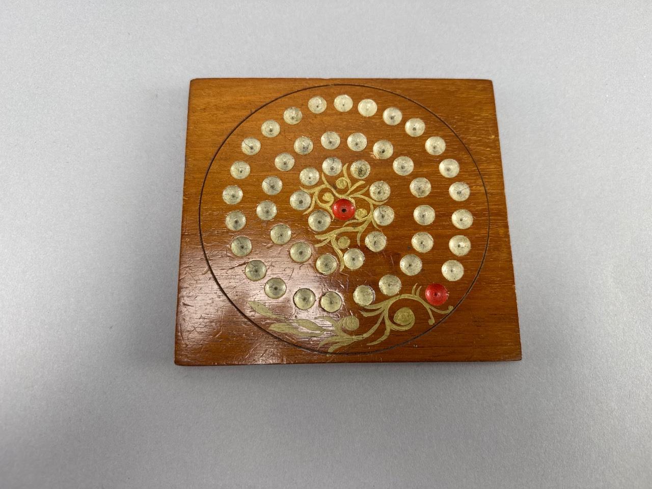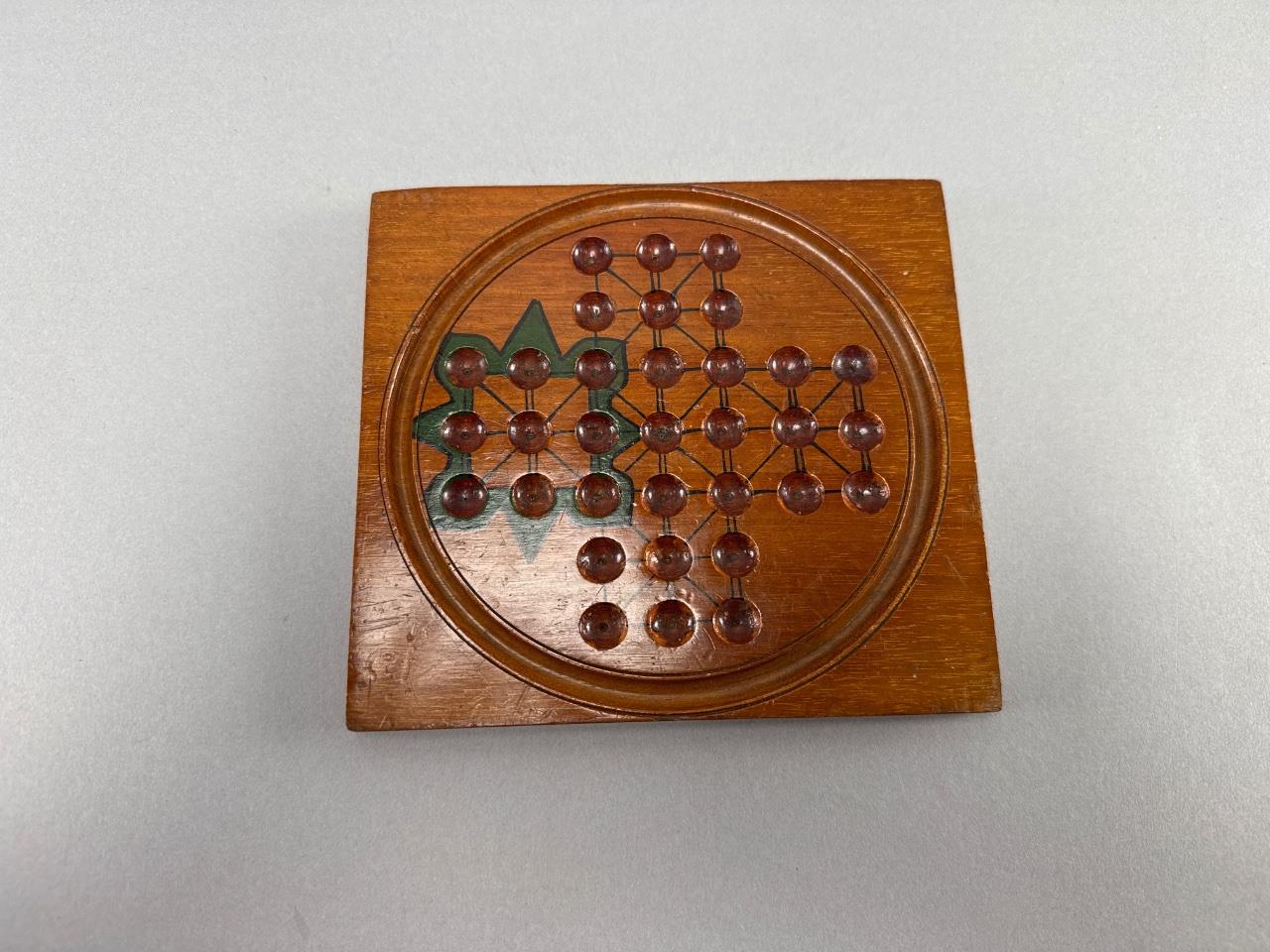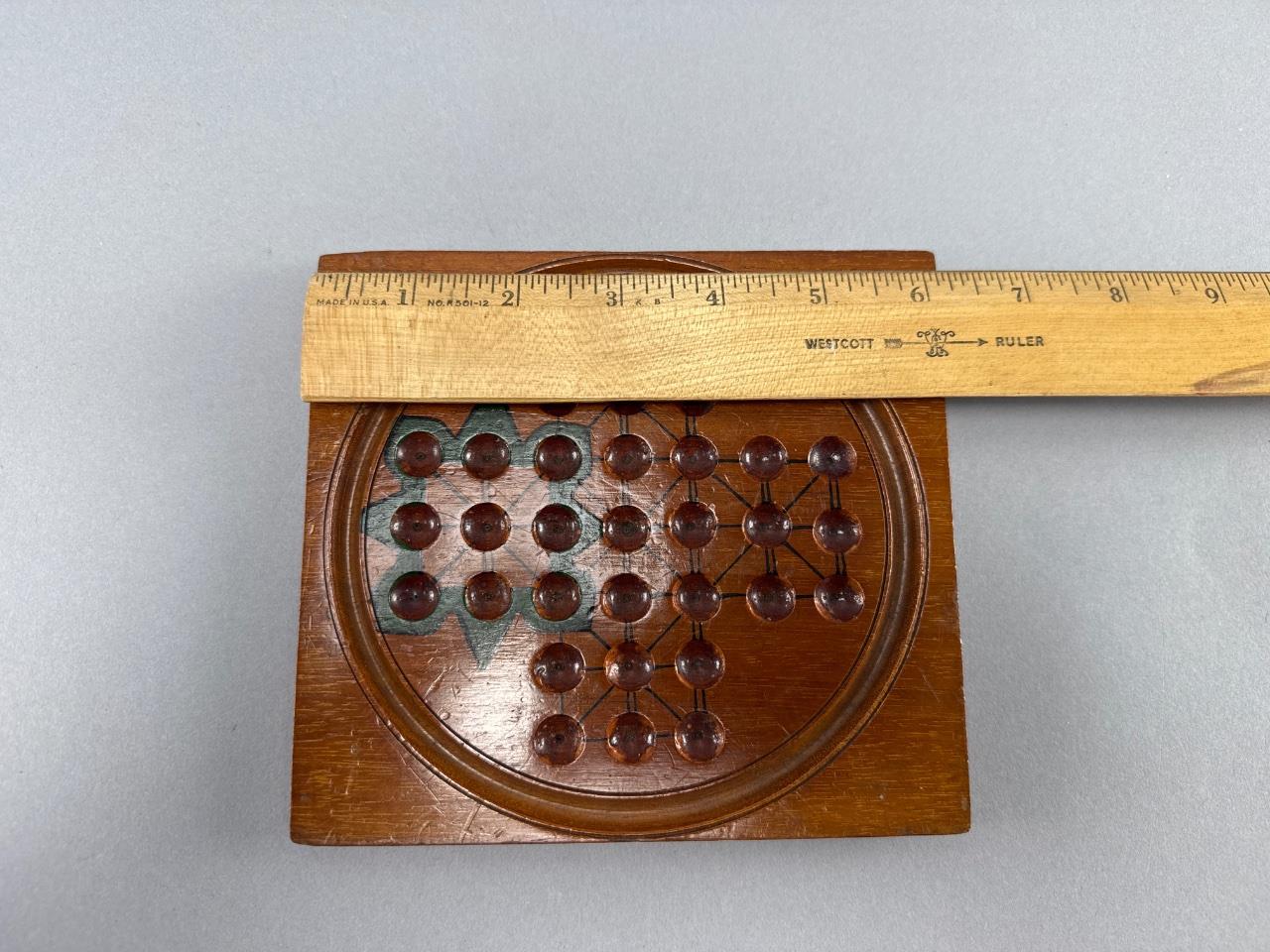 Vintage wooden solitaire game featuring a circular board with intricately painted design and 32 multicolored glass marbles. The board inches square and presents a handcrafted aesthetic ideal for display or play.