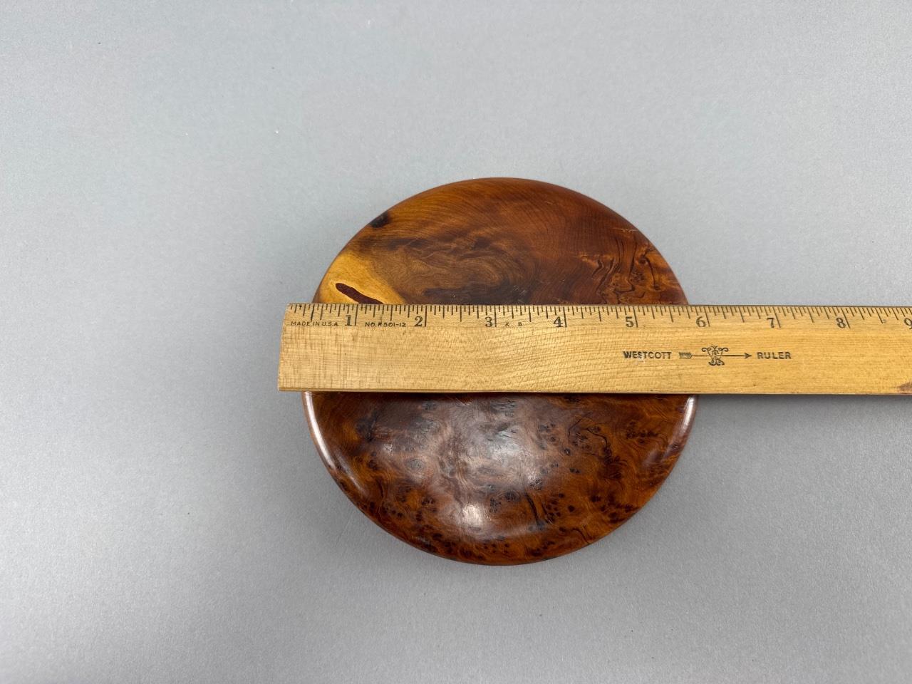 Vintage circular solitaire game featuring a polished burled wood base with distinct swirling grain patterns. Includes 32 multi-colored marbles in red, black, white, and yellow. The compact base inches in diameter with drilled marble recesses.