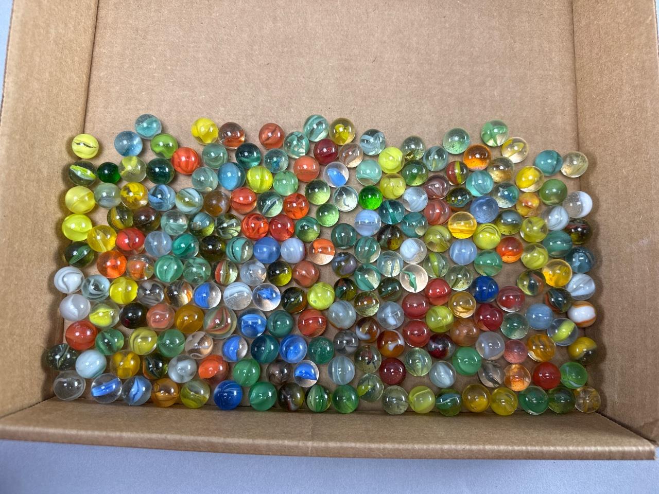 Collection of assorted vintage glass marbles, featuring various vibrant colors and swirling patterns. Includes clear, opaque, and multi-colored designs with a mix of sizes. Ideal for display or play.