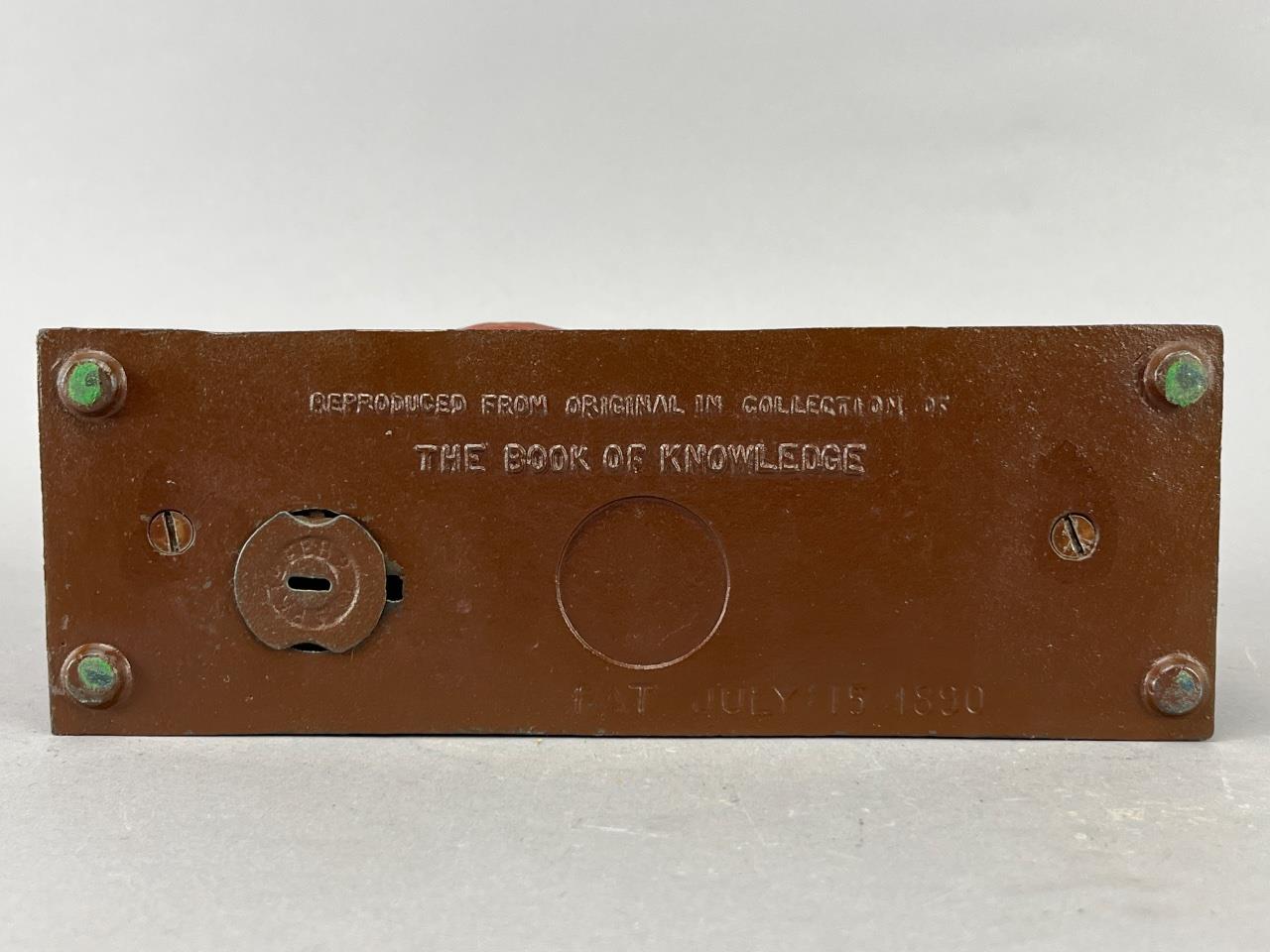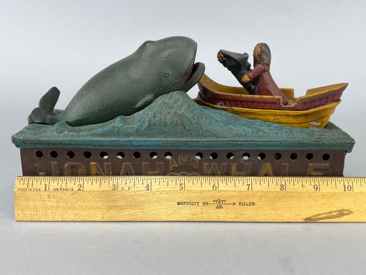 This is a cast iron mechanical bank depicting ‘Jonah and the Whale,’ marked on the base as ‘Reproduced from Original in Collection of The Book of Knowledge,’ dated July 15, 1890. The colorful painted design features Jonah in a red and yellow boat, holding an object near the green whale, set atop a detailed base. The bank displays the name ‘Jonah and The Whale’ in molded lettering across the front. The piece measures 10 inches in length, as verified by the accompanying ruler in the image. Mechanical components are visible underneath the base, indicating its functional nature as a bank.