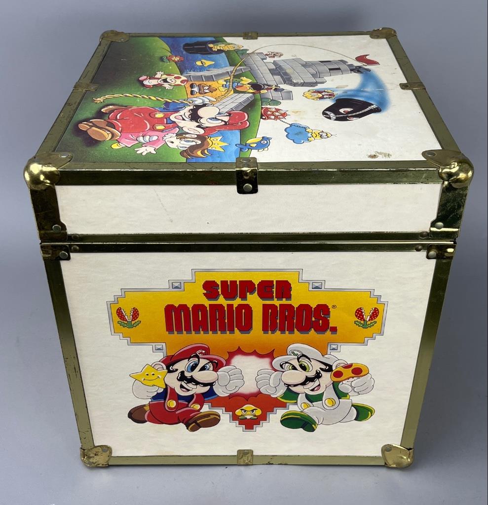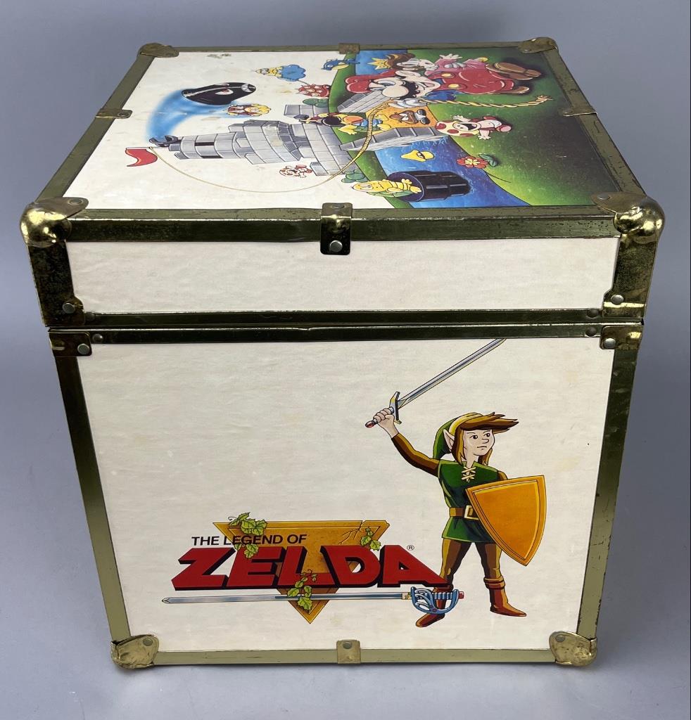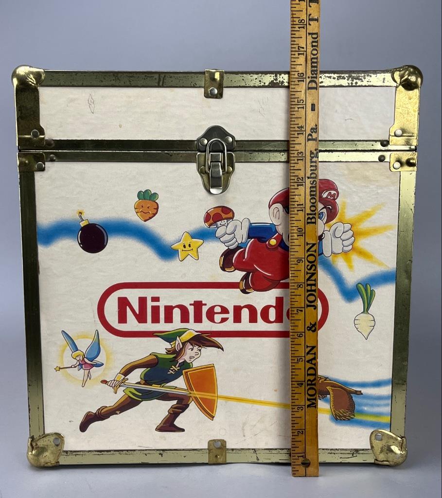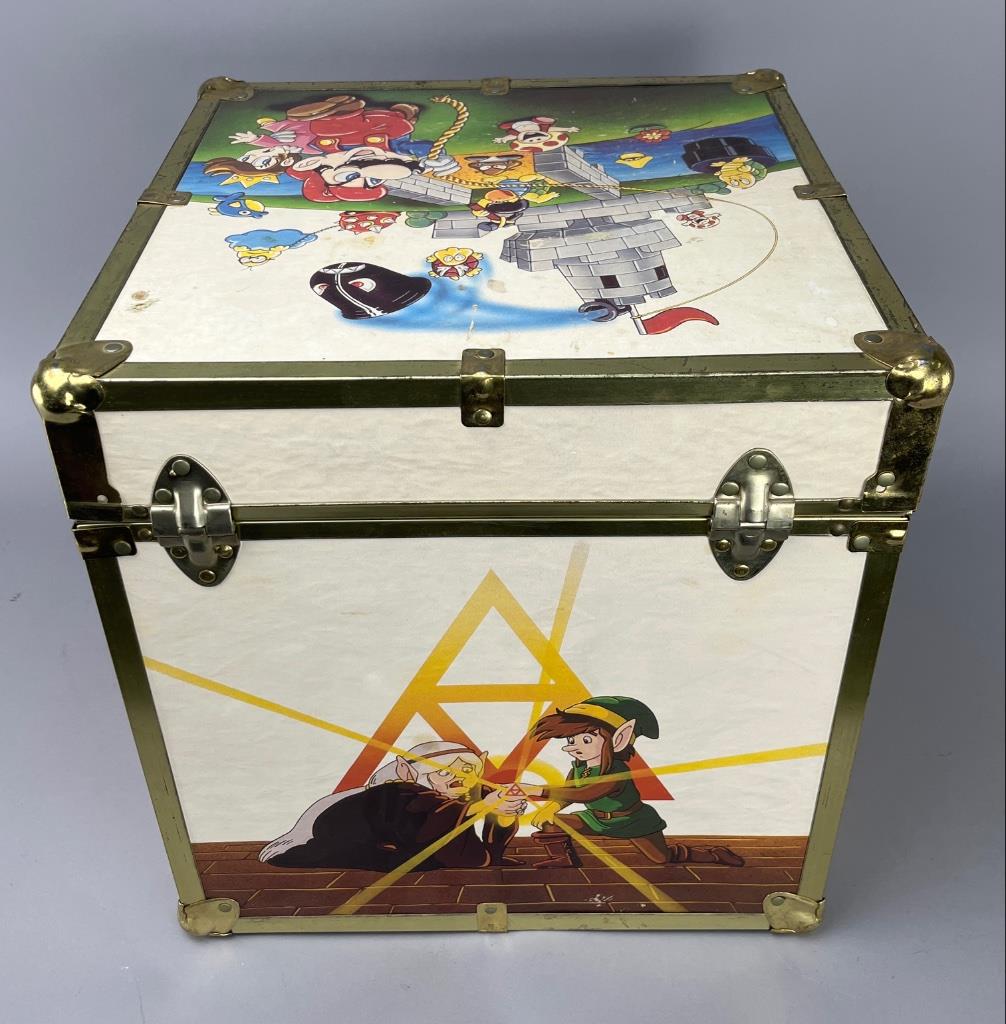 Vintage Nintendo storage trunk featuring colorful Super Mario Bros. and The Legend of Zelda graphics on all sides. The metal-reinforced trunk measures approximately 16 inches in height and 14 inches in width and depth. The exterior exhibits notable wear, including scratches, scuffs, and minor dents in the metal corner reinforcements. The interior is lined with wood particleboard and shows light signs of use. Hinges, latch, and overall structure remain functional.