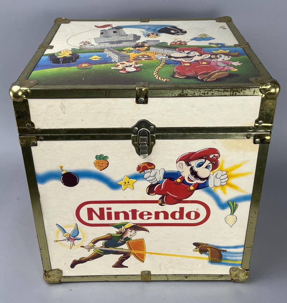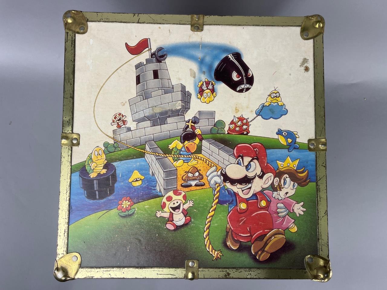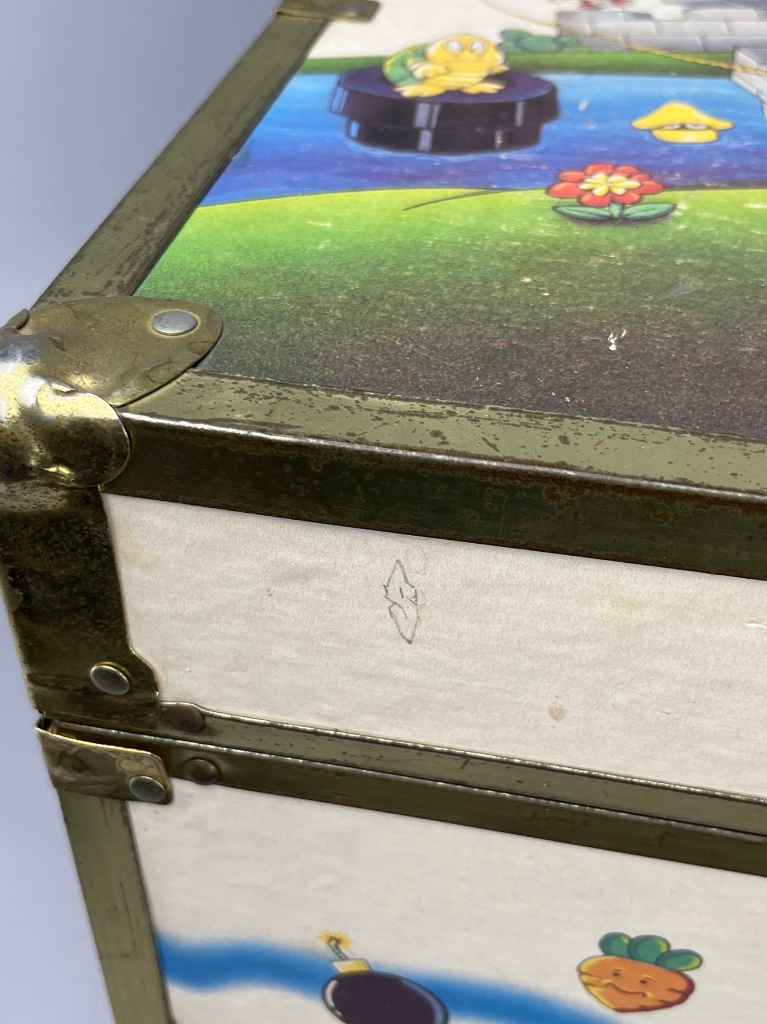Vintage Nintendo storage trunk featuring colorful Super Mario Bros. and The Legend of Zelda graphics on all sides. The metal-reinforced trunk measures approximately 16 inches in height and 14 inches in width and depth. The exterior exhibits notable wear, including scratches, scuffs, and minor dents in the metal corner reinforcements. The interior is lined with wood particleboard and shows light signs of use. Hinges, latch, and overall structure remain functional.