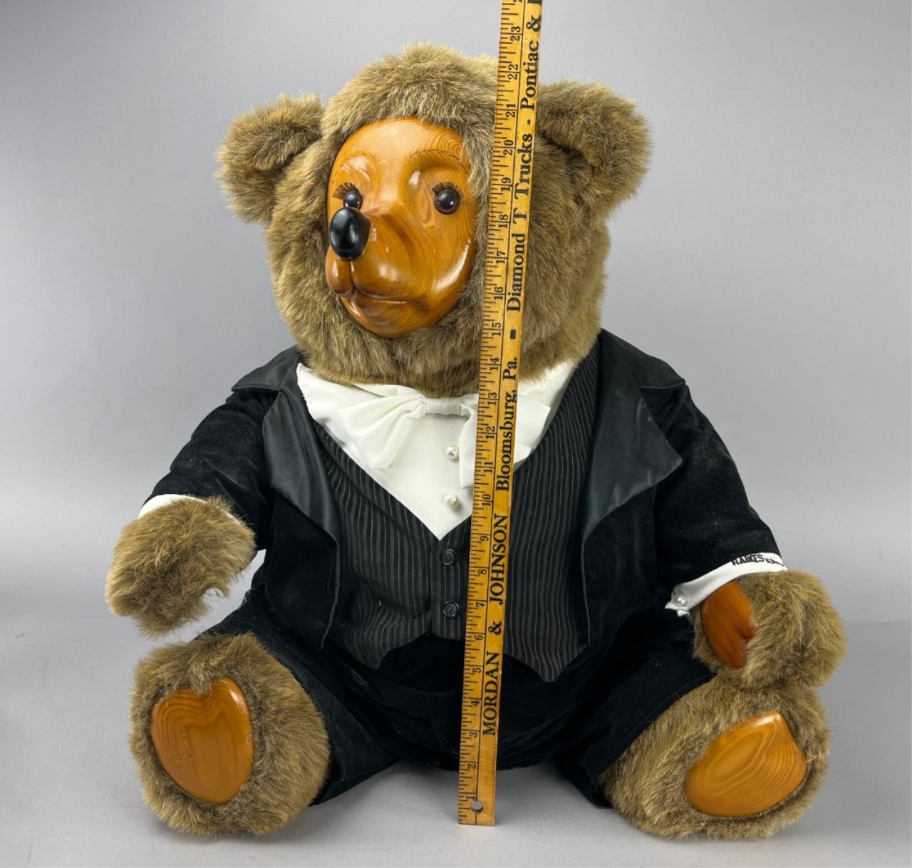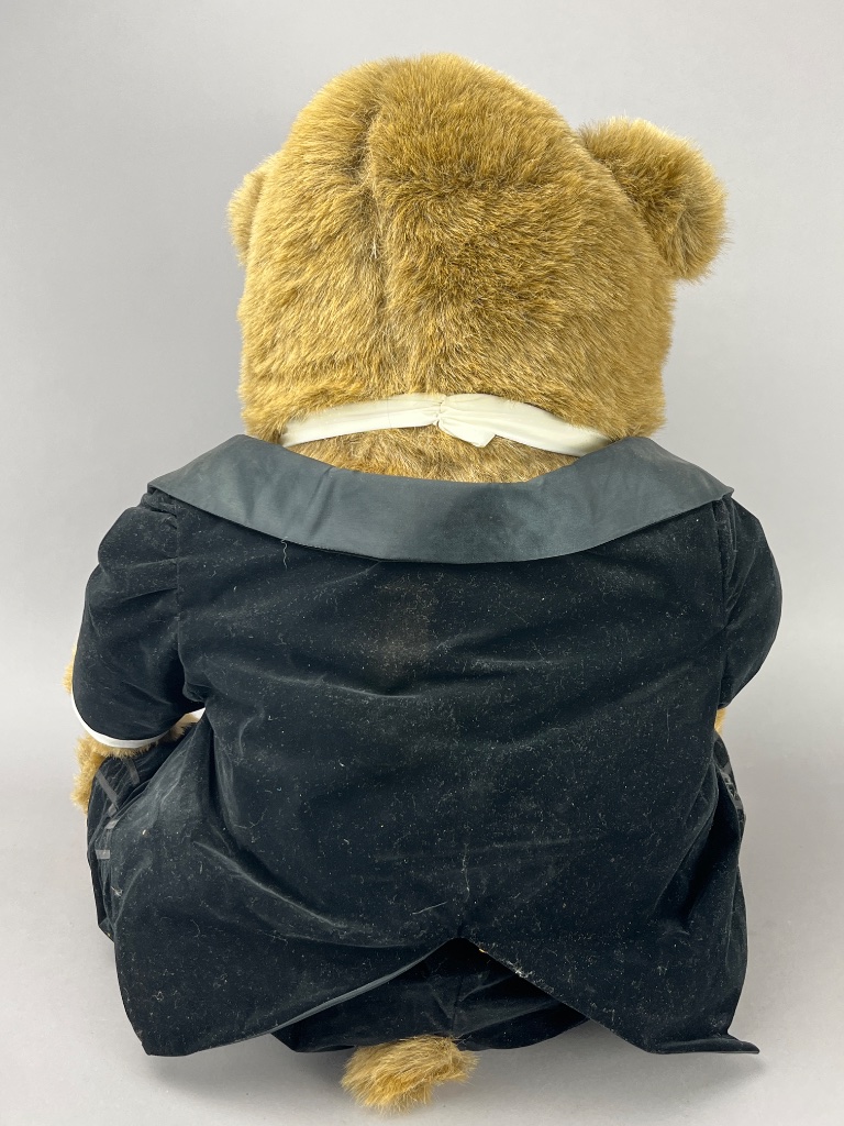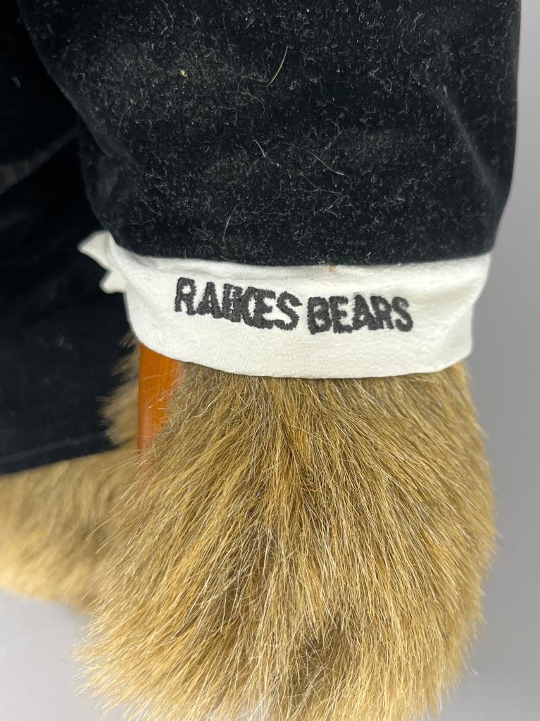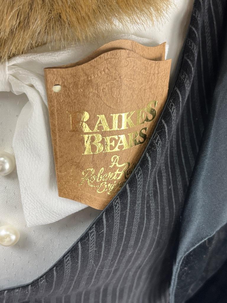 Raikes Bears collectible bear dressed in formal evening attire, standing approximately 22 inches tall. The bear features a plush body with detailed wood-carved paws, and is adorned in a velvet suit with a pinstriped vest and white bow tie. Visible branding includes ‘Raikes Bears’ printed on the cuff and a ‘Raikes Bears – A Robert Raikes Original’ tag affixed to the front of the vest. The bear shows light dust accumulation and minor wear to the clothing.