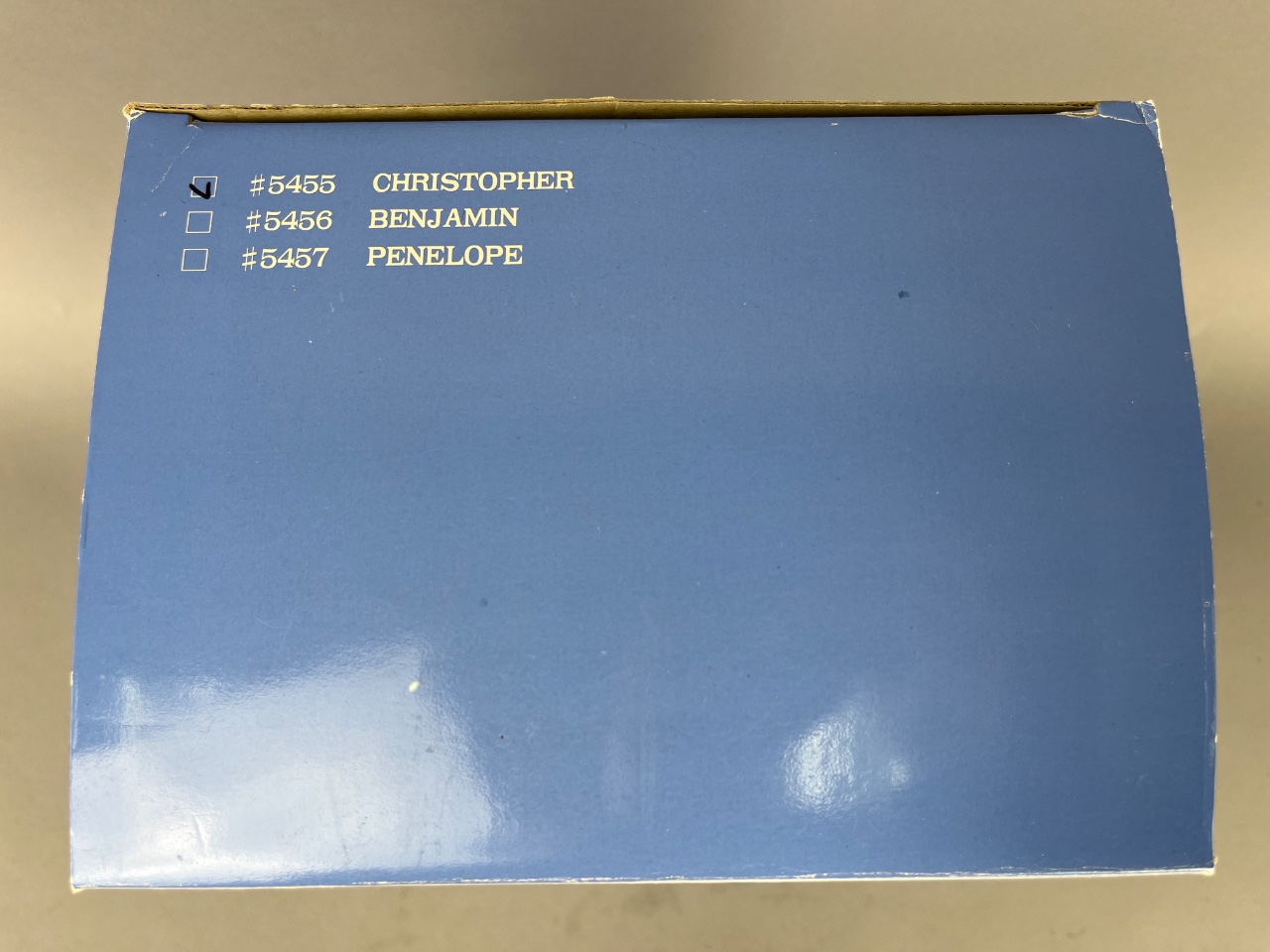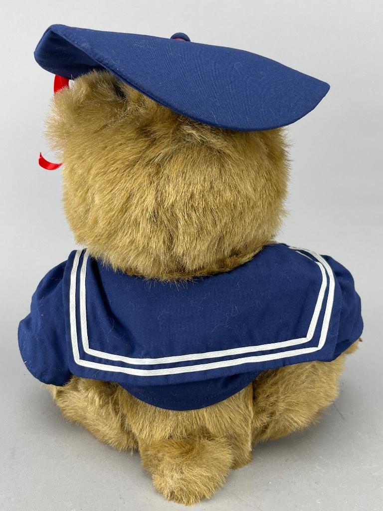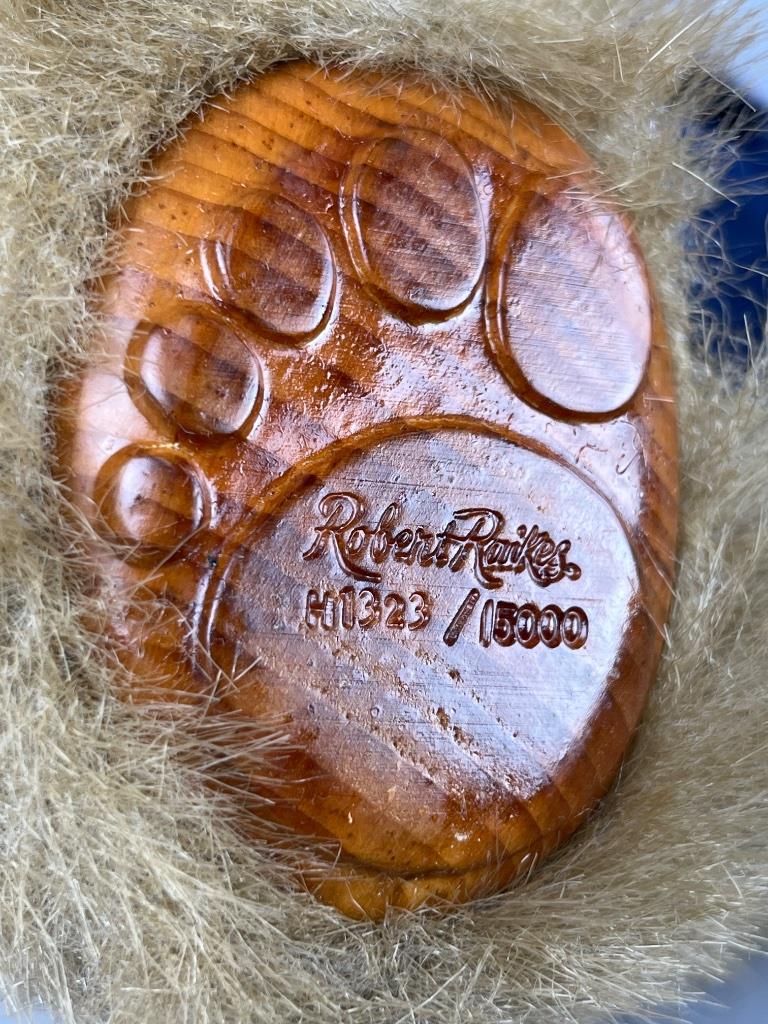 Robert Raikes Bears ‘Graduation Bear’ Limited Edition #5455, serial number H1323 out of 5000. This collectible bear features a hand-carved wooden face and paws crafted by Robert Raikes, known for his distinctive artistry. The bear is dressed in a sailor-themed navy blue outfit with white accents, showcasing fine tailoring and adorned with ‘Raikes Bears’ embroidery on the sleeves. Included with the bear are original brochures detailing Raikes Bears’ legacy, along with a branded storage box featuring graphics of Mt. Shasta, where Raikes Bears originated. The box measures 16 inches in height, suitable for storage and display.