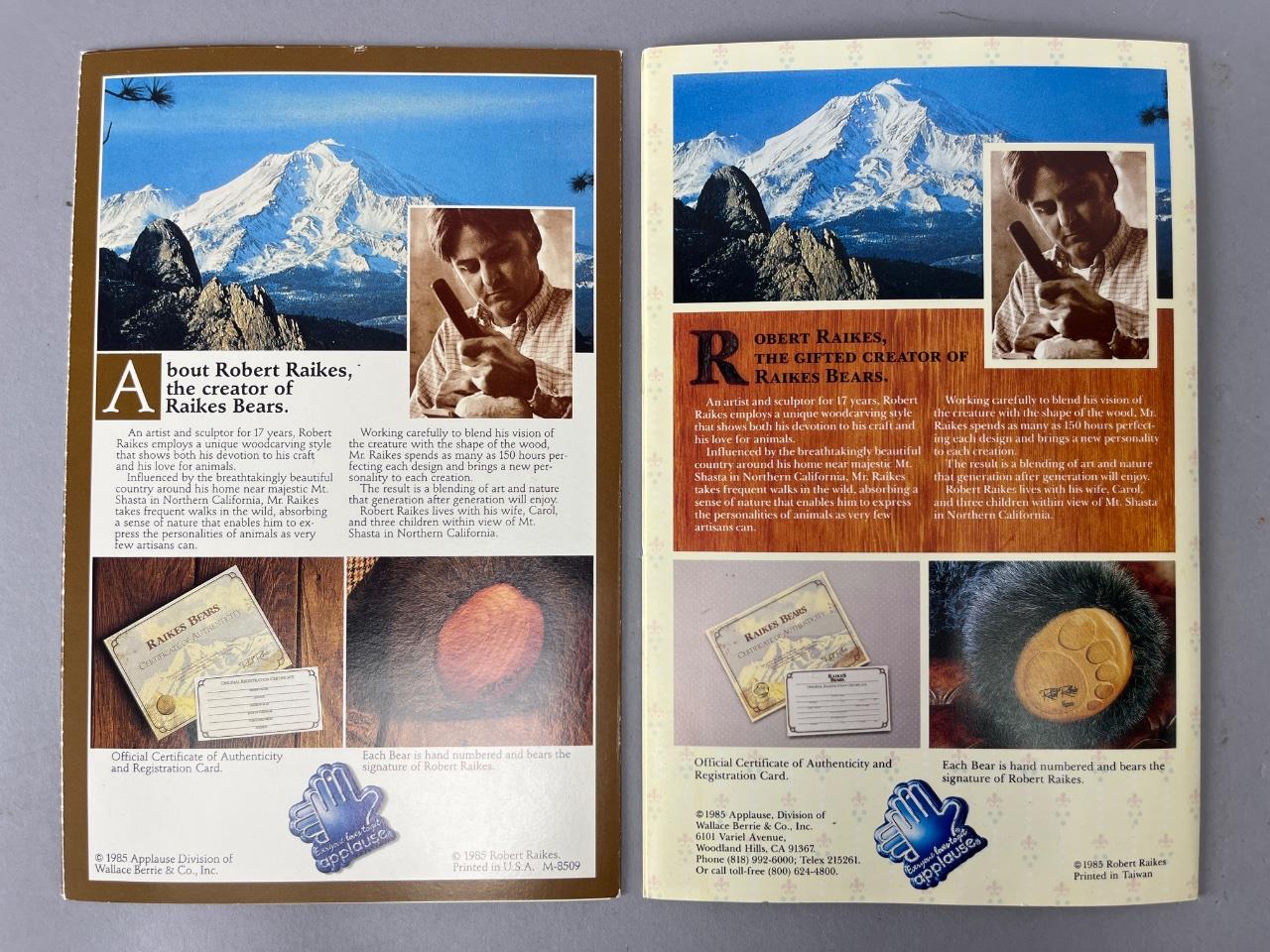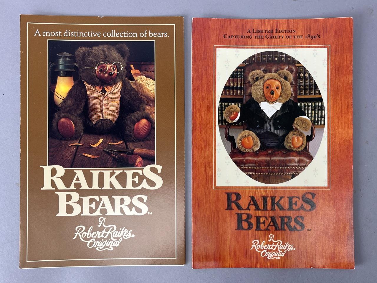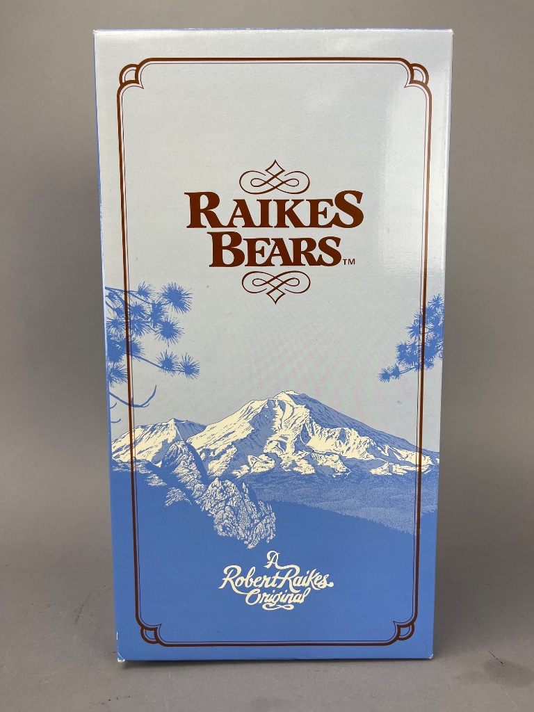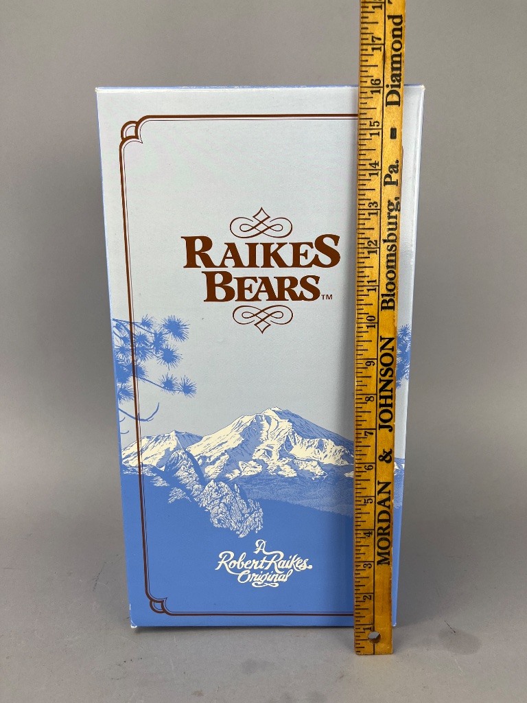 CONDITION: The bear presents in very good condition with no visible damage to its wooden features or fabric attire. Some minor signs of handling are apparent on the box and brochures, with slight corner wear on the printed materials. The outfit is intact, with buttons and embroidery showing no significant wear or fraying. The included brochures and box show minor aging consistent with storage, but remain structurally sound and visually vibrant. Overall, an excellent example of a limited edition Raikes collectible bear.