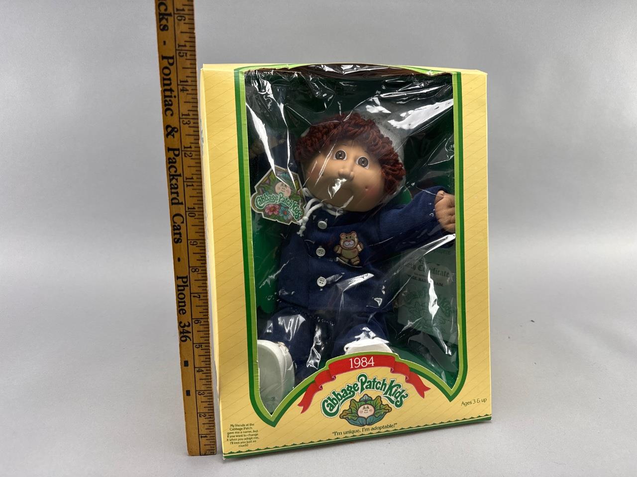 1984 Coleco Cabbage Patch Kid doll, approximately 15 inches tall, featuring red yarn hair, blue outfit with embroidered detail, and original adoption birth certificate for ‘Rose Barthram.’ Comes in original retail box with clear display window.