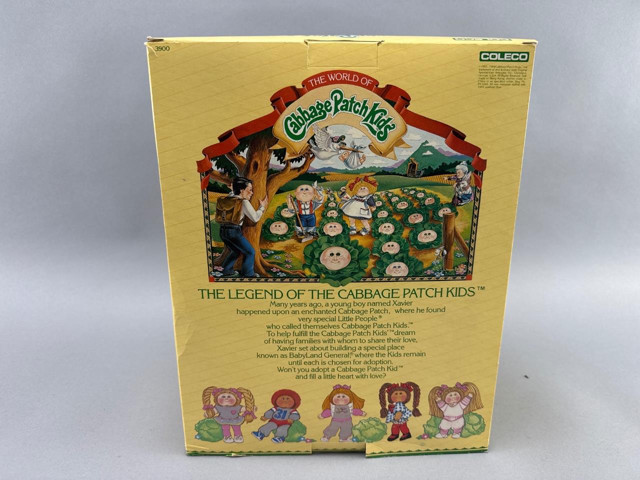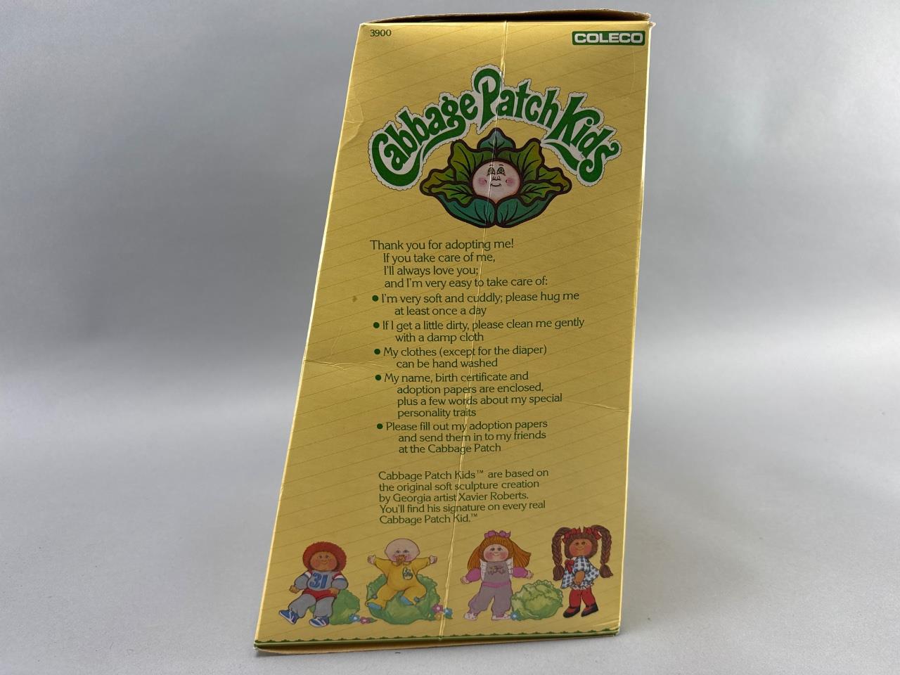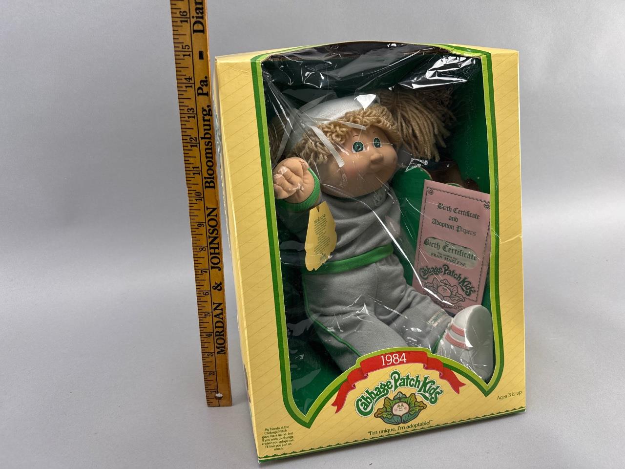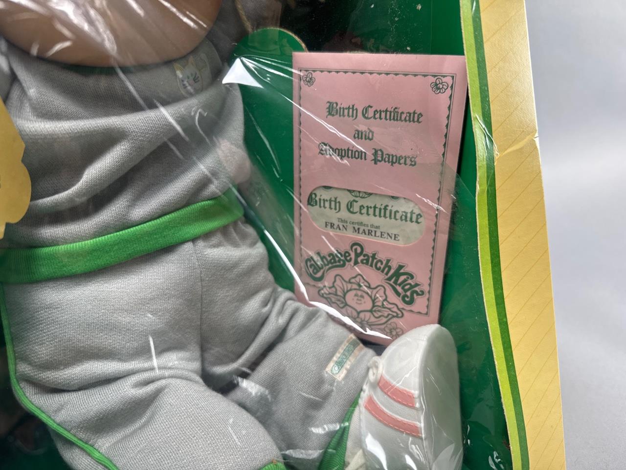 1984 Cabbage Patch Kids doll by Coleco, original packaging with included birth certificate and adoption papers certifying ‘Fran Marlene.’ The doll features yarn hair, a soft body, and a gray outfit with green trim and white shoes. Box dimensions approximately 15 inches tall, sealed and intact.