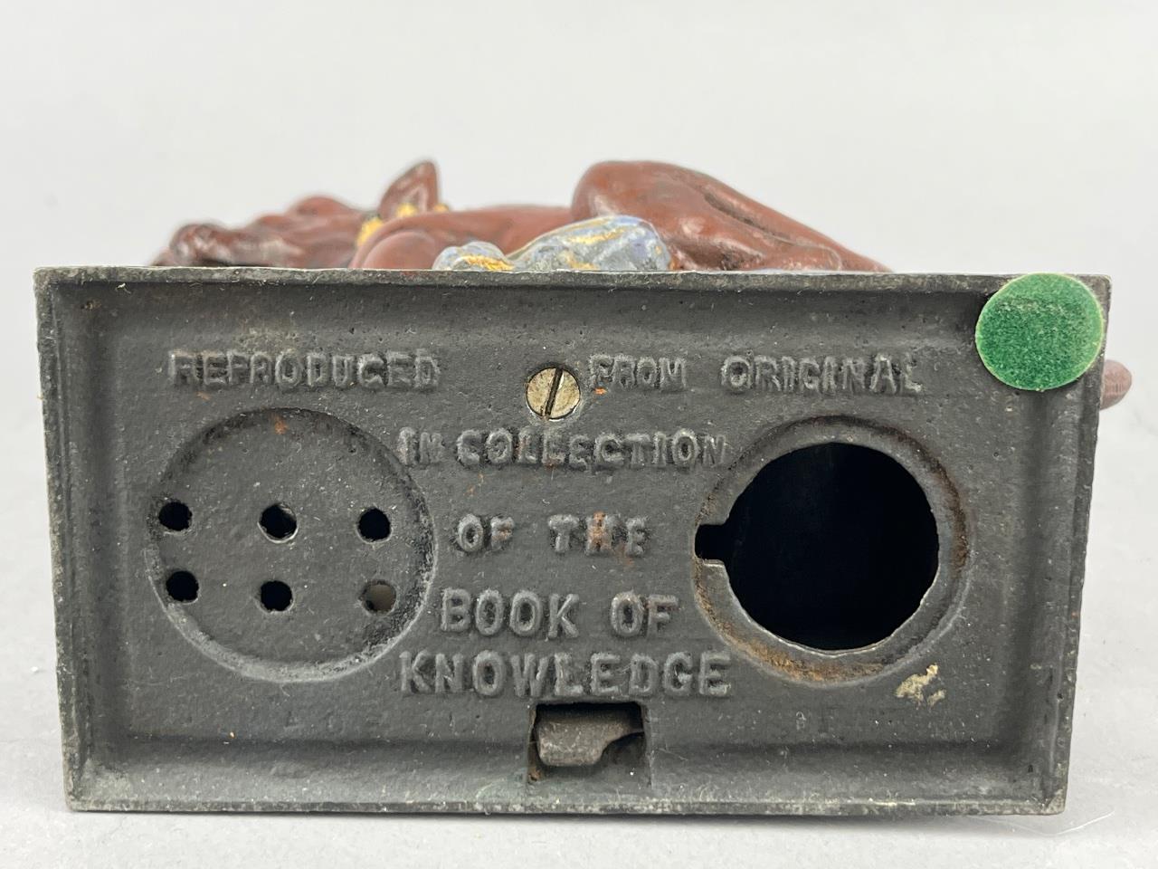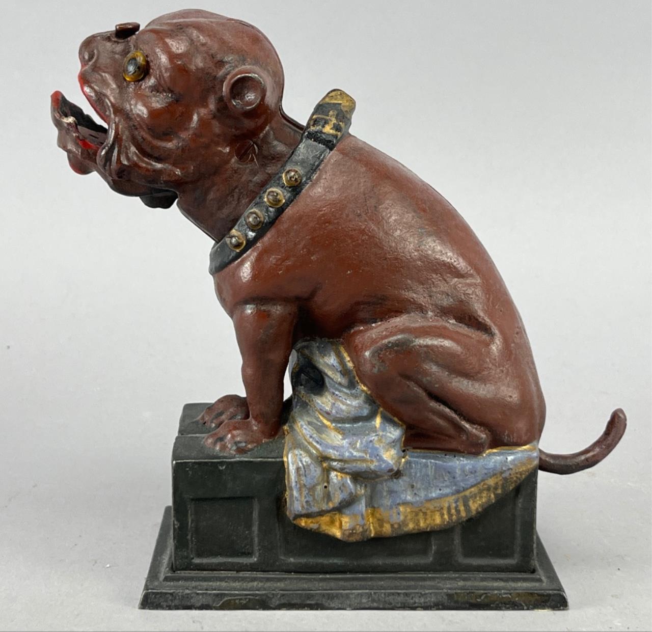Cast iron mechanical bank depicting a bull dog seated on a base labeled ‘BULL DOG BANK.’ Features painted details including a studded collar, red mouth accents, and draped cloth motif. Base underside is marked ‘Reproduced from Original in Collection of the Book of Knowledge.’ Approximately 7 inches in height.