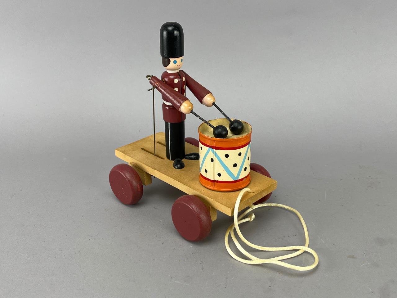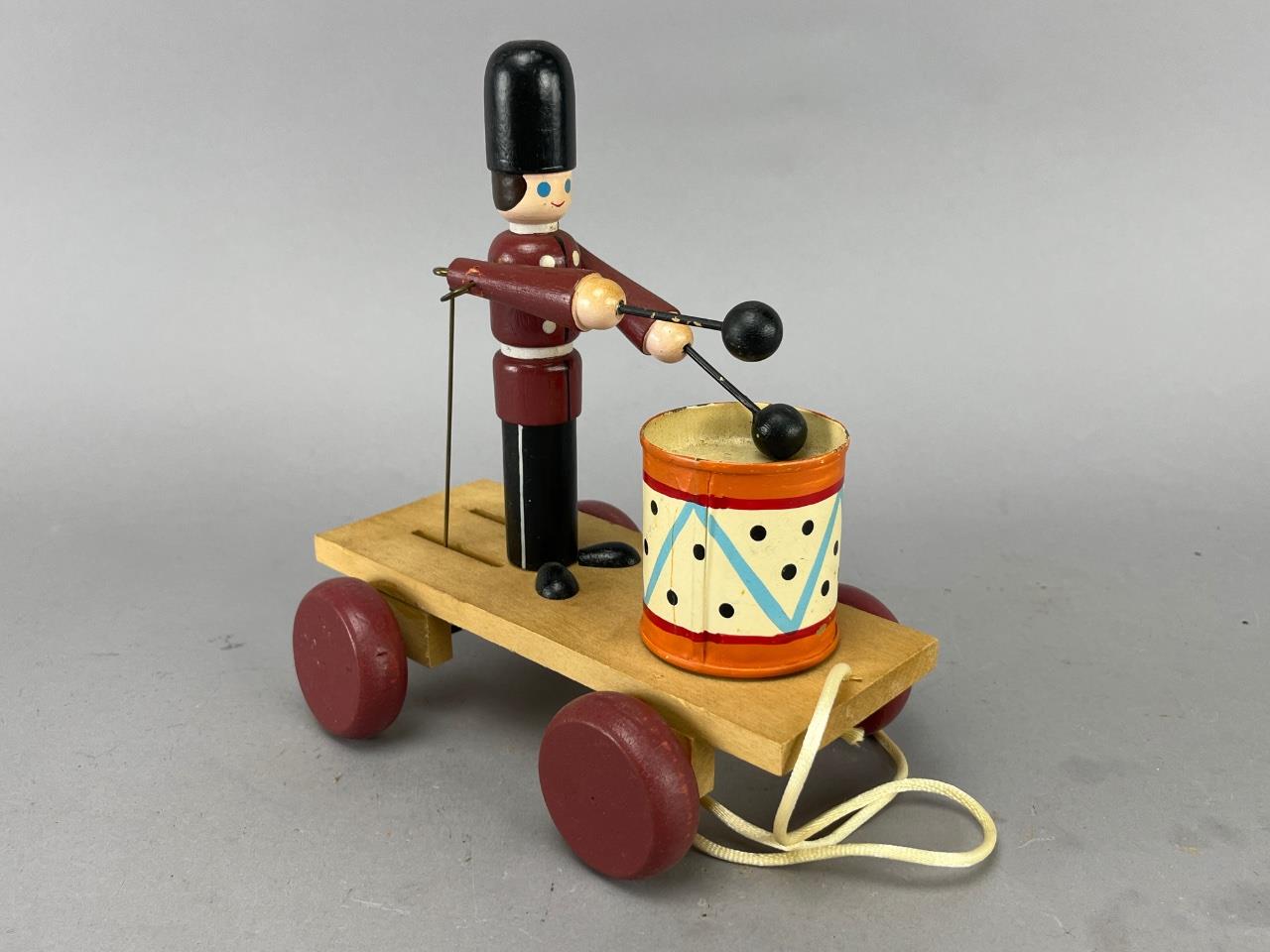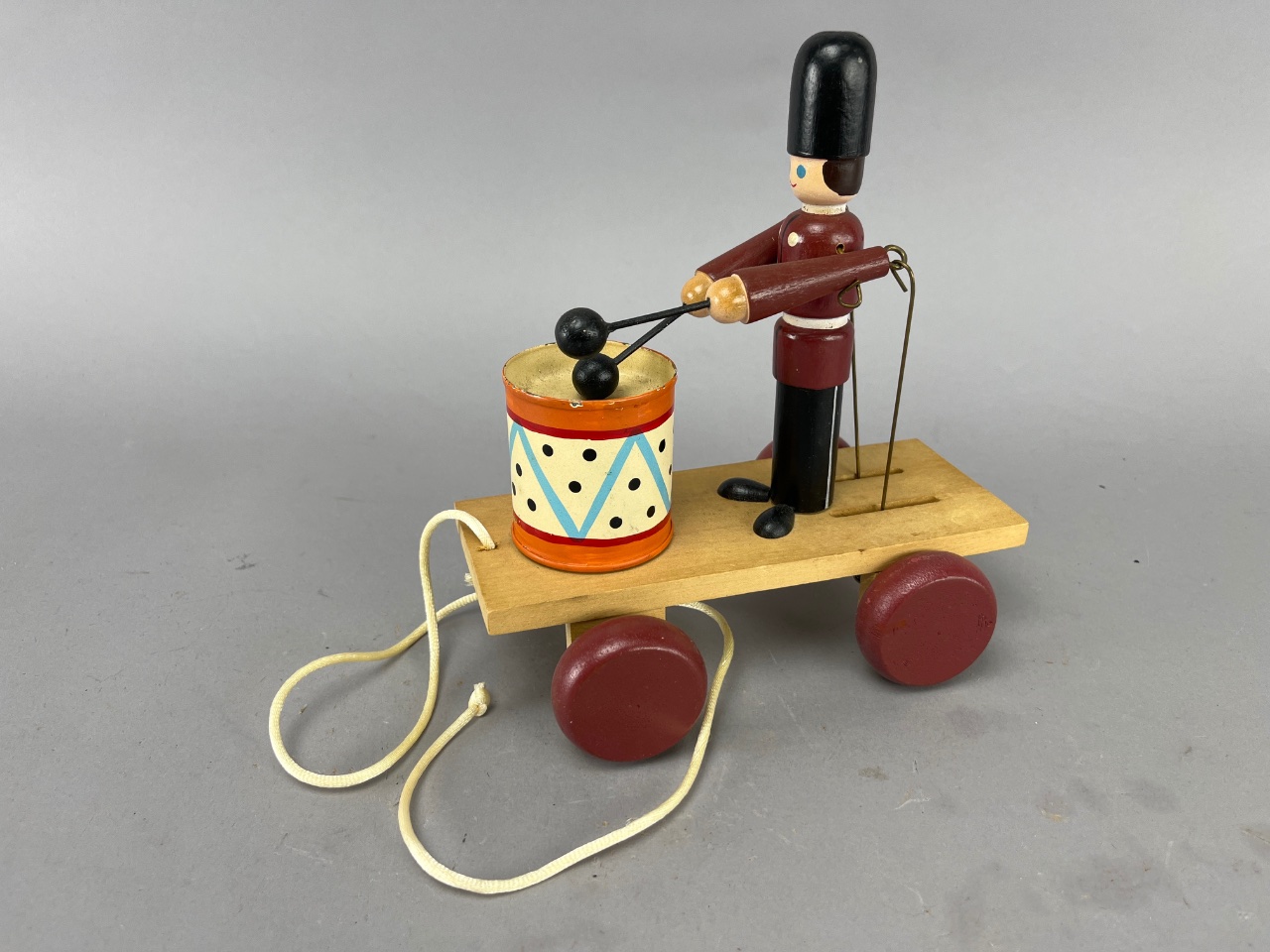 Vintage wooden pull toy featuring a marching soldier figure with articulated arms striking a colorful drum. The toy includes a wooden cart with red wheels and a pull cord. Painted details include the soldier’s uniform and drum with geometric designs.