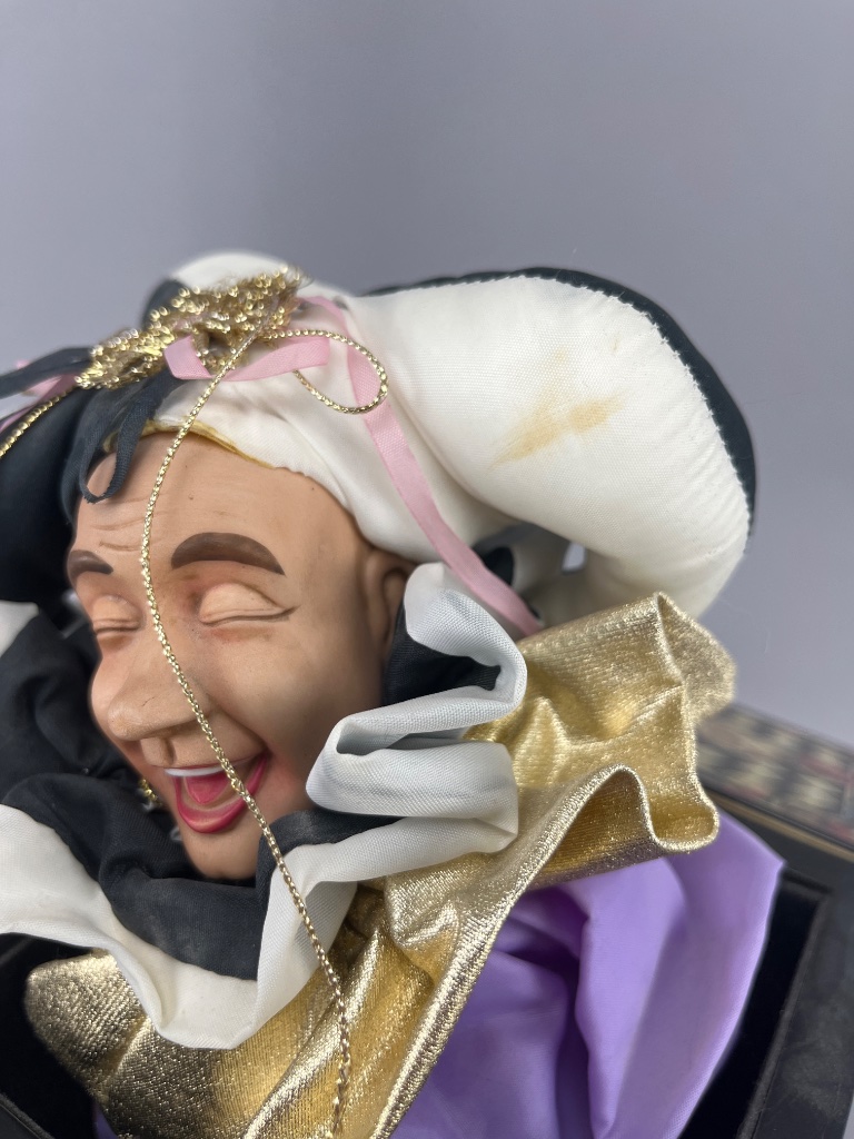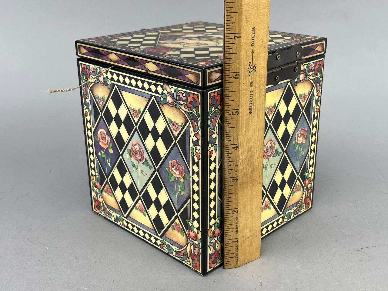 Decorative box featuring colorful harlequin and rose motifs on all sides, accented with intricate floral designs and checkerboard patterns. Includes a hinged lid and a cloth doll inside adorned with golden, white, black, and purple fabrics. Approximately 7 inches tall.