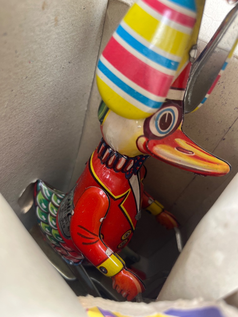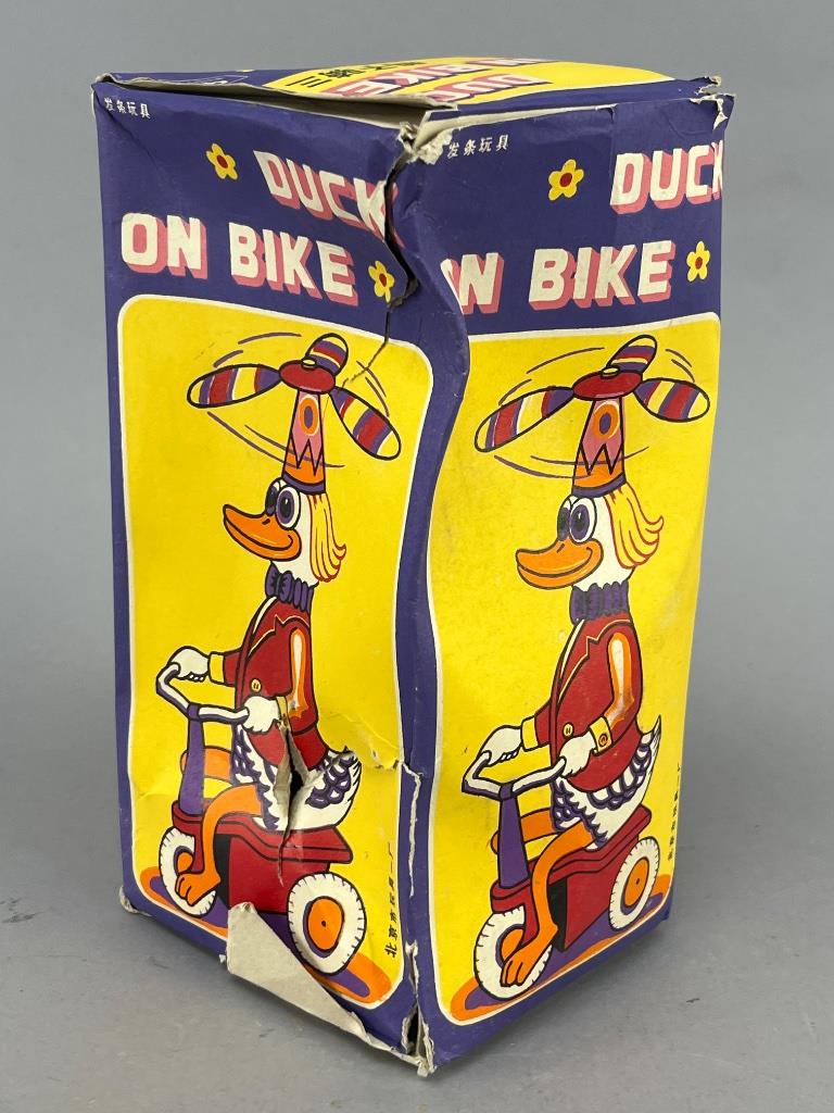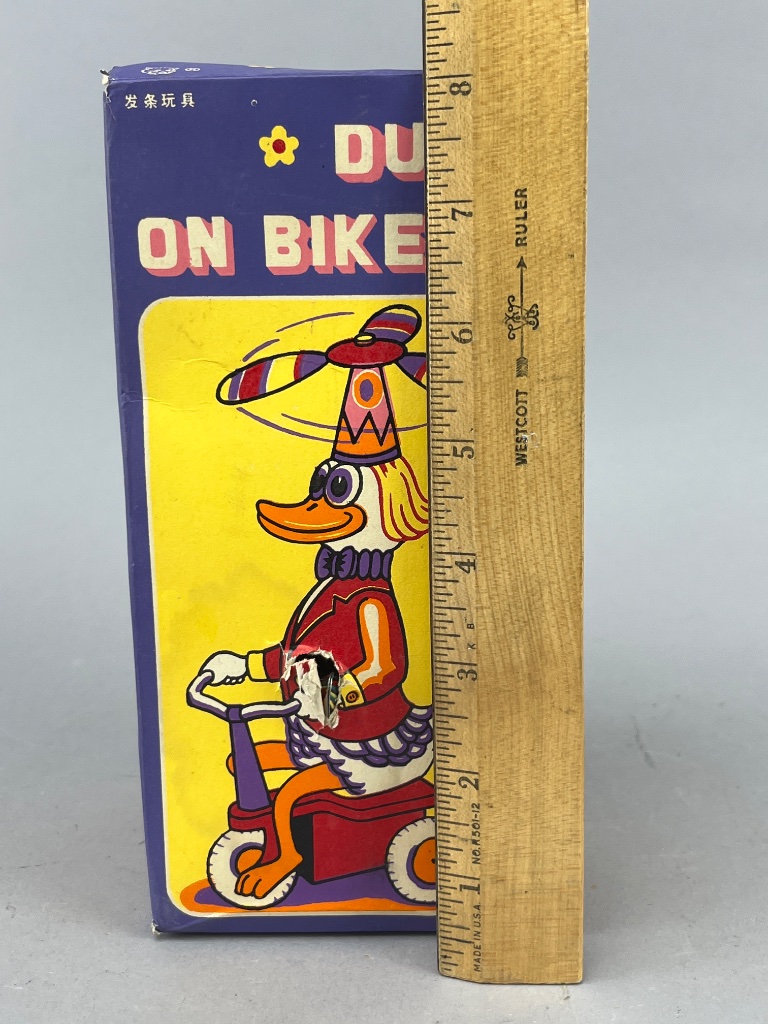 Vintage tin toy wind-up ‘Duck on Bike,’ brightly painted in vibrant colors with a whimsical design. Includes original cardboard box featuring bold cartoon artwork with matching graphic elements. Toy box measures 8 inches high based on visible scale.