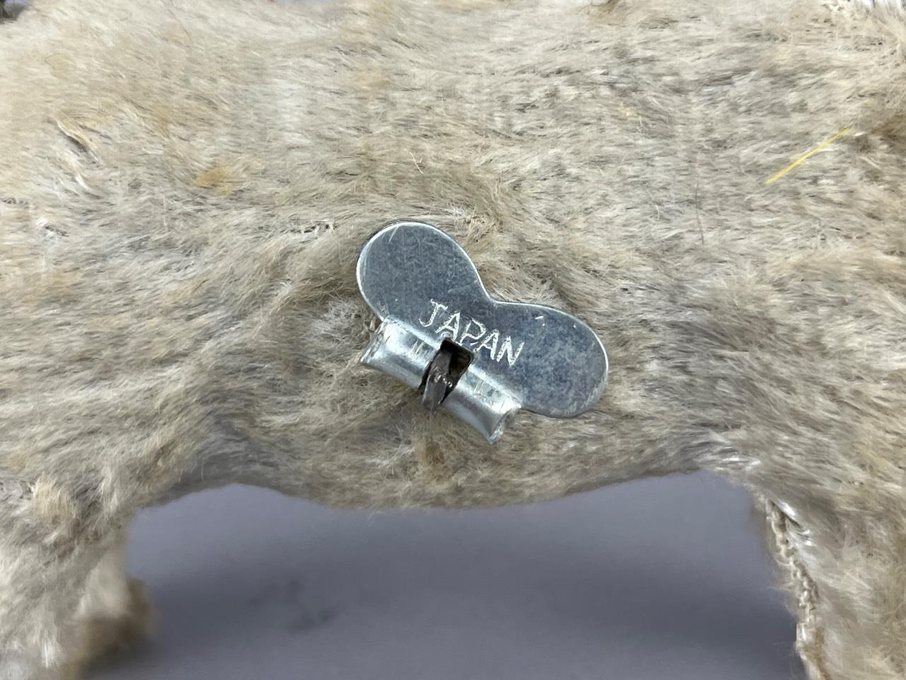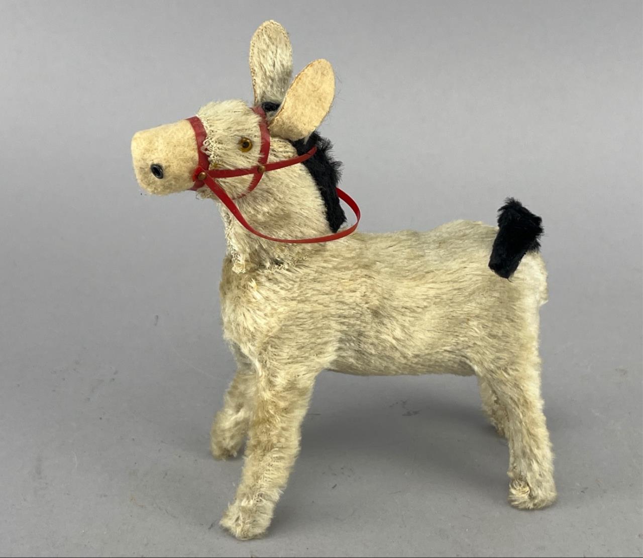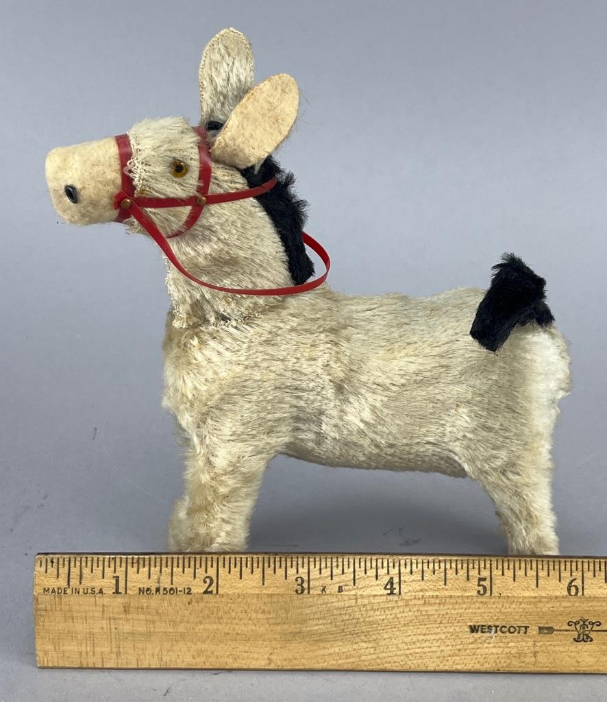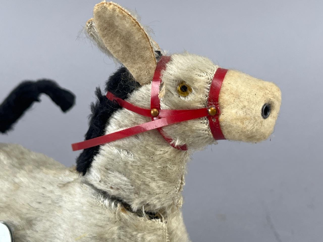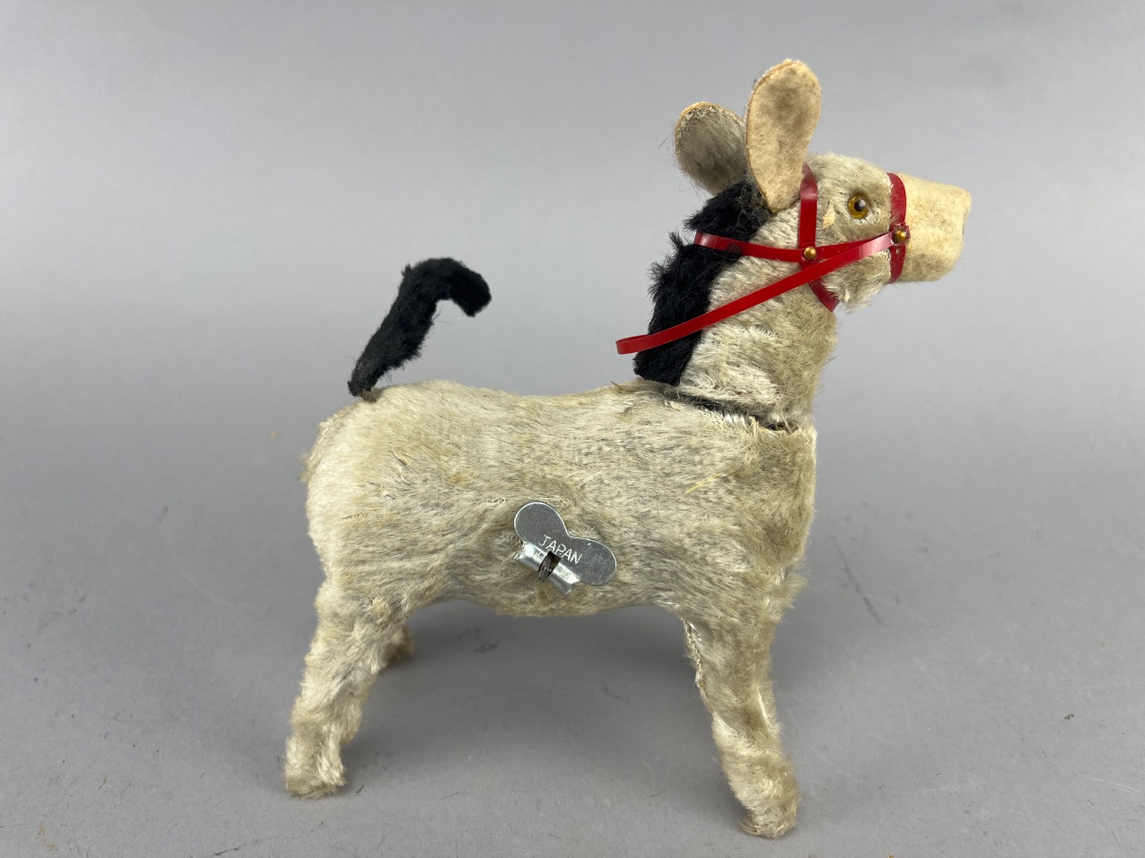 Vintage wind-up donkey toy, marked ‘Japan’, with fabric fur covering, glass eyes, and a red plastic harness. The wind-up mechanism rotates the tail. Donkey measures 6 inches in length from nose to tail.