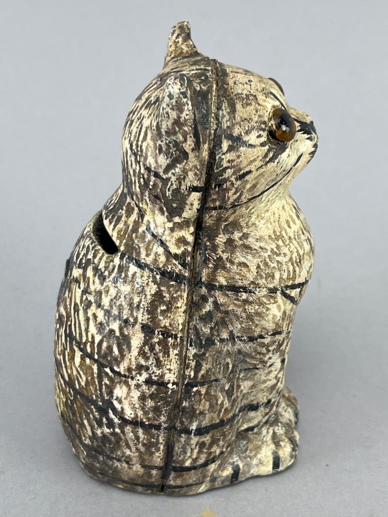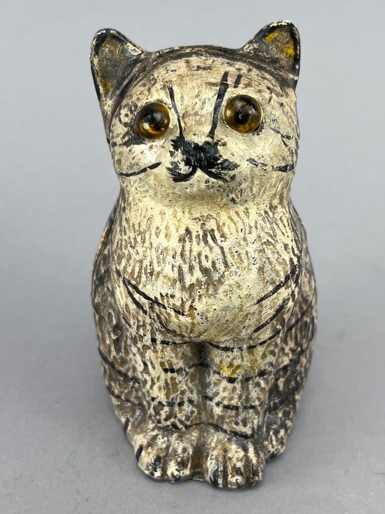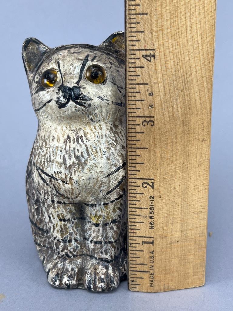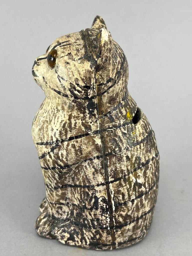 Vintage cast iron cat-form still bank, painted finish with detailed stripe markings and glass eyes. Measures about 4 inches tall and features a coin slot on the back. Hand-painted detailing suggests early 20th-century craftsmanship.