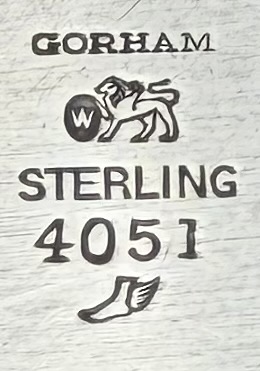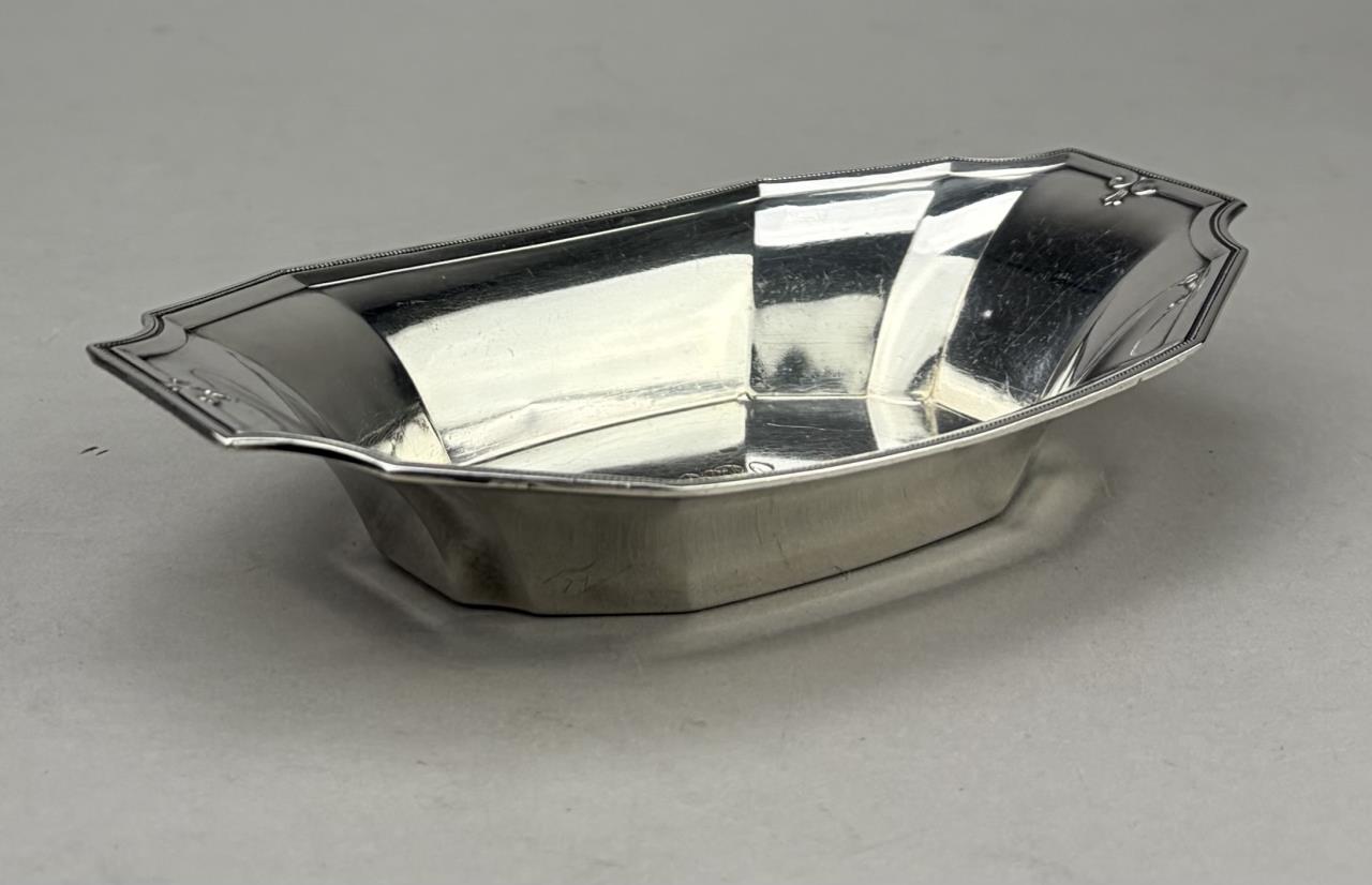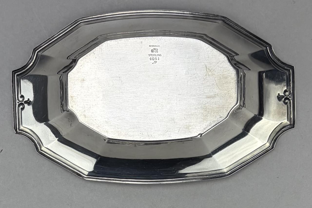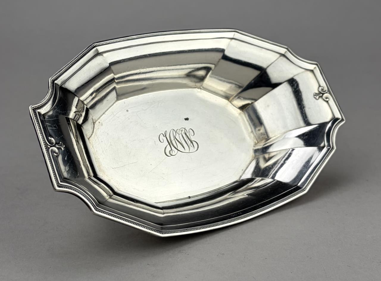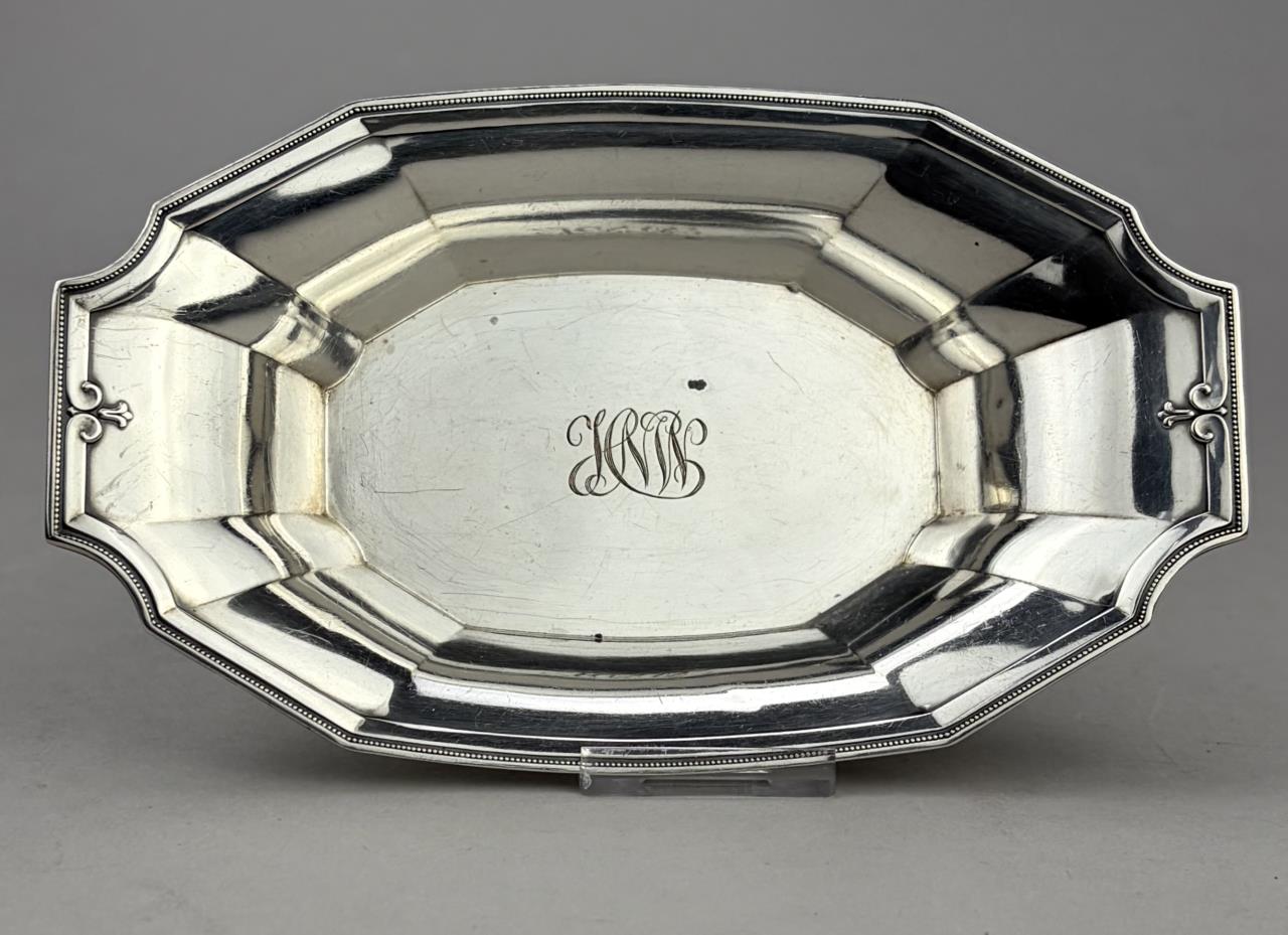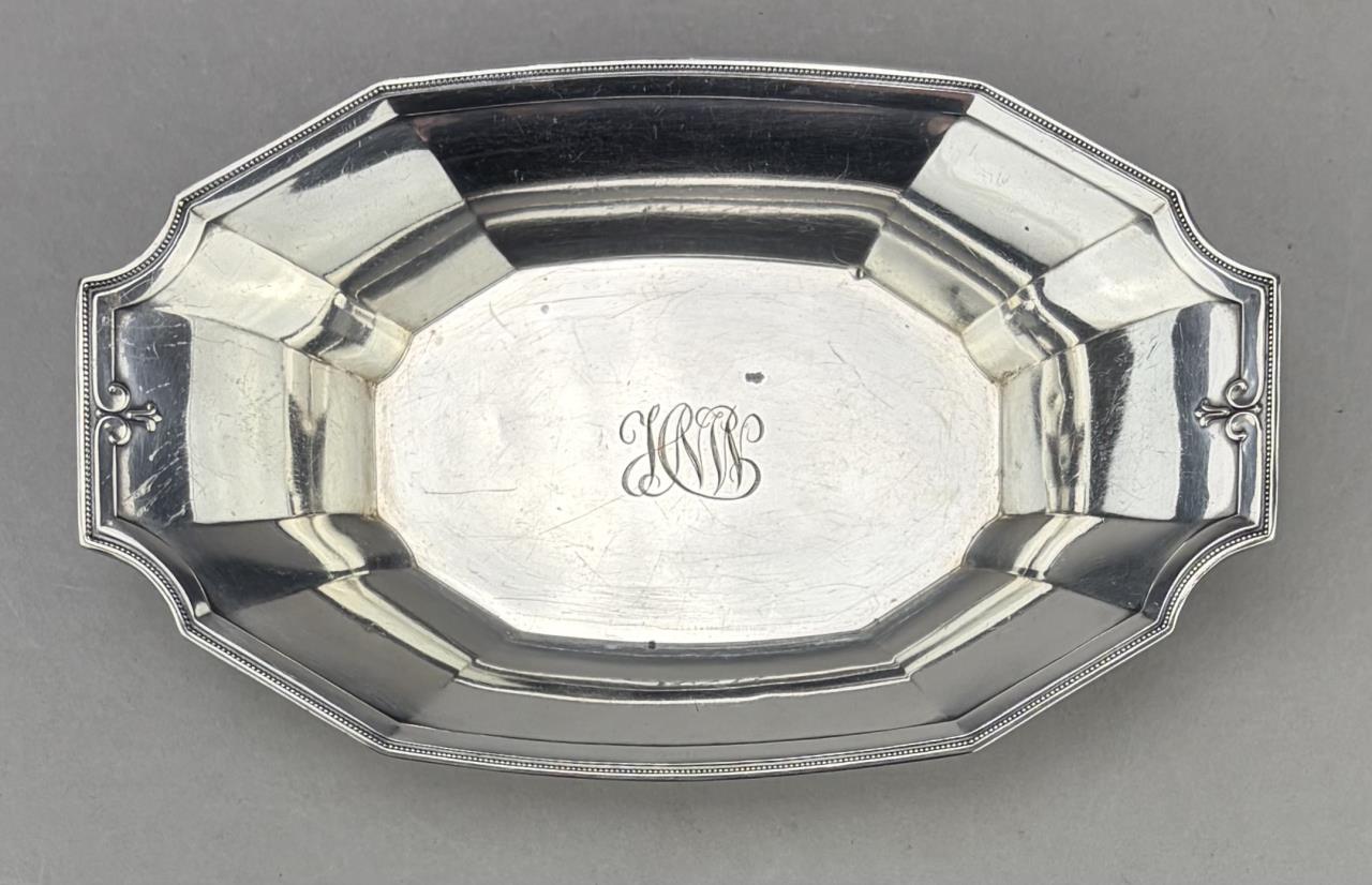 Gorham Manufacturing Company (Providence, Rhode Island) sterling silver Bon Bon, nut, or candy dish (#4051), in the “King Albert” pattern, marked on bottom, monogrammed, early 20th Century, 7″ (L), 98 grams.