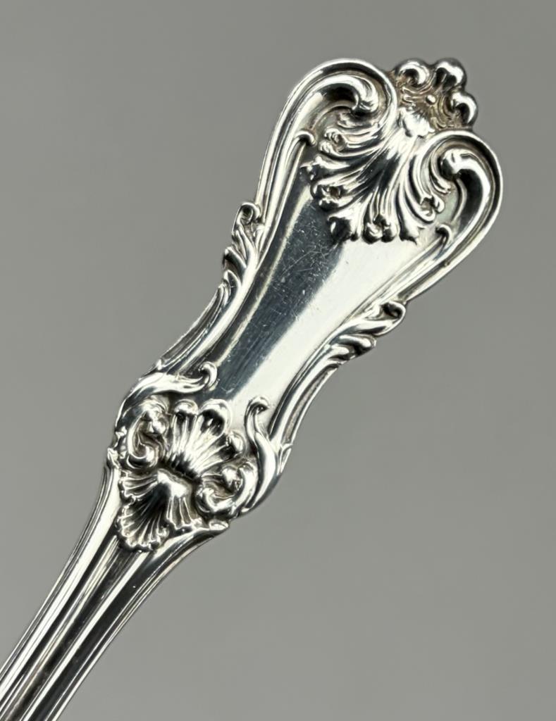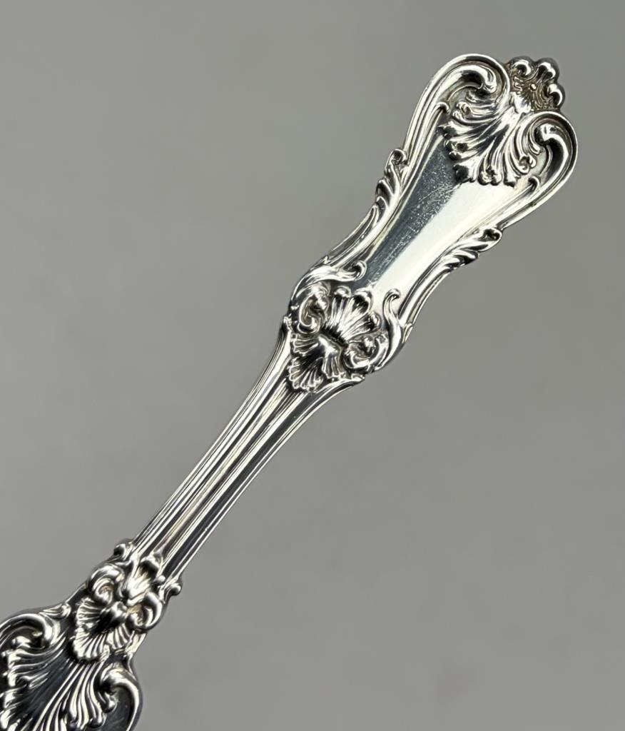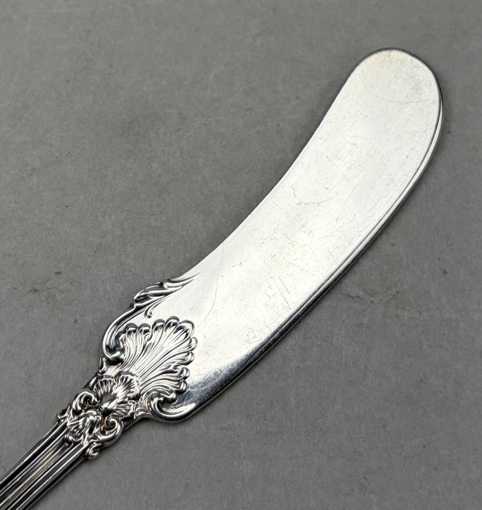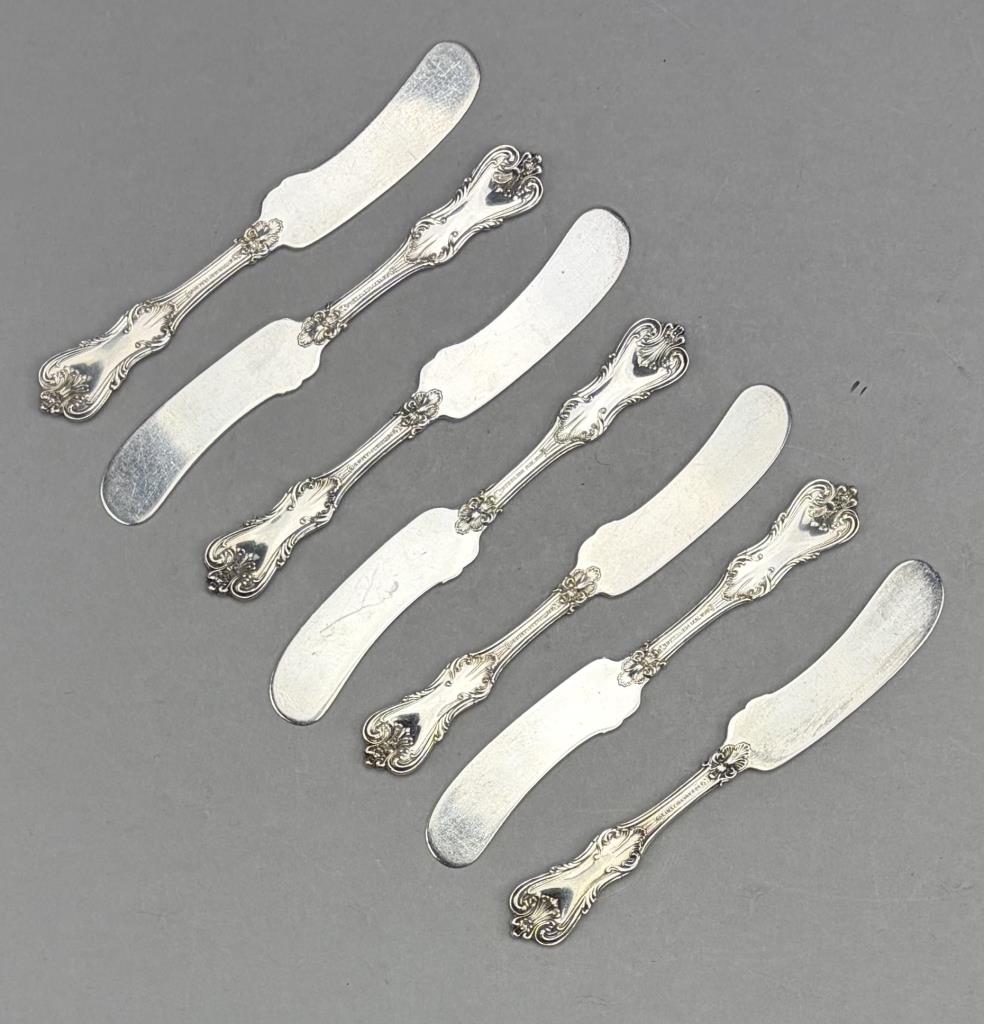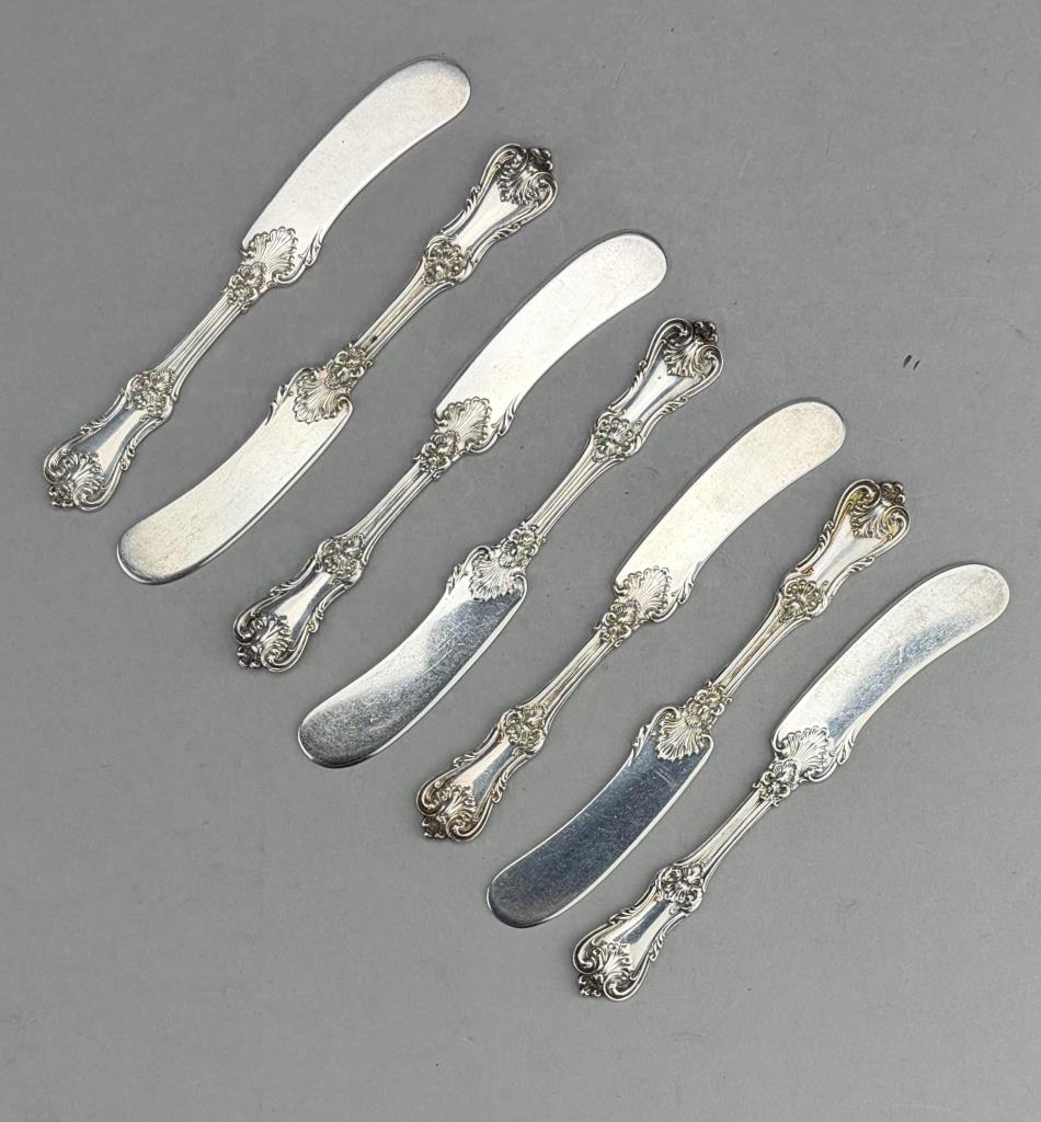 Seven Frank W. Smith Silver Company (Gardner, Massachusetts), solid flat handle butter spreaders, in the “Federal Cotillion” pattern, 5-5/8″ each. Approximate total weight is 206 grams.