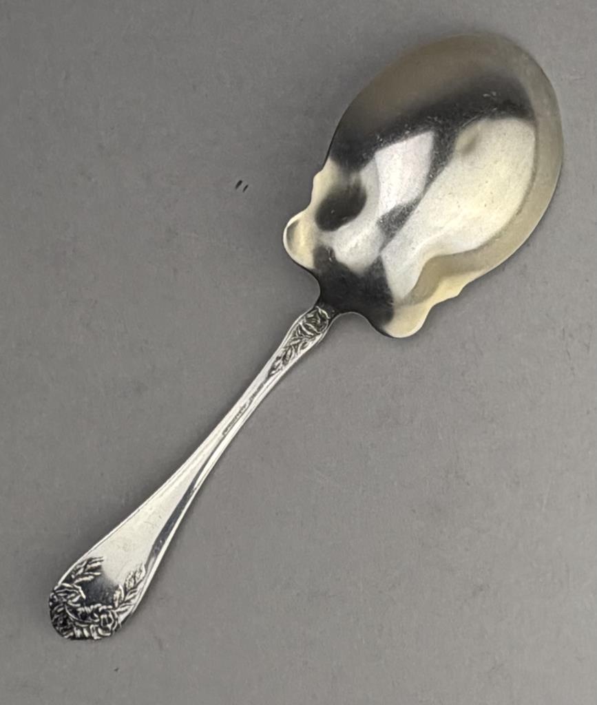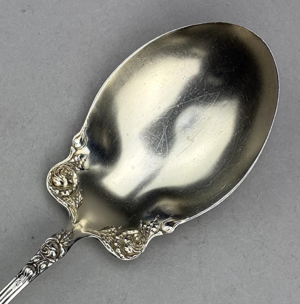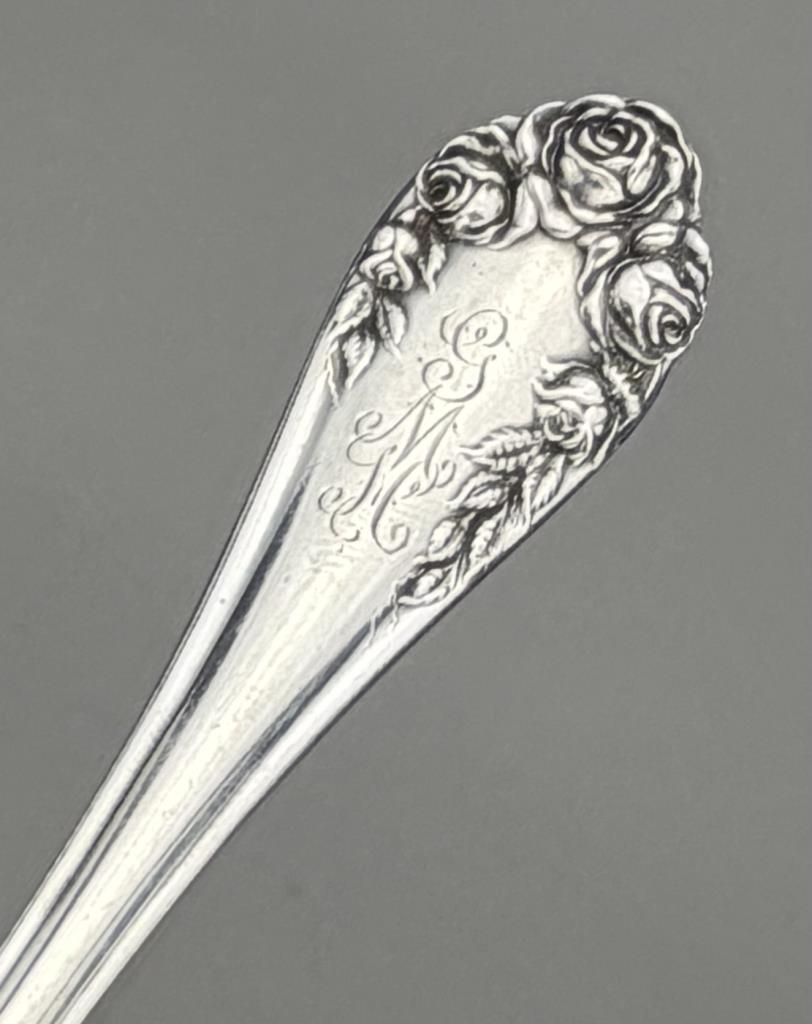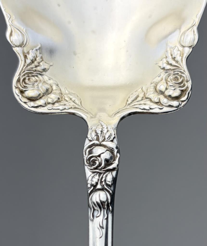 Wallace Silver Company (Wallingford, Connecticut) sterling berry or casserole spoon, with gold vermeil on the basin, in the “Rose” pattern, introduced in 1898, 9-1/4″. Approximate total weight is 89 grams.