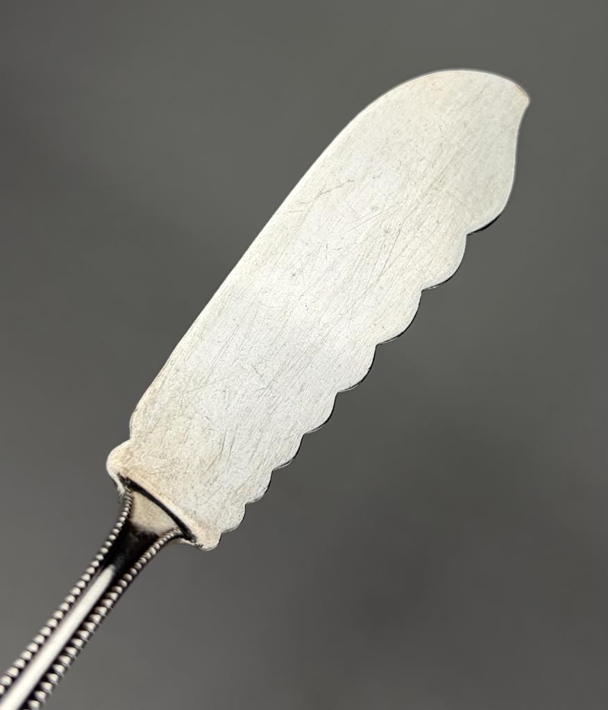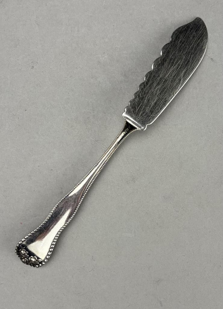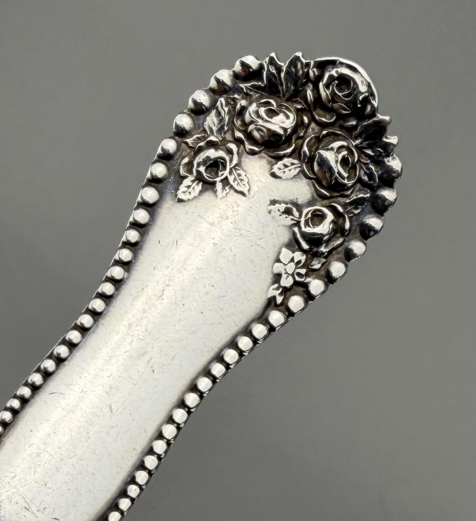 Gorham Manufacturing Company (Providence, Rhode Island) sterling silver butter knife, in the “Lancaster Rose” pattern, which was introduced in 1897, 7-1/2″. Approximate total weight is 36 grams.