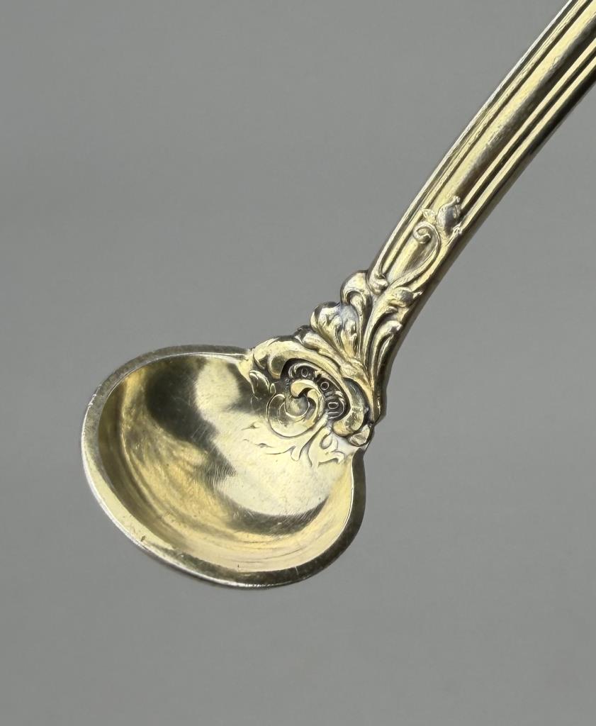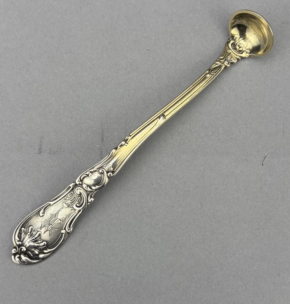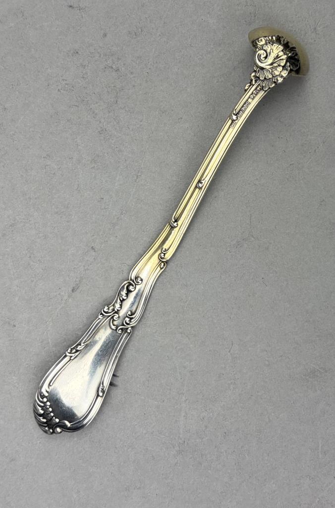 Gorham Manufacturing Company (Providence, Rhode Island) sterling silver and gold vermeil mustard spoon, in the “Hanover” pattern, which was introduced in 1895, 4-7/8″. Approximate total weight is 17 grams.