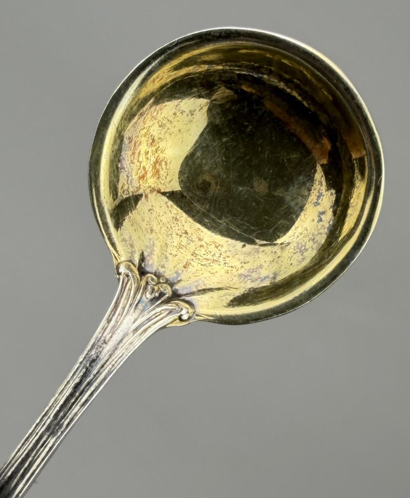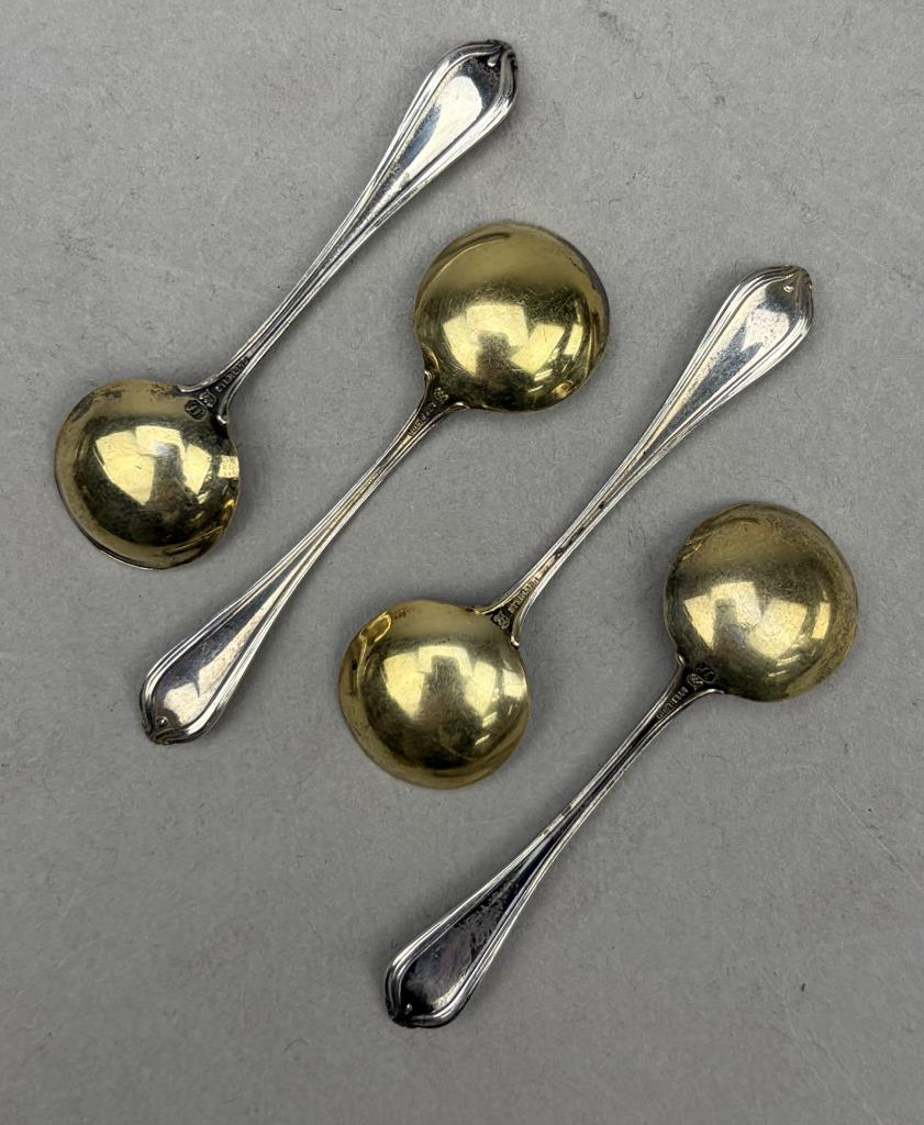 Set of four Towle Manufacturing Company (Newbury, Massachusetts) sterling silver and gold vermeil salt spoons, in the “Paul Revere” pattern, which was introduced in 1906, each 2-3/8″. Approximate total weight is 15 grams.